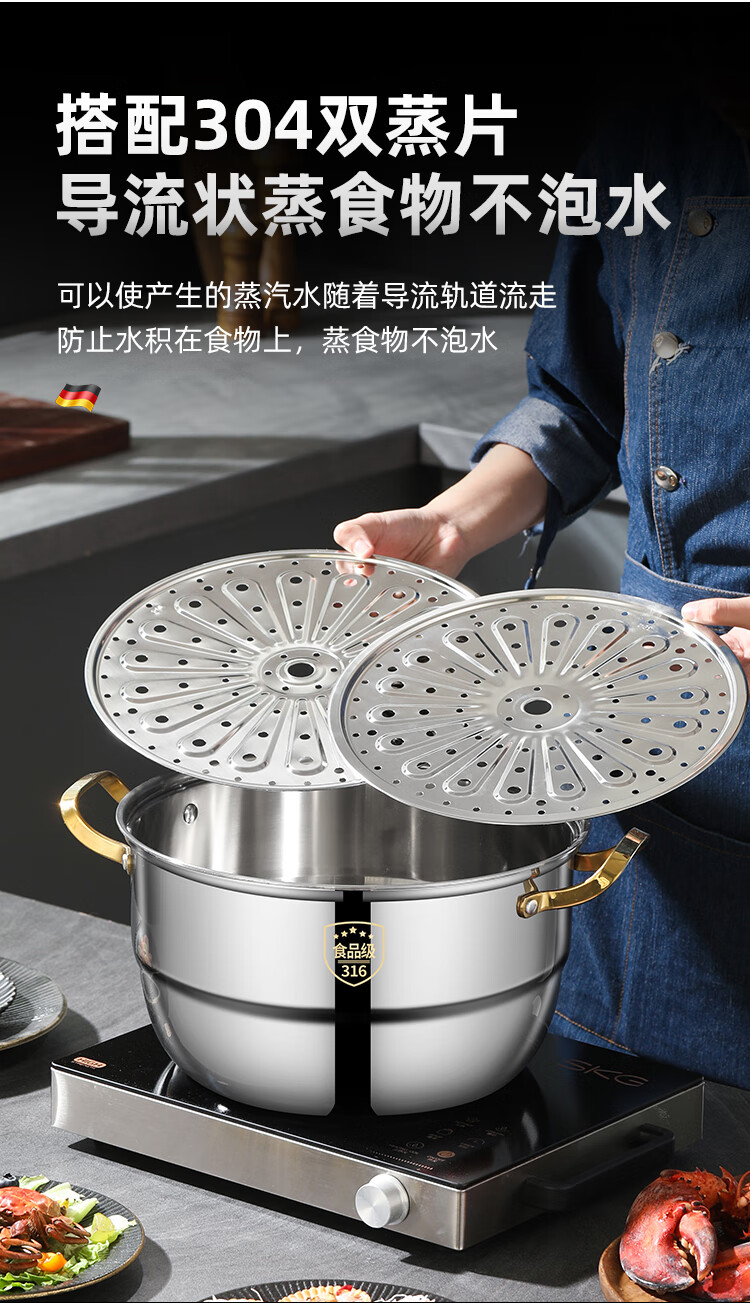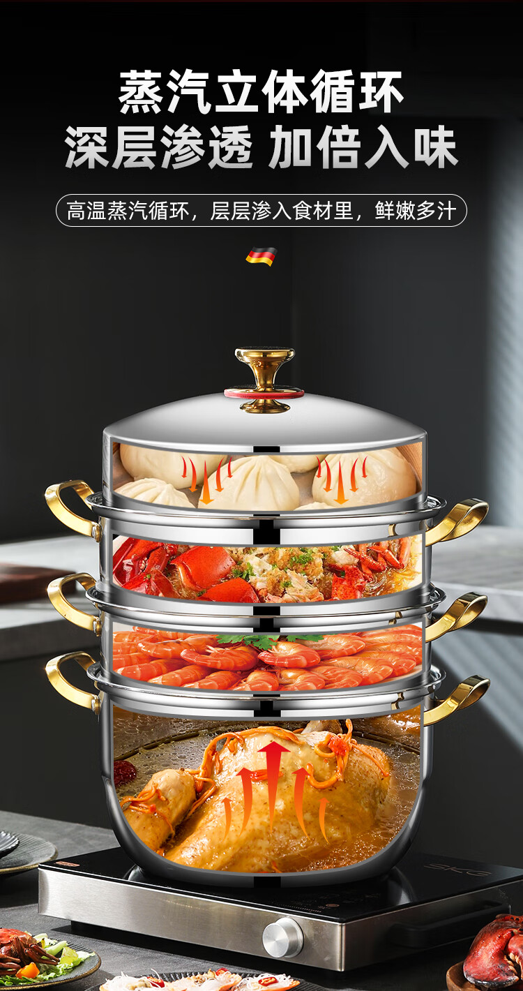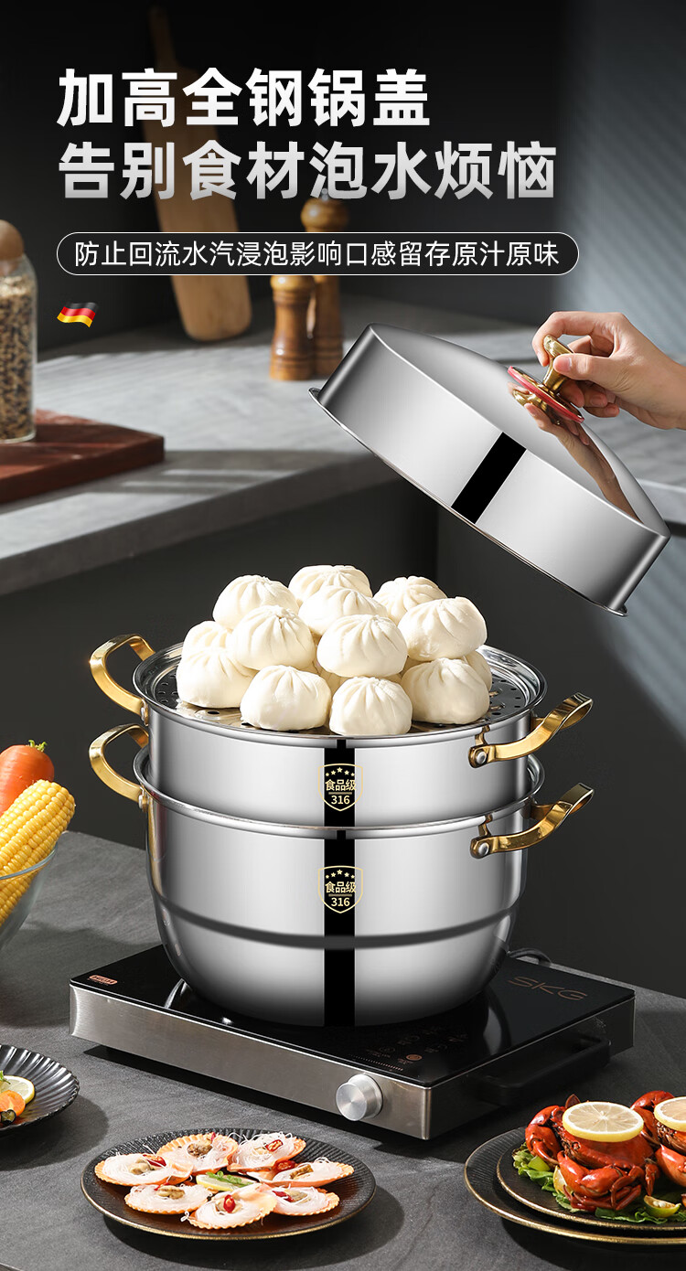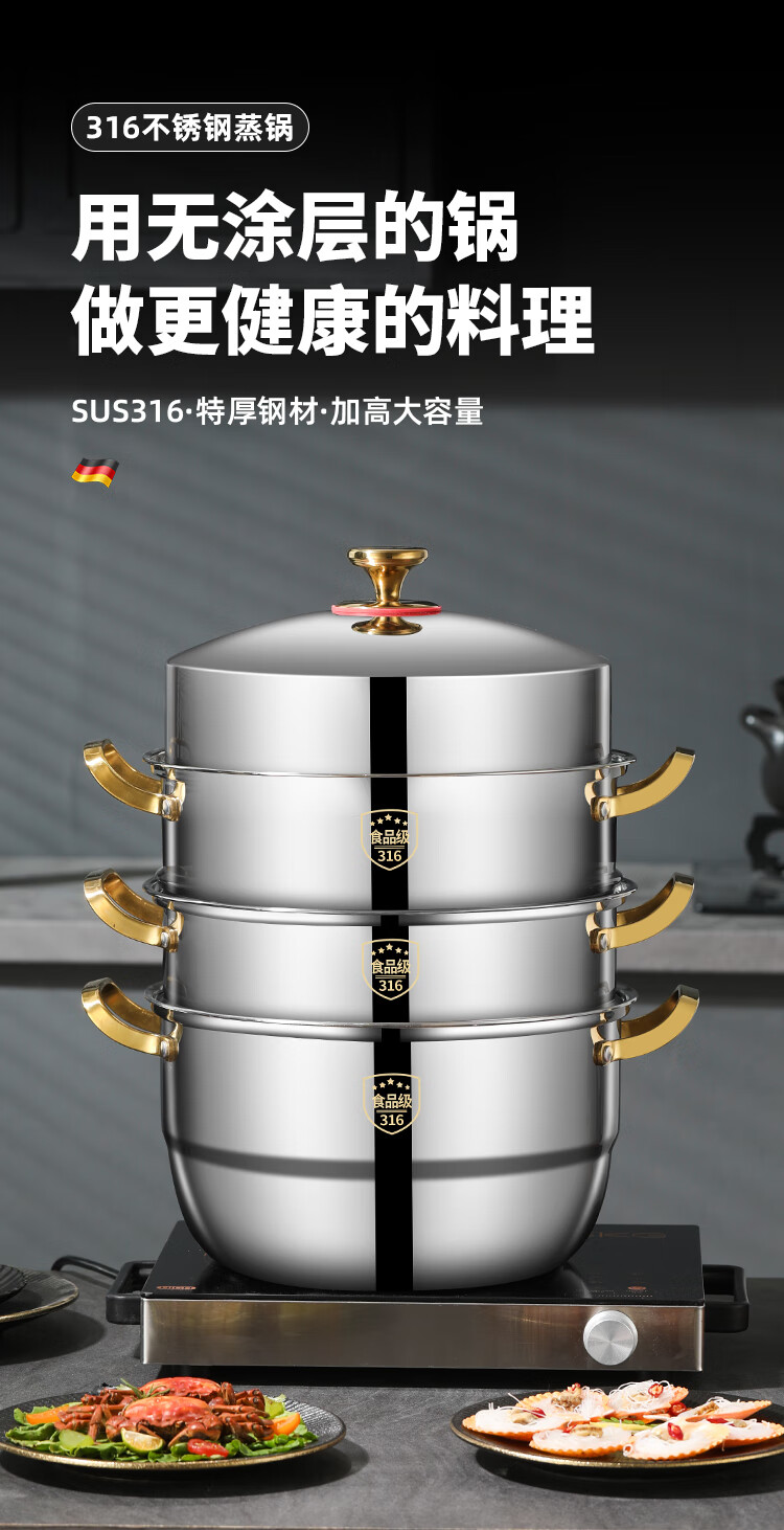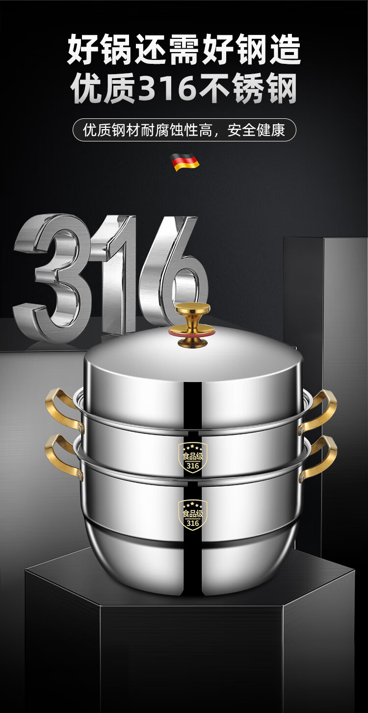 Chef's Extra Thick 316 Stainless Steel Steamer Heightened Household Large Capacity Multi-layer Double-layer Steamer Induction Cooker Gas Stove Universal Three-layer Steamer One-piece 8.1 catties 32cm