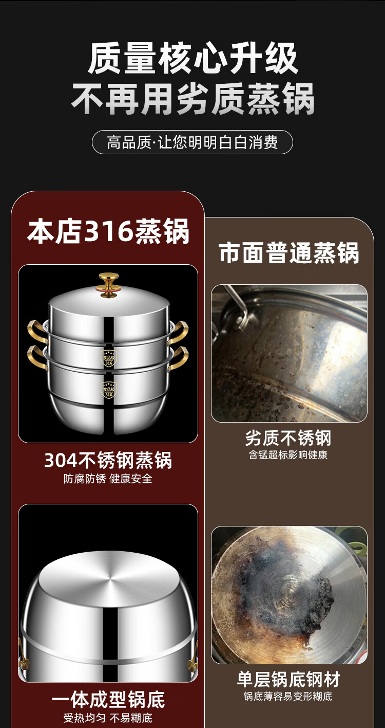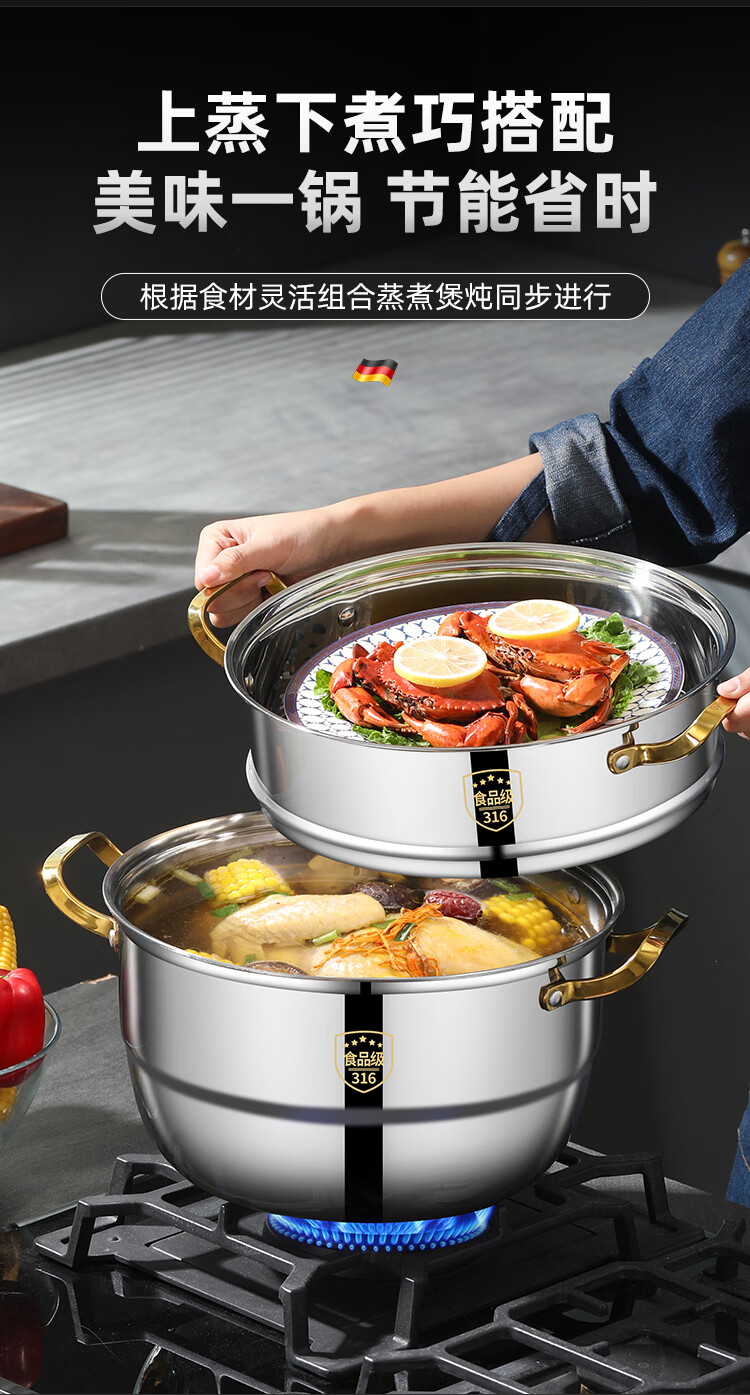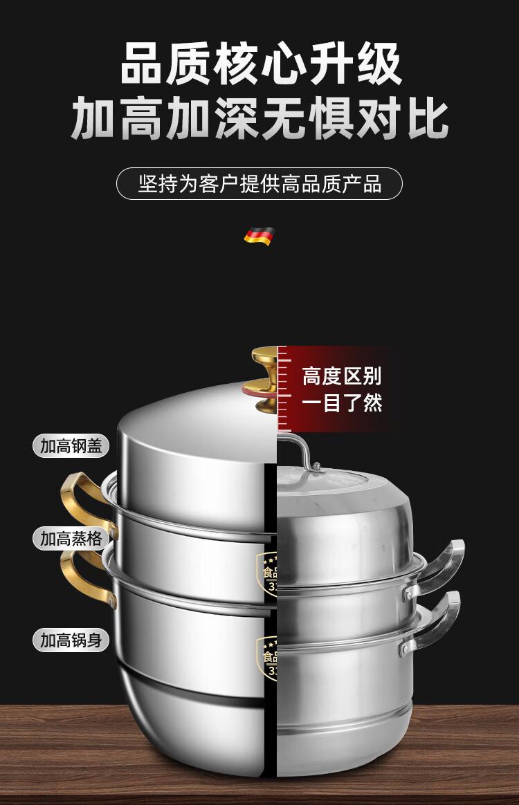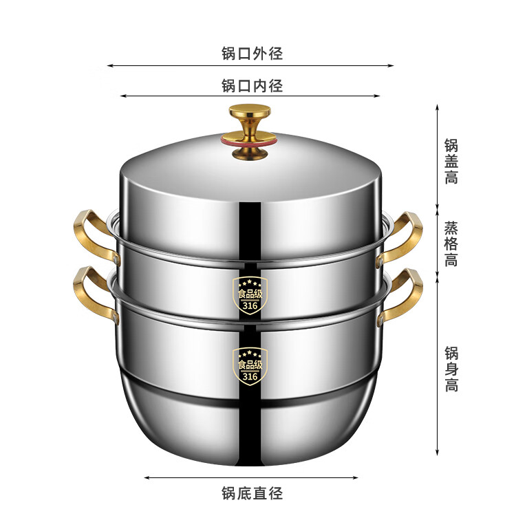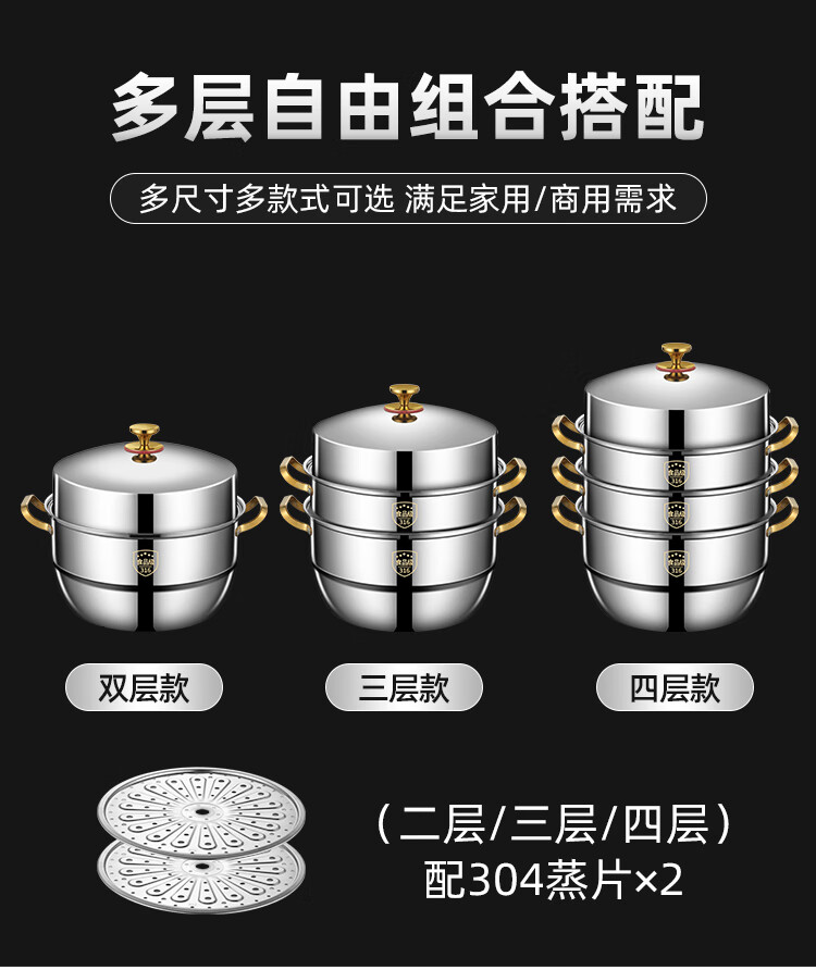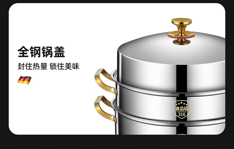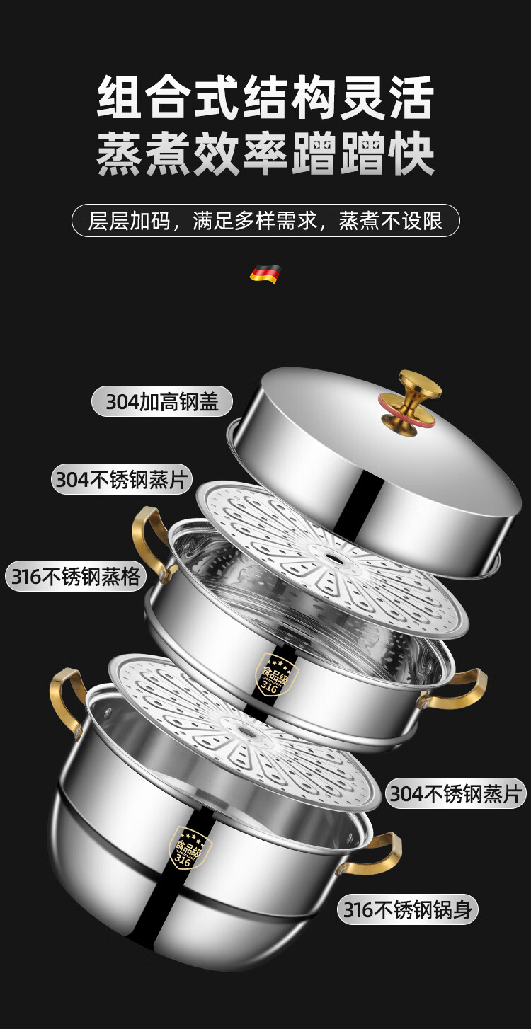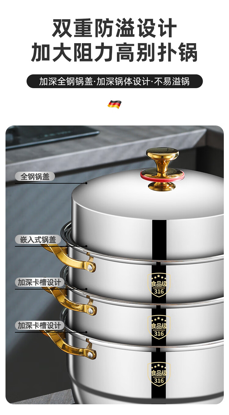 Chef's Extra Thick 316 Stainless Steel Steamer Heightened Household Large Capacity Multi-layer Double-layer Steamer Induction Cooker Gas Stove Universal Three-layer Steamer One-piece 8.1 catties 32cm