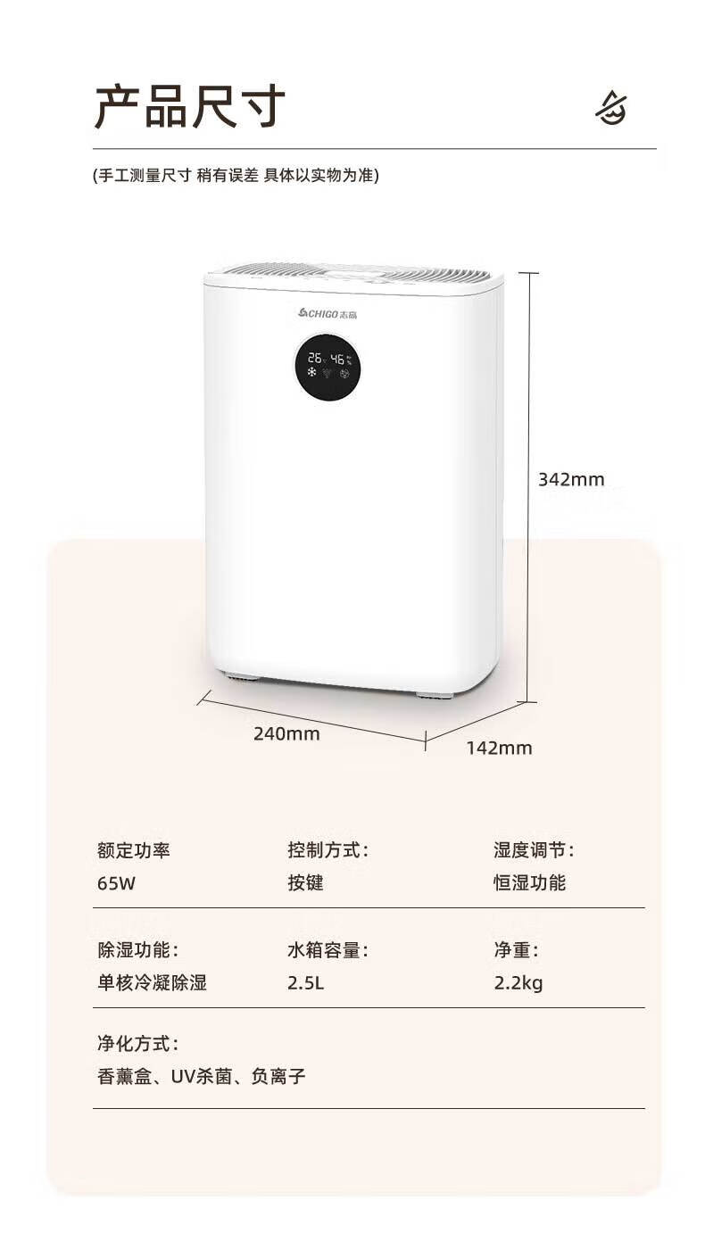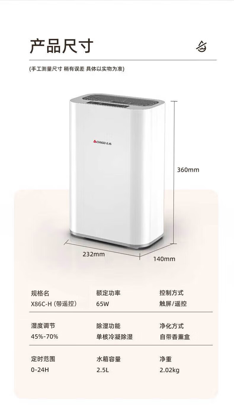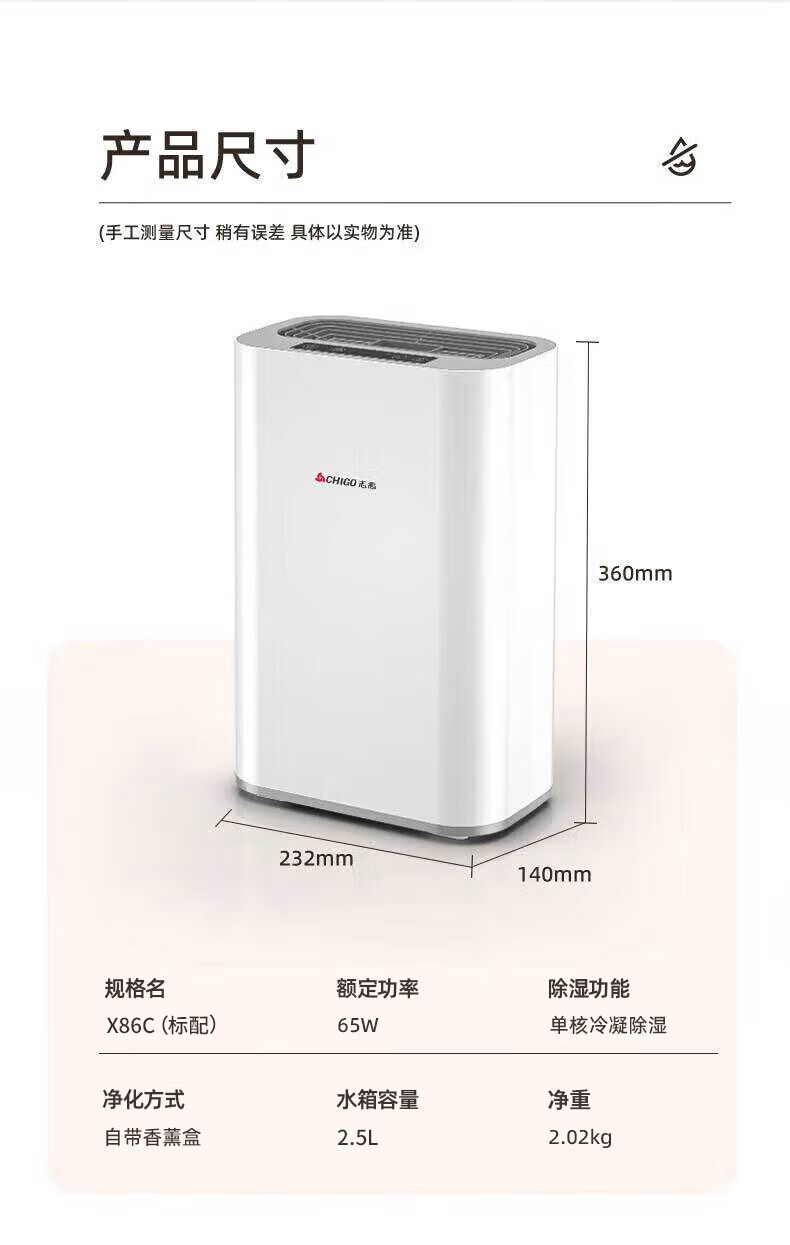 CHIGO Dehumidifier Household Dehumidifier Dehumidifier Bedroom Basement Dryer Moisture Absorption Dehumidification Dehumidification Moisture-proof Hui Nantian Dehumidifier Artifact Purification All-in-one Machine 2L/day Dual Core + Negative Ion + 2.5L Water Tank