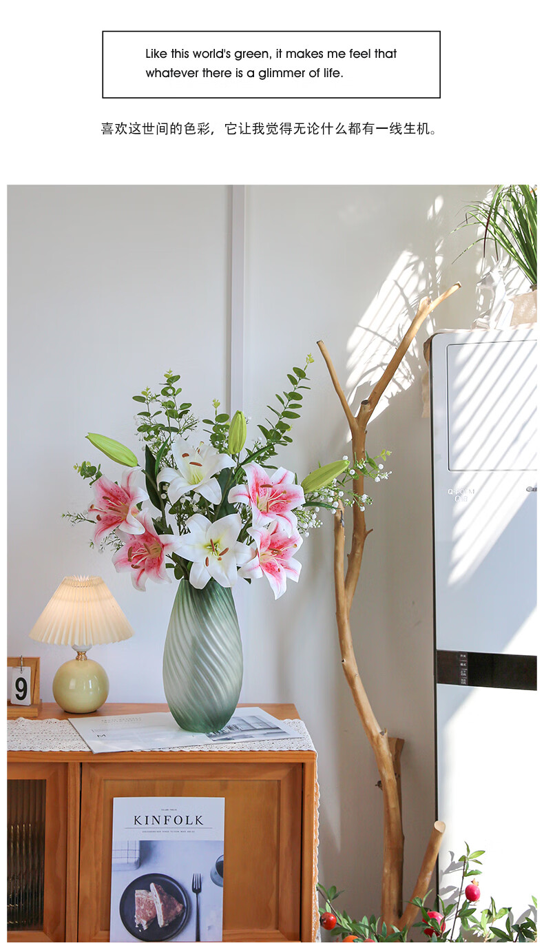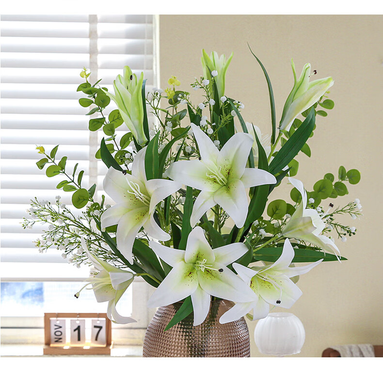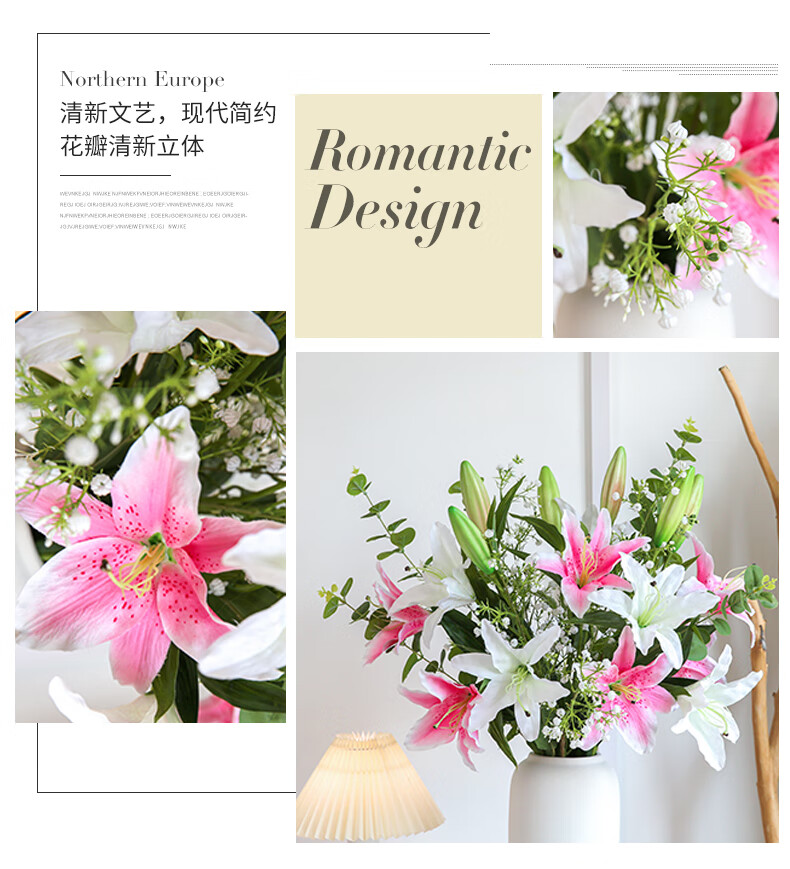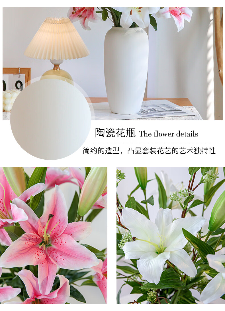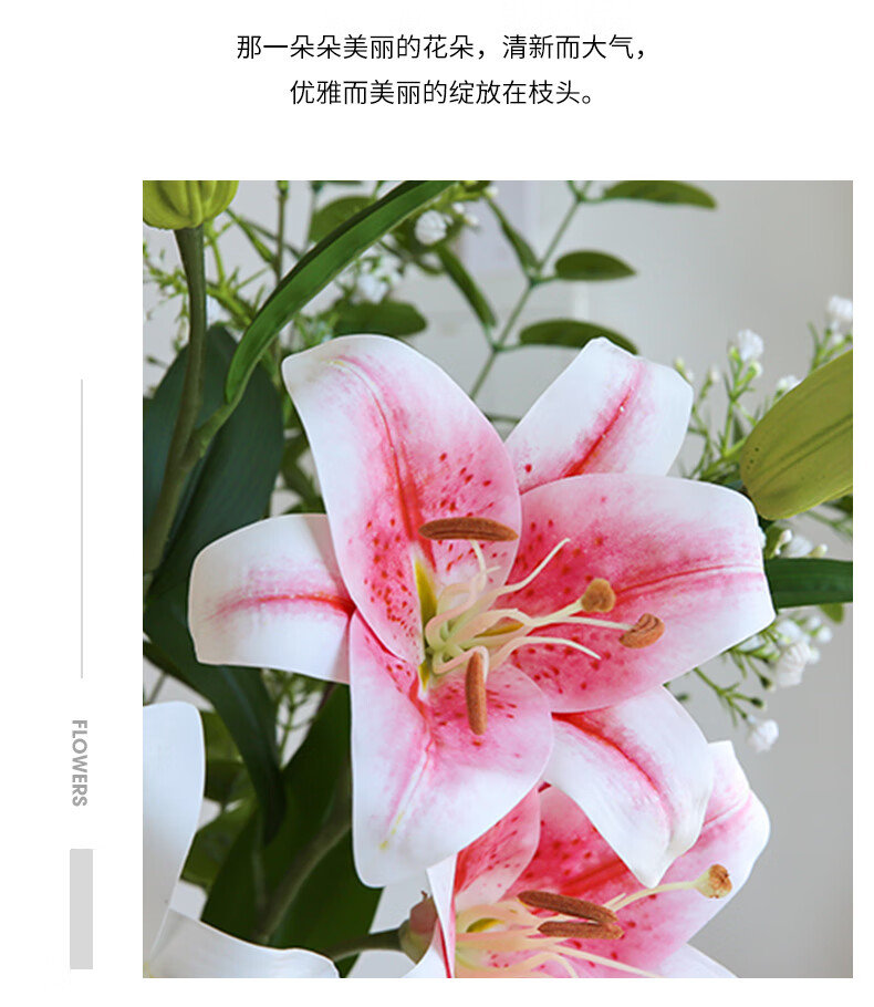 Fascinating makeup artificial flower high-branch lily flower simulated bouquet single living room TV cabinet dining table decoration simulated flower set flower 3 white 3 pink perfume lily + 2 leaves 2 baby's breath (not including vase)