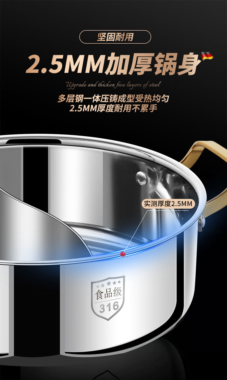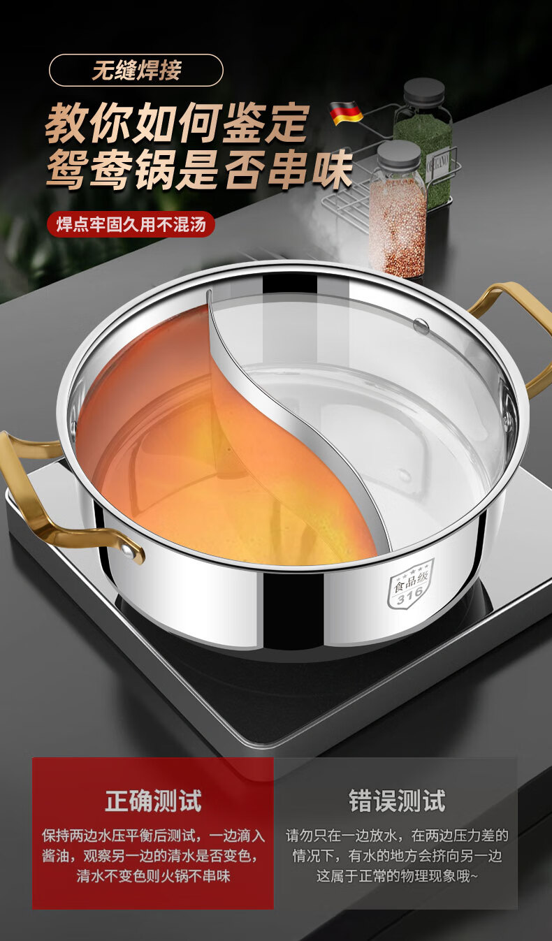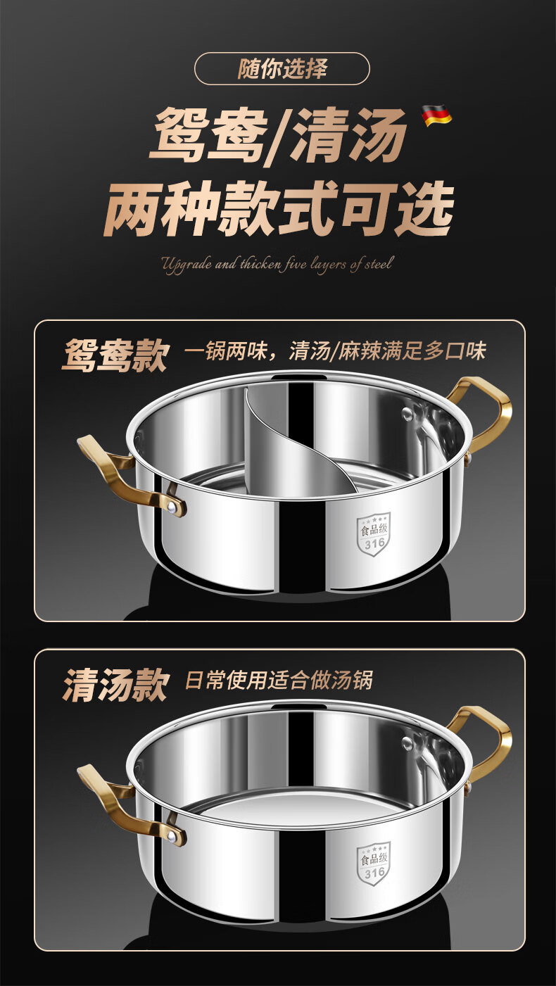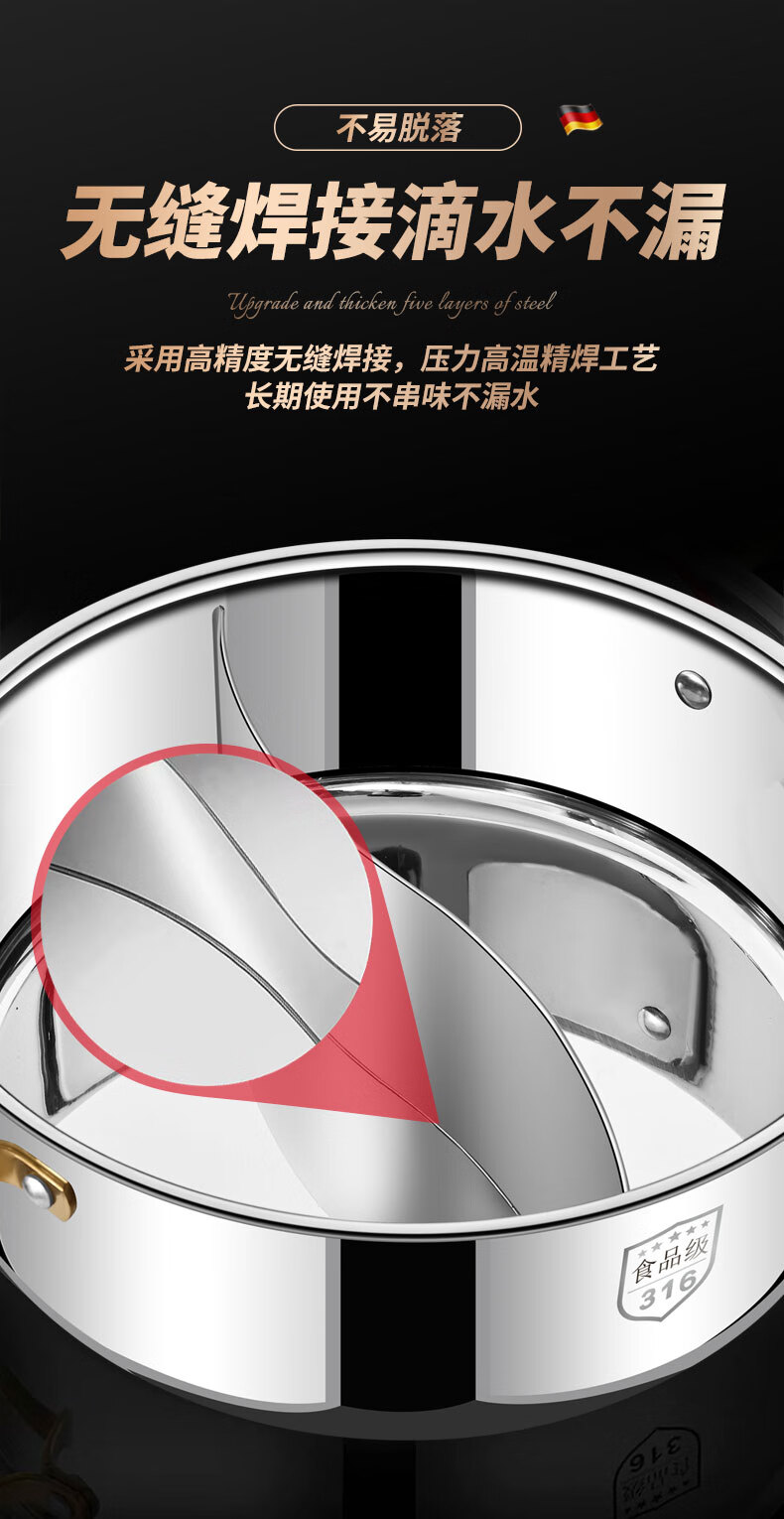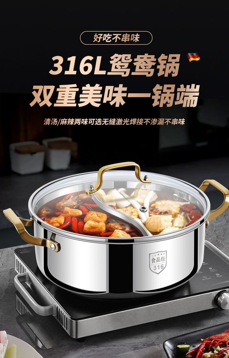 Clang household Yuanyang pot induction cooker hot pot basin household one-piece shabu-shabu thickened 316 stainless steel hot pot pot Yuanyang pot seamless welding 34cm