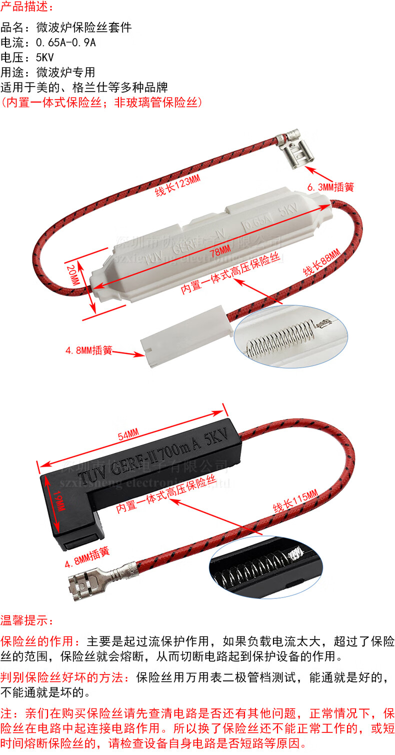Microwave oven high voltage fuse with shell integrated fuse kit 5KV 0.65A-0.9A suitable for Galanz, etc. 0.65A 5KV