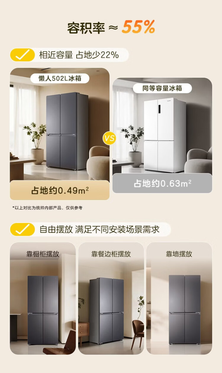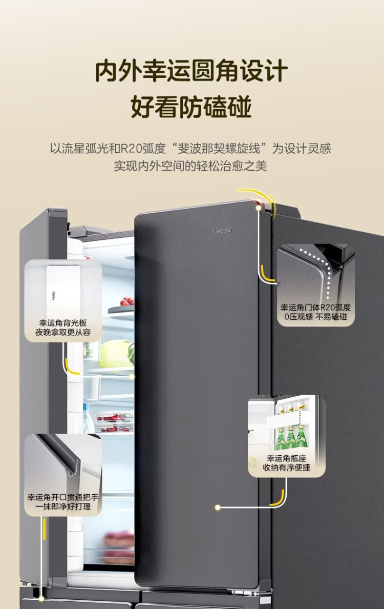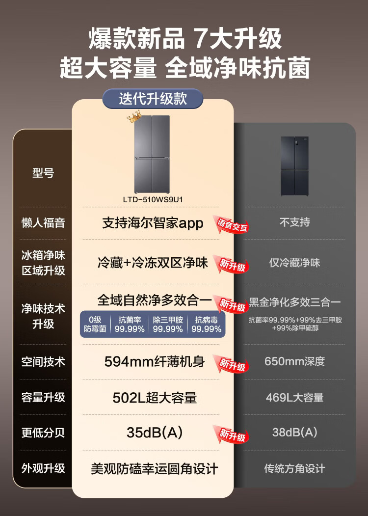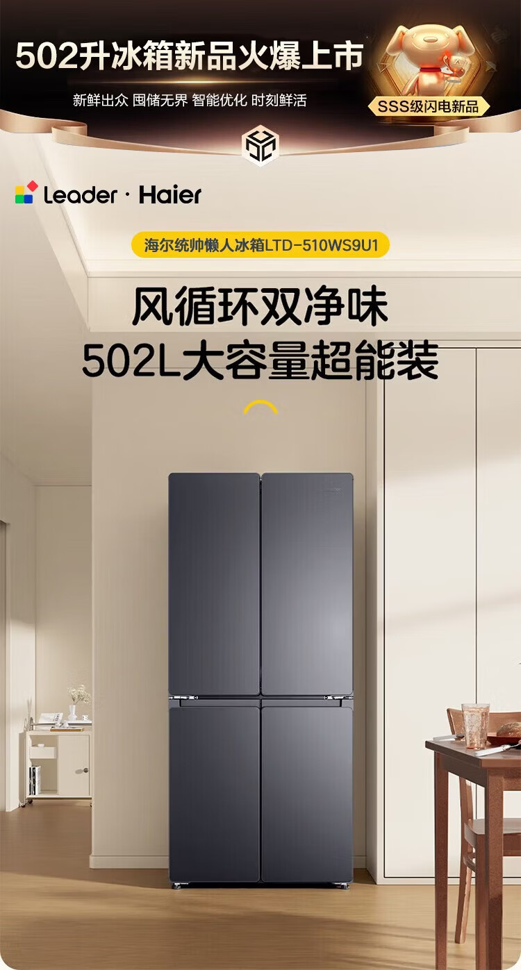 Haier refrigerator 502 liter double cycle ultra-thin can be embedded in four-door cross double-door first-class energy efficiency dual frequency conversion within 60cm large capacity national subsidy leader series 510 lazy series + 594mm ultra-thin + double sterilization + three-speed temperature change