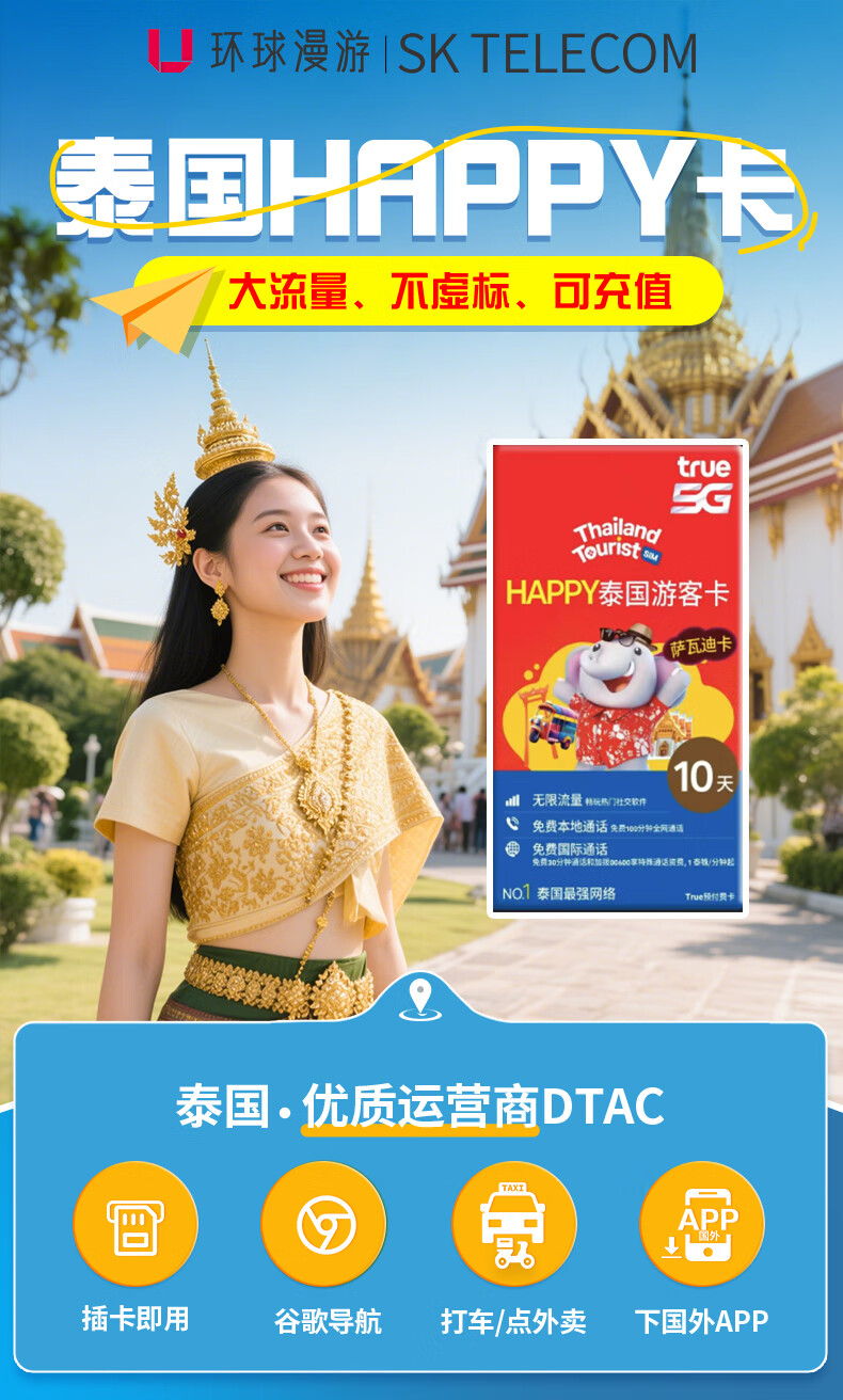Thailand phone card happy card 5G traffic card Bangkok dtac/truemove/ais mobile phone card unlimited traffic mail Happy card 7 days 35GB total capacity 5G high speed does not include calls, no real name required