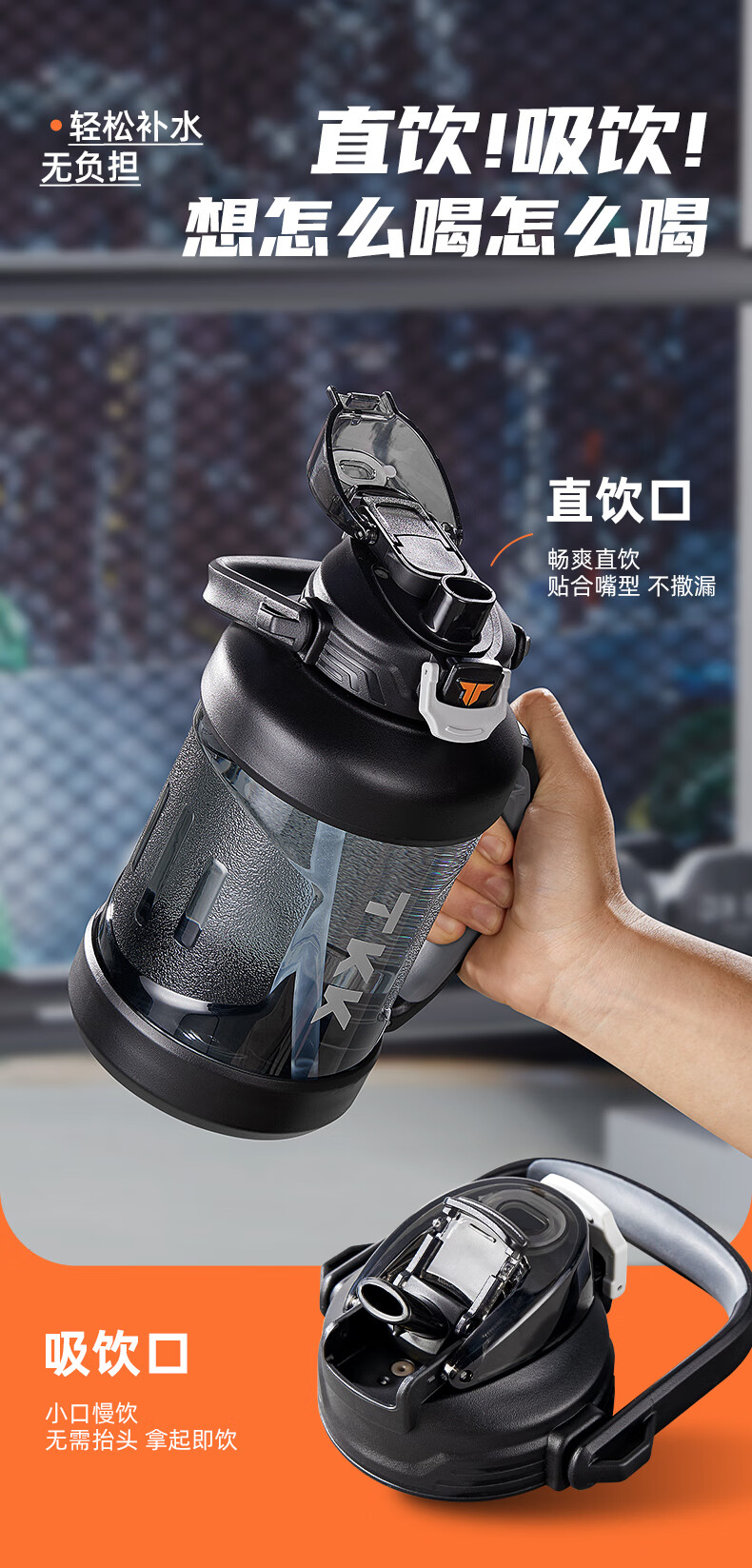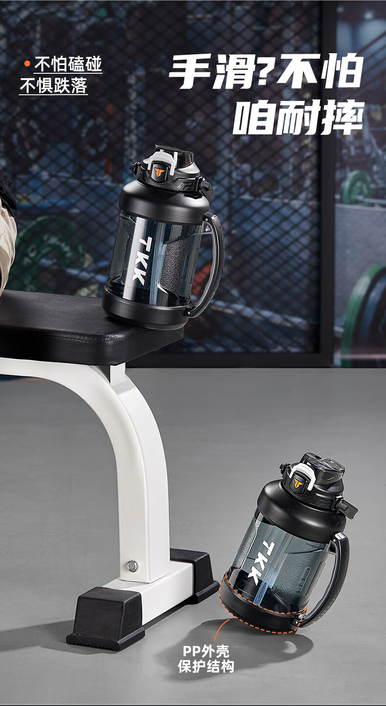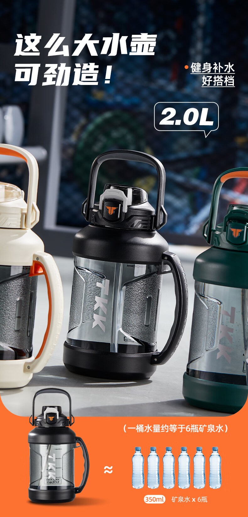TKK sports water bottle large capacity high temperature resistant fitness water cup men's ton bucket portable tritan military training plastic cup 2L black thickened fall-resistant + strap 2000ml