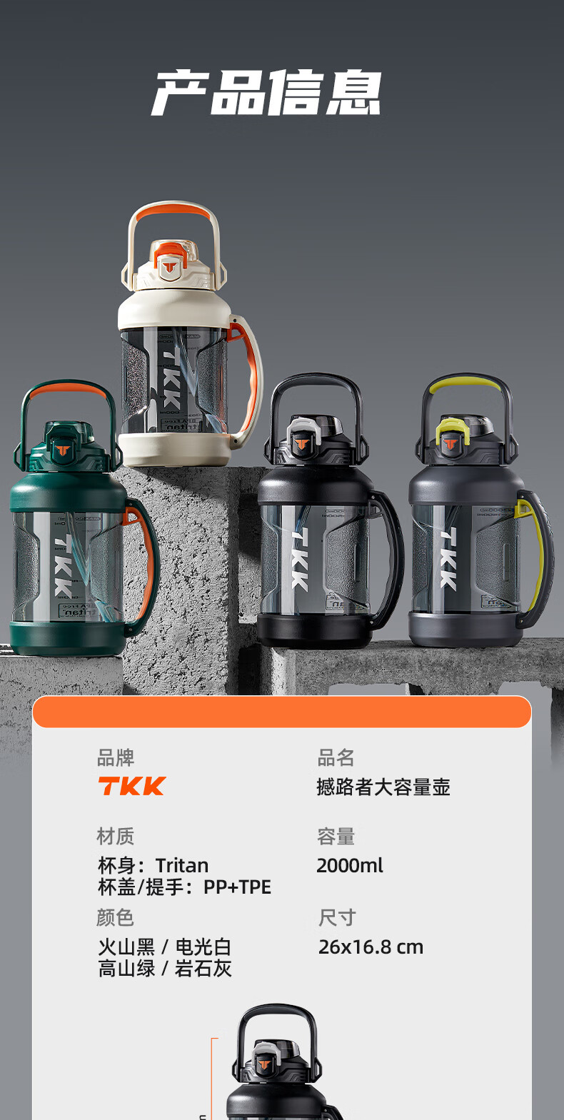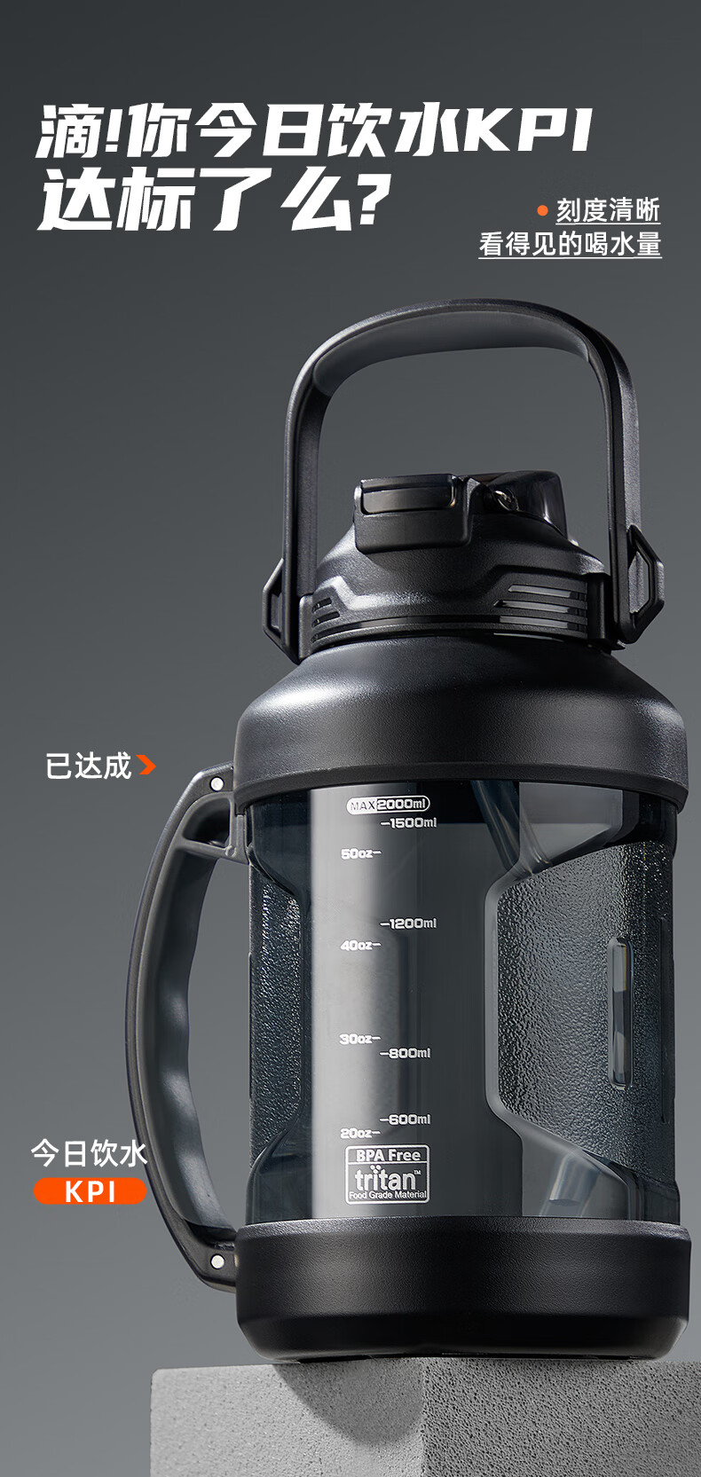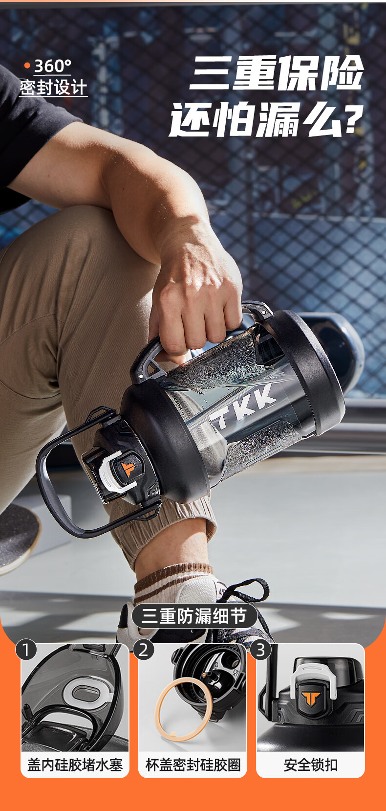 TKK sports water bottle large capacity high temperature resistant fitness water cup men's ton bucket portable tritan military training plastic cup 2L black thickened fall-resistant + strap 2000ml