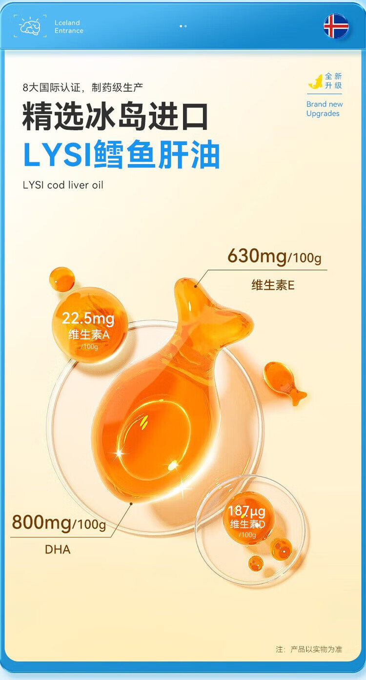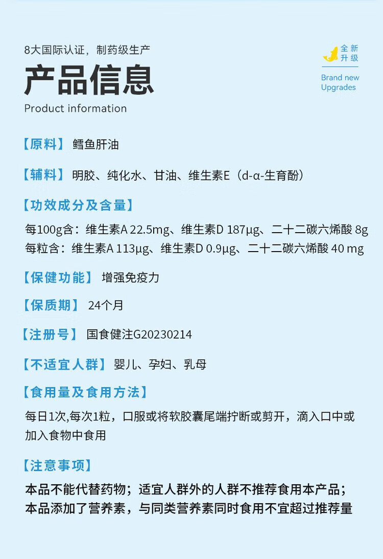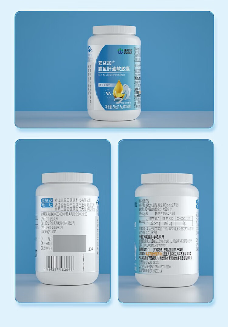 Kang En Bei Cod Liver Oil Soft Capsules Vitamin AD and Vitamin E are rich in DHA for children, toddlers, teenagers, students, adults, to enhance immunity, 1 bottle
