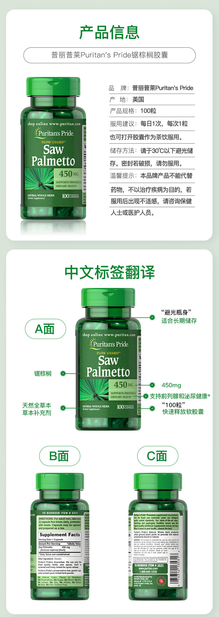 Priprela Saw Palmetto Compound Extract Capsules 100 Capsules Frequent urination and urgency to protect men's health Imported from the United States Saw Palmetto Compound Extract Capsules 100 capsules