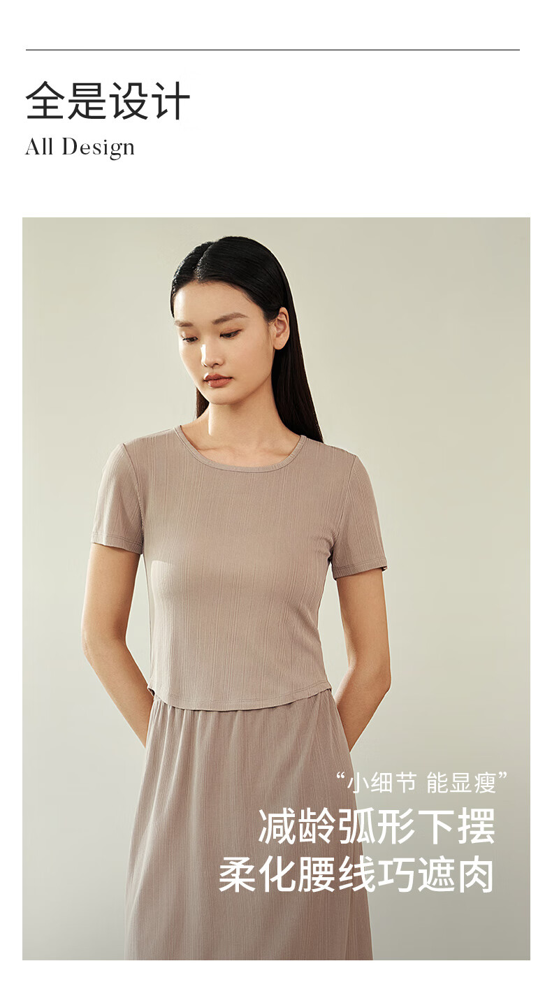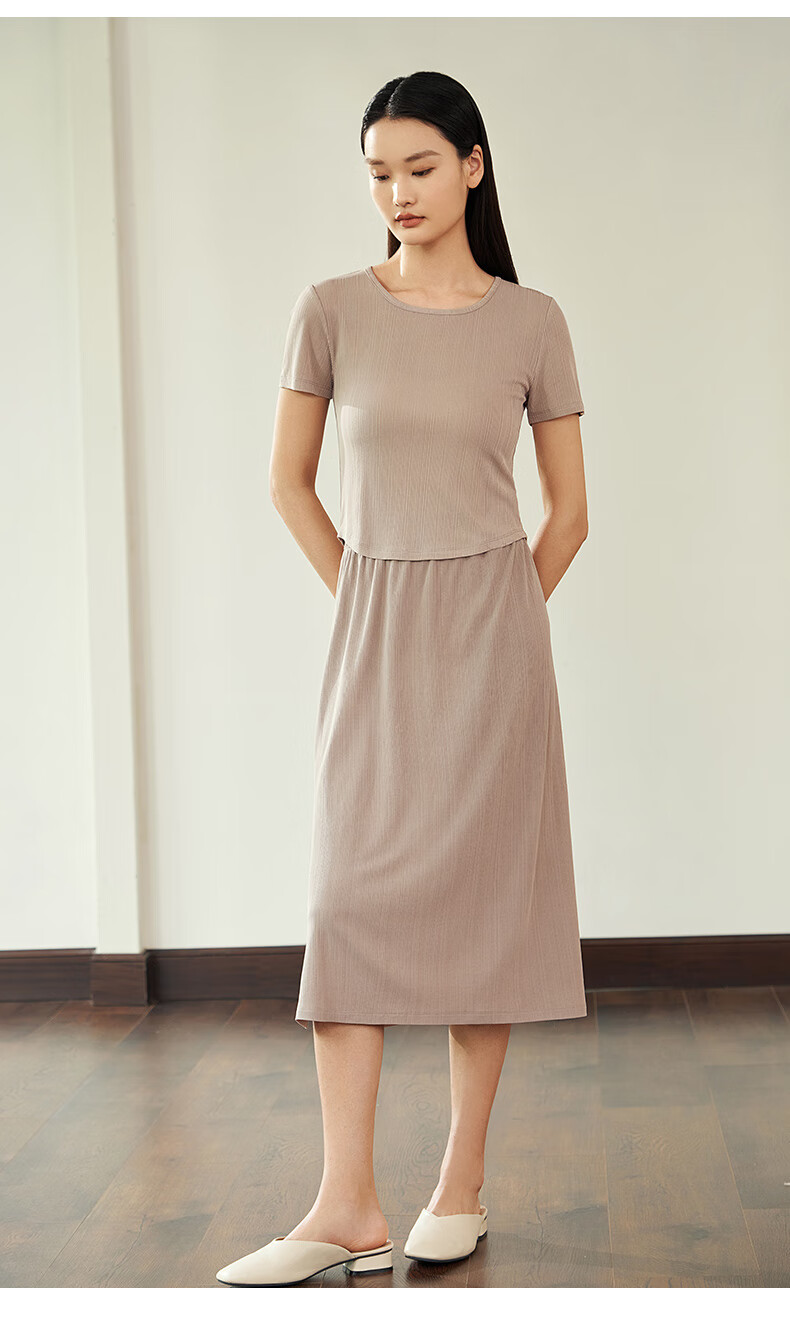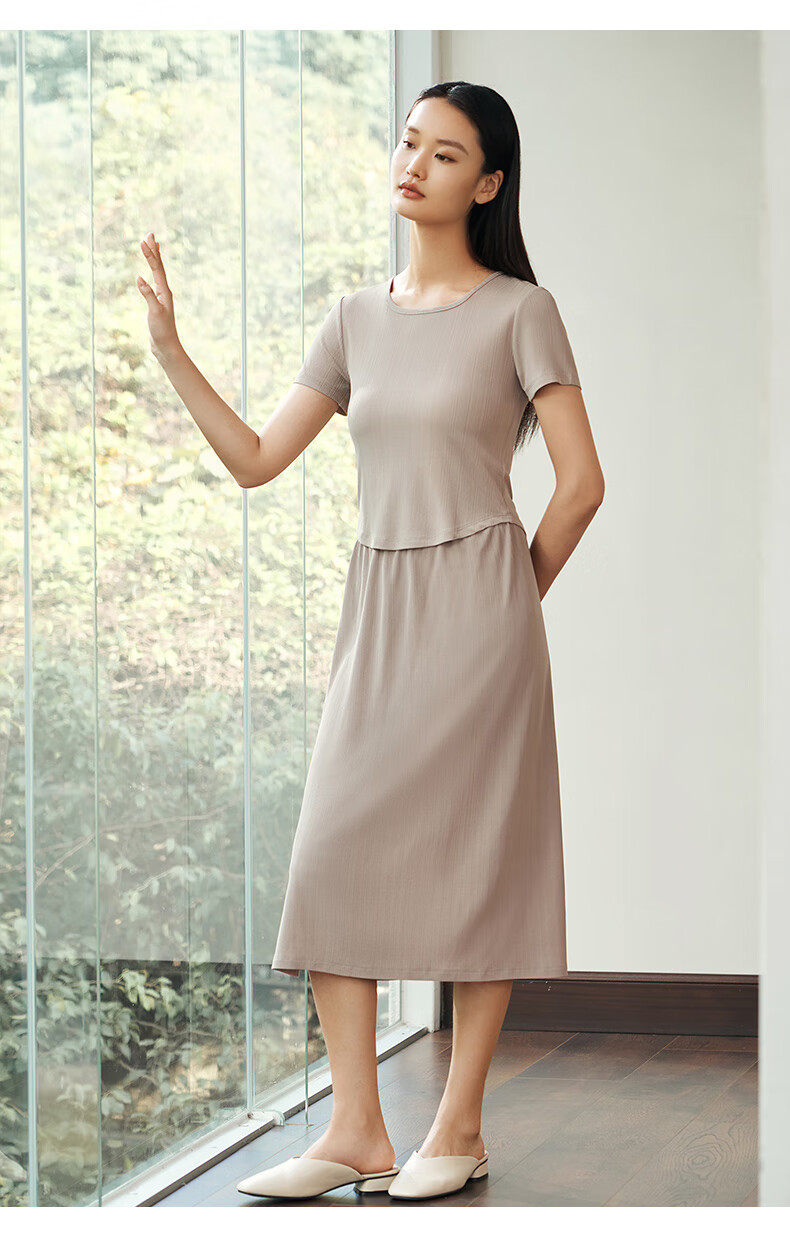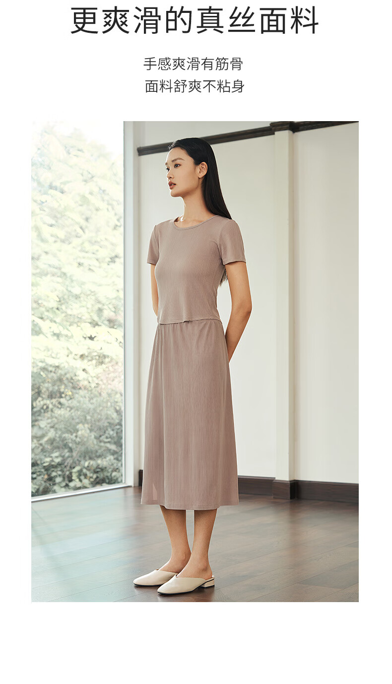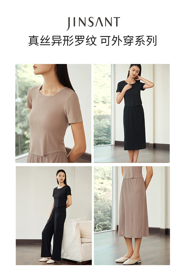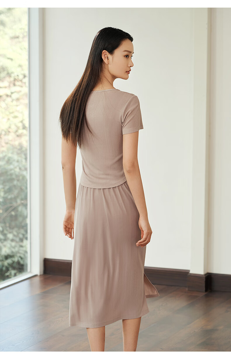 Jin Santa Ladies Silk Wearable Ribbed Right Shoulder Short Sleeve Shirt Skirt Almond Gray (Shirt) M
