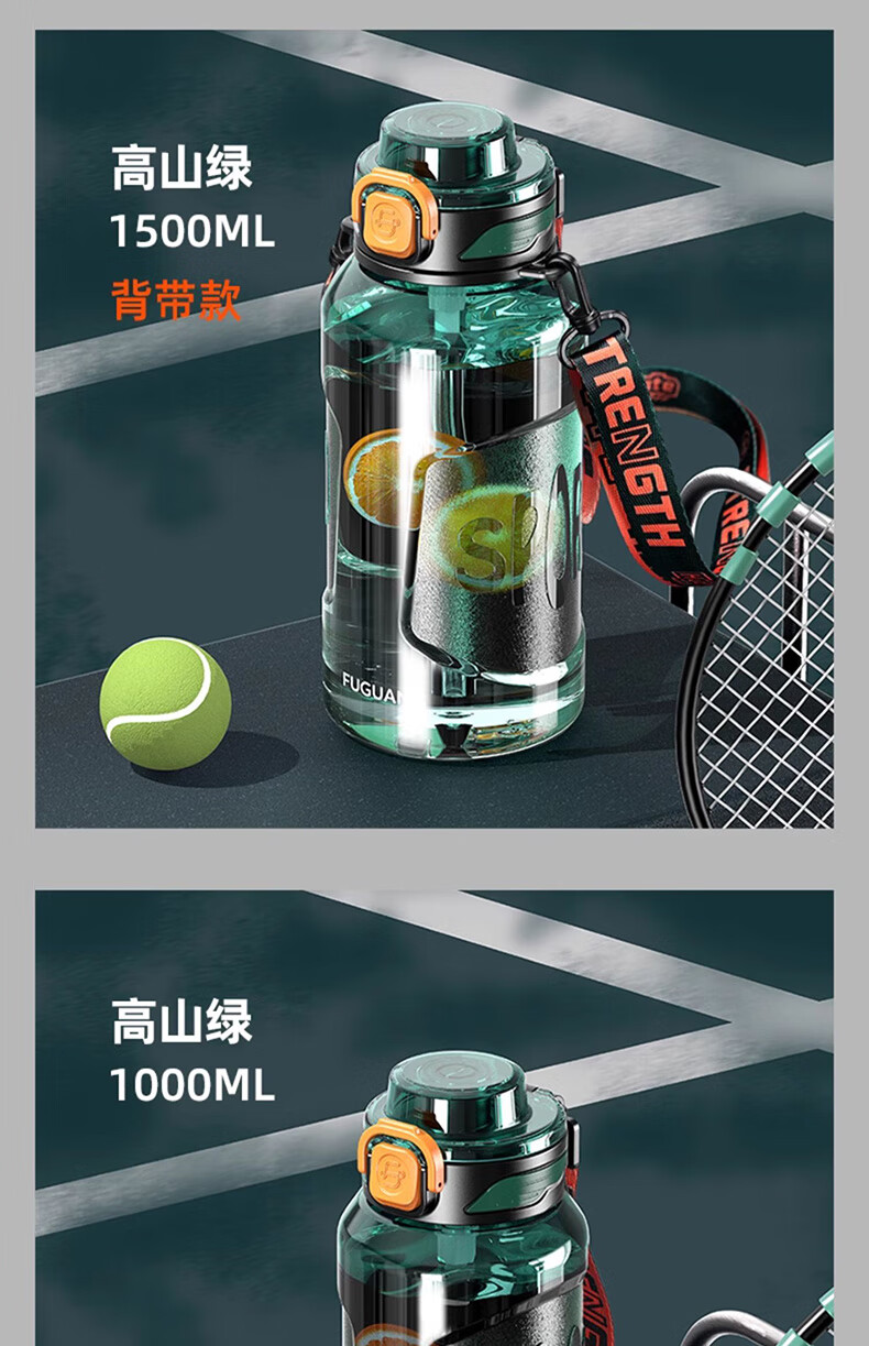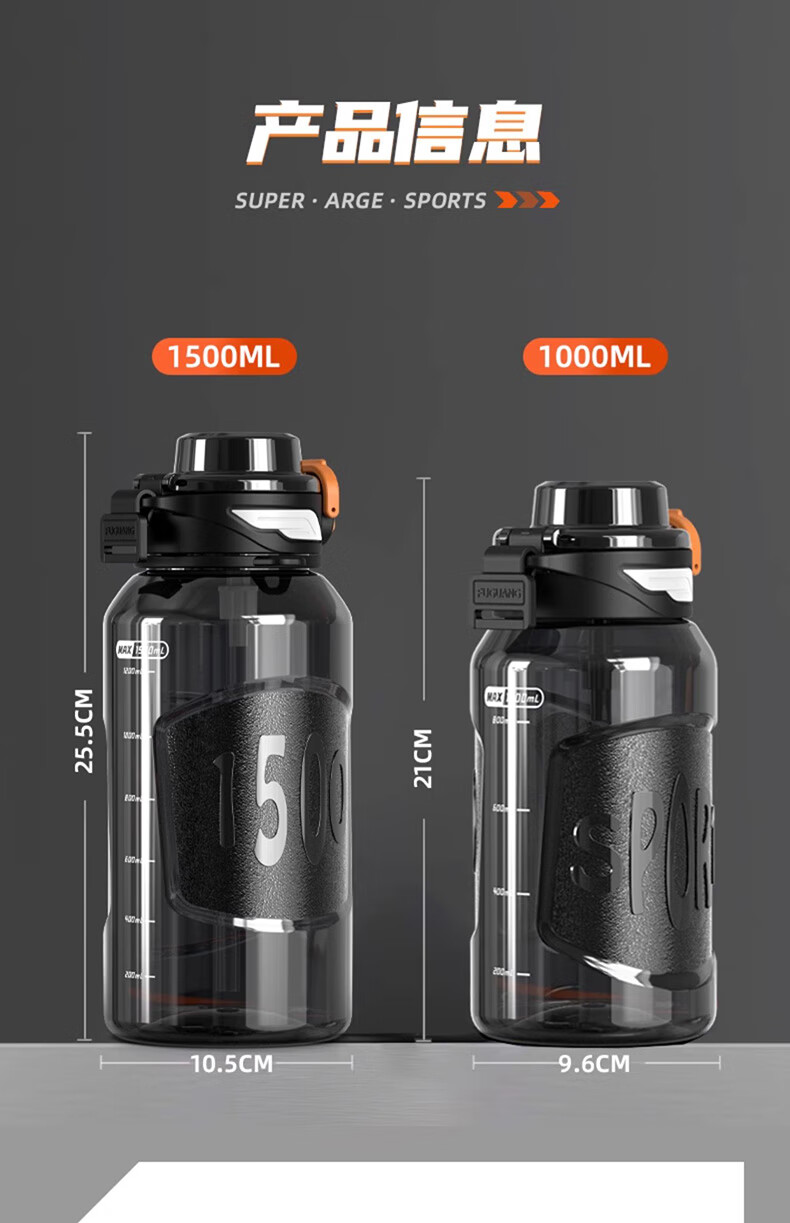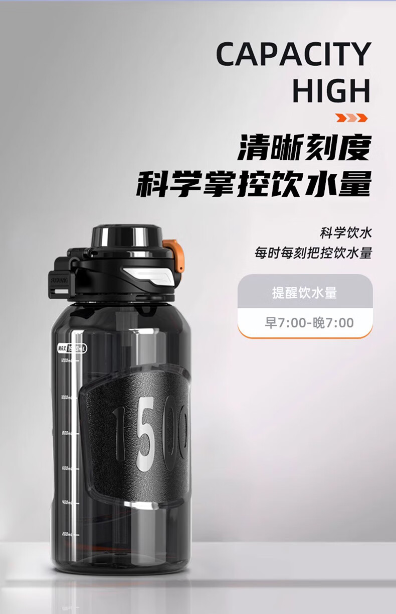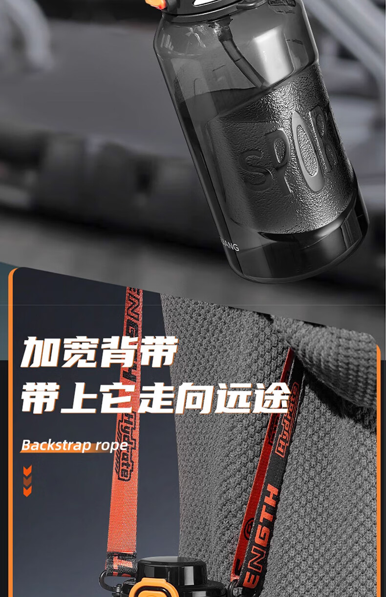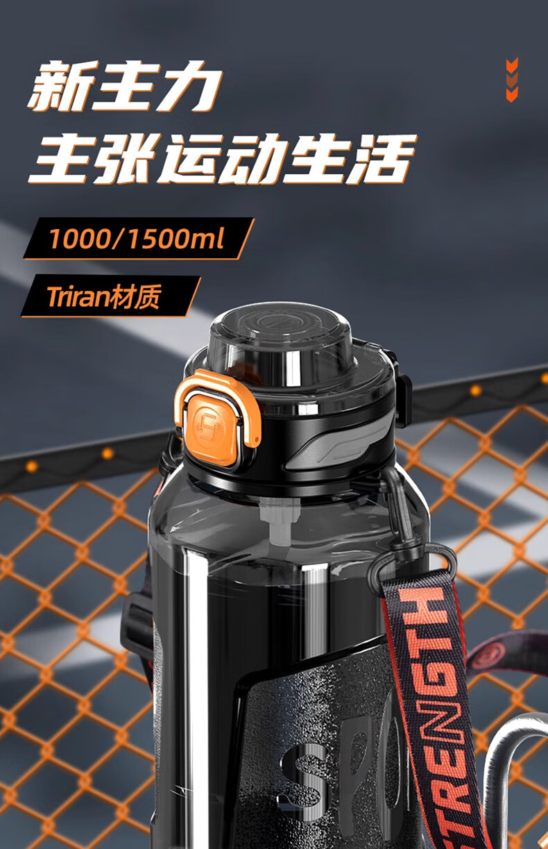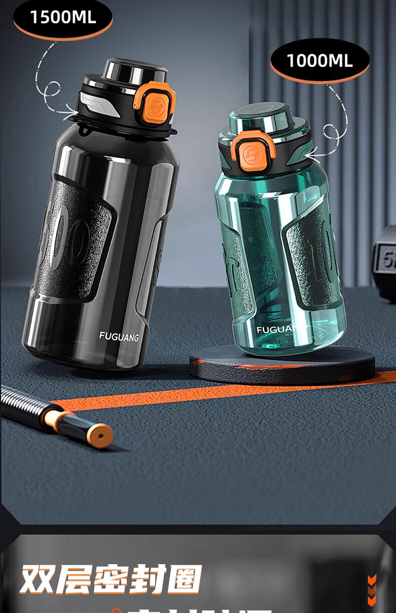 Fuguang Large Capacity Sports and Fitness Water Cup for Boys Summer High Temperature Resistant Space Cup Ton Bucket Ton Kettle Plastic Water Bottle Dark Black Strap + Rope + Straw 1.5L