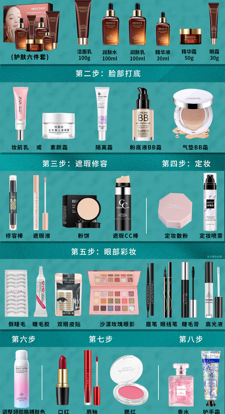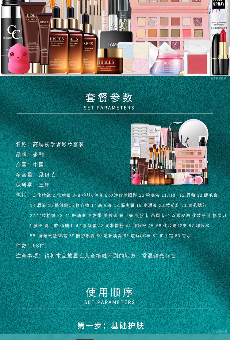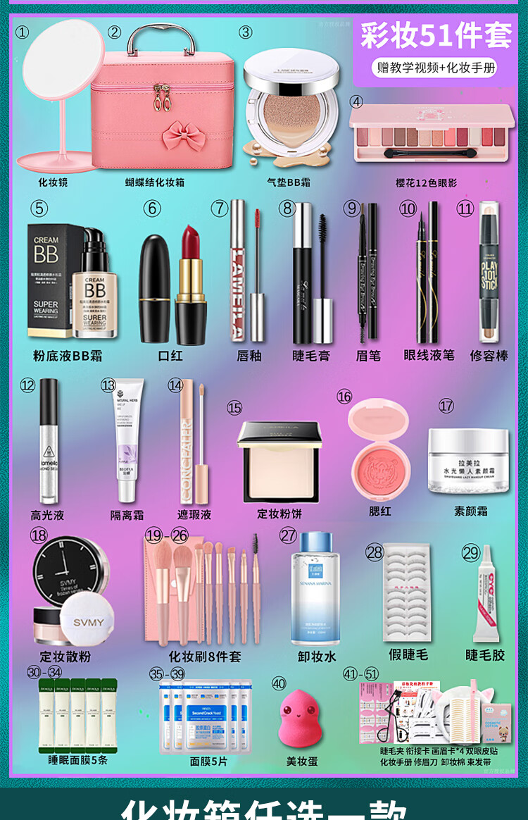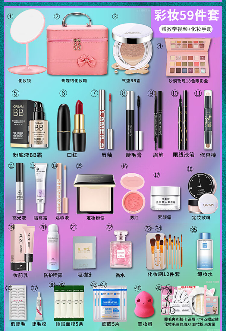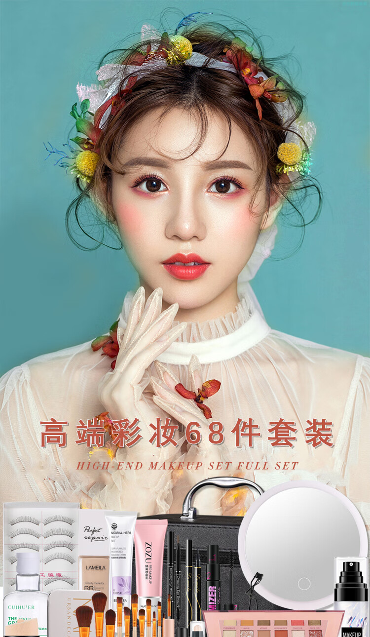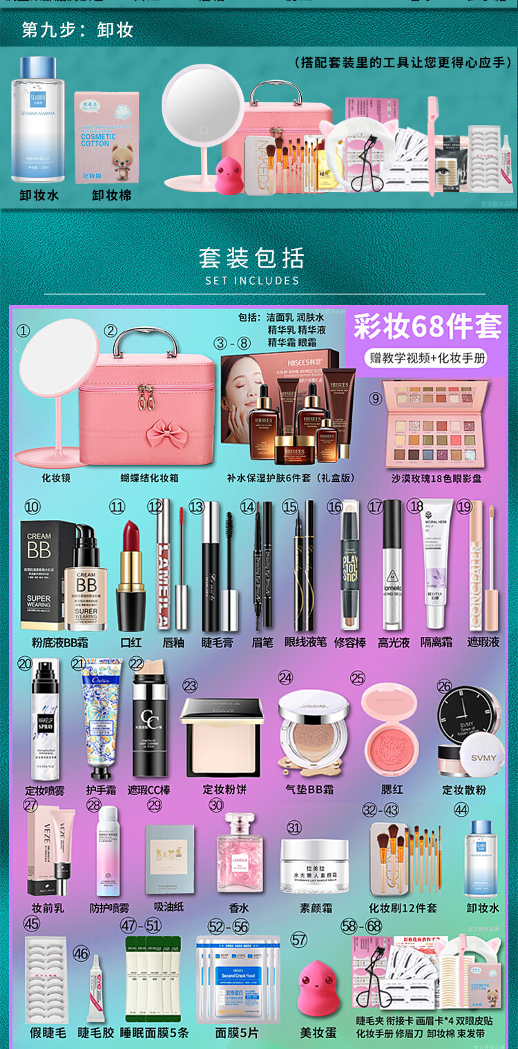 Bodie super multi-piece combination, a complete set of beginners' cosmetics set, a complete set of new year's makeup gifts for beginners, package 5 complete set of makeup + skin care products, 68 pcs