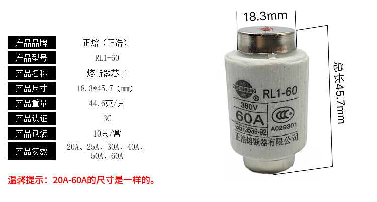 Positive melting ceramic fuse RL1-60 spiral fuse core 20A25A30A40A50A60A fuse tube 380V 60A5 pieces