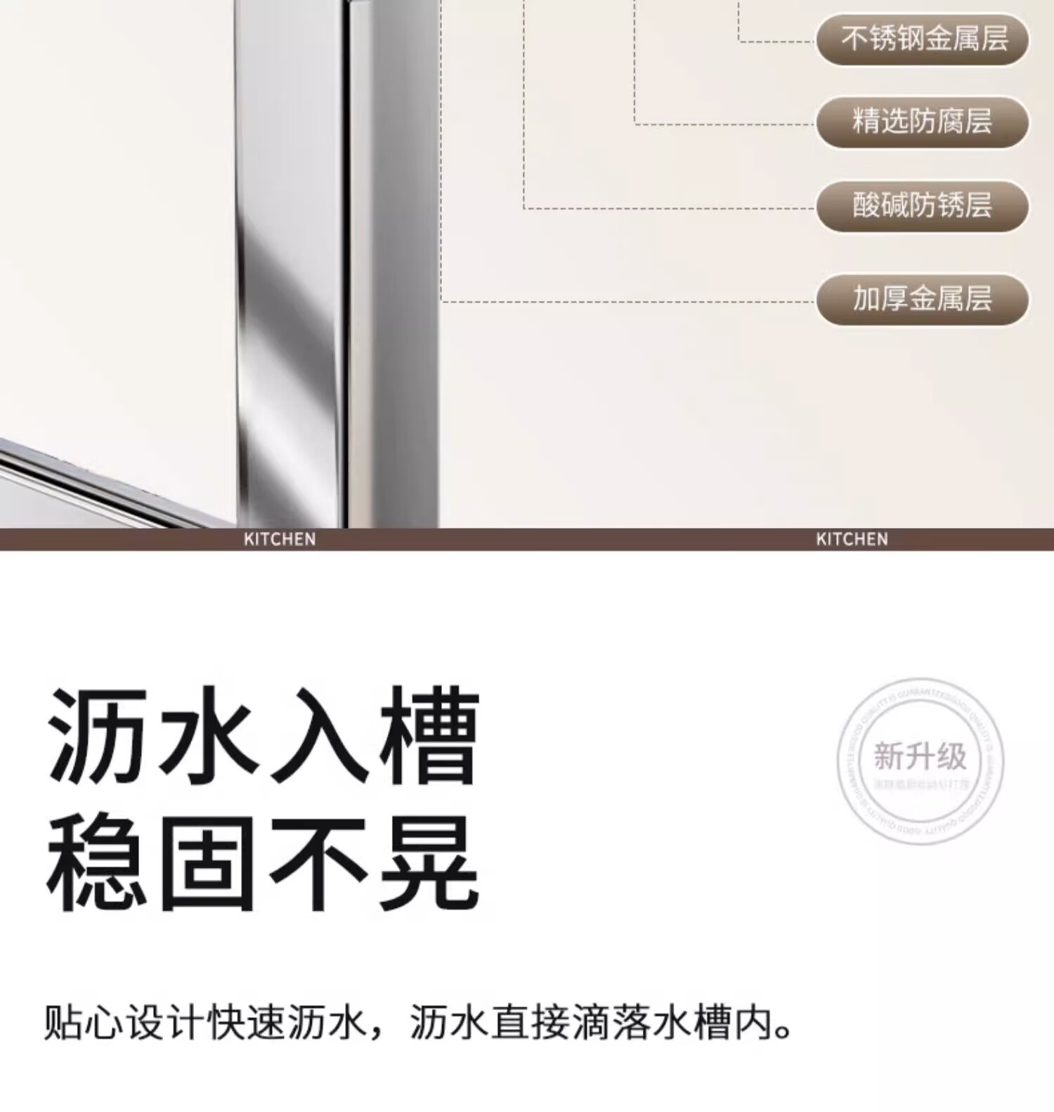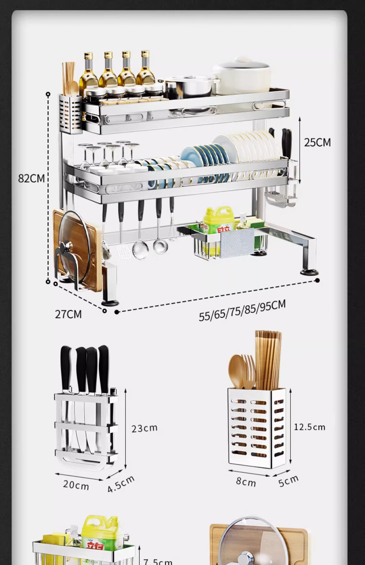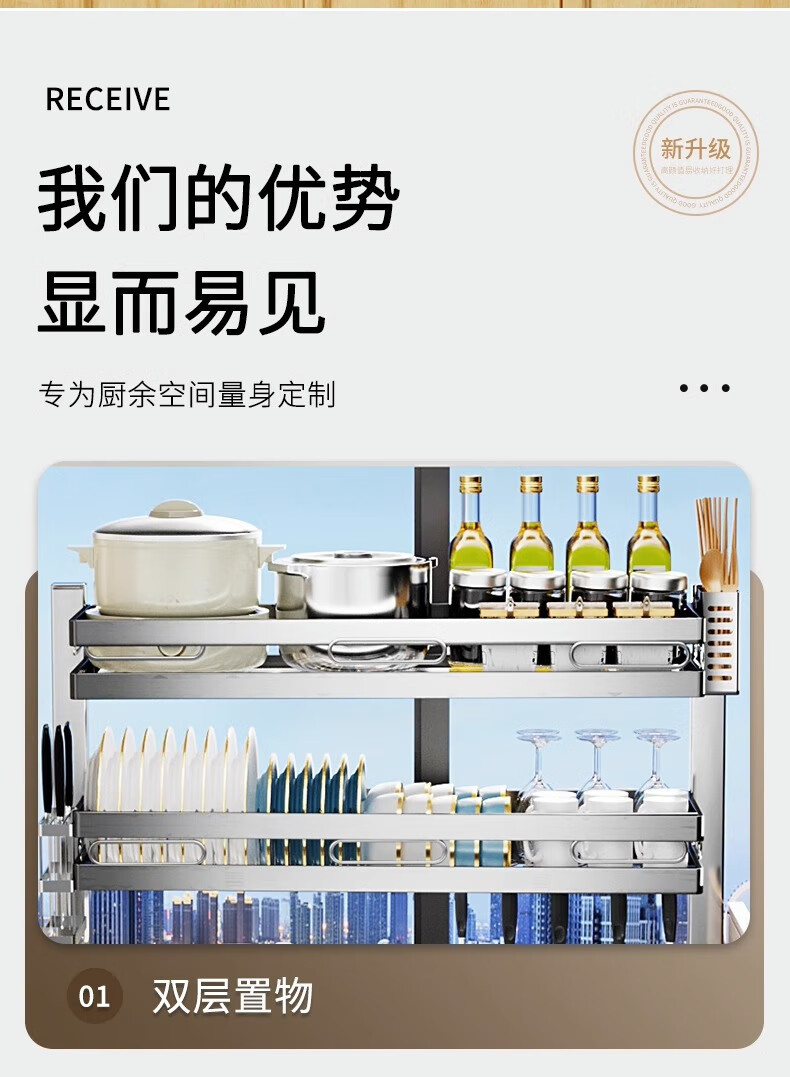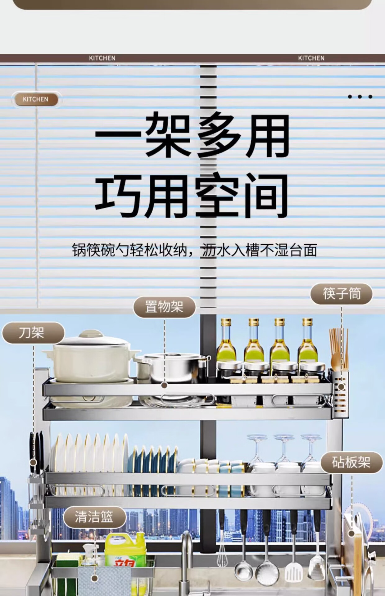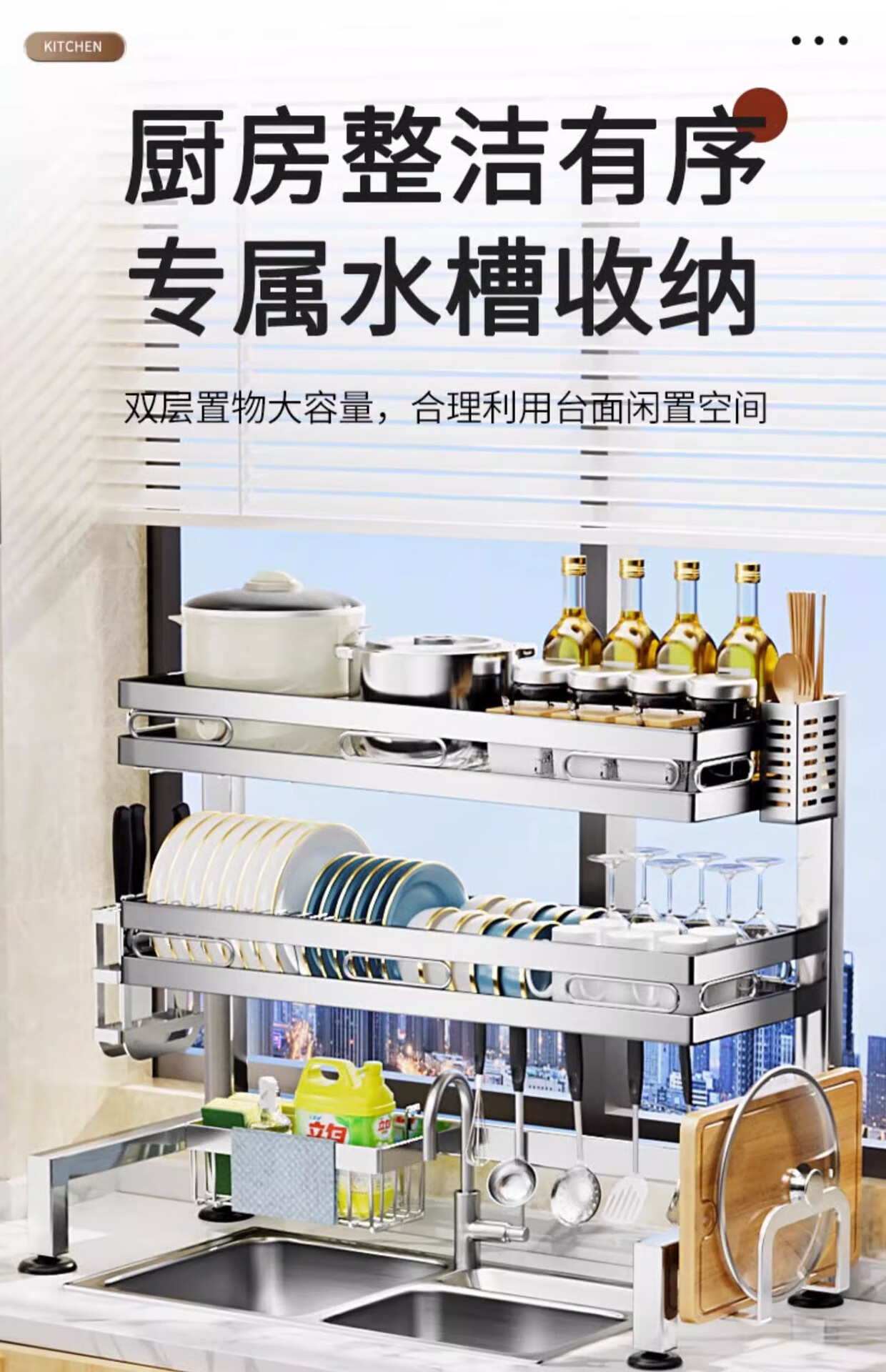 Kunfeng 304 stainless steel kitchen sink rack multi-functional dishwashing rack sink dish storage drain rack H type integrated sink rack-75 double layer main rack style