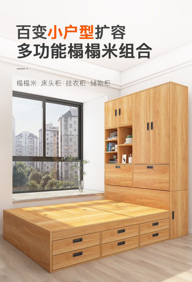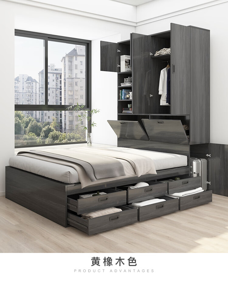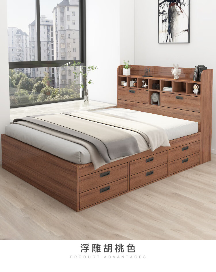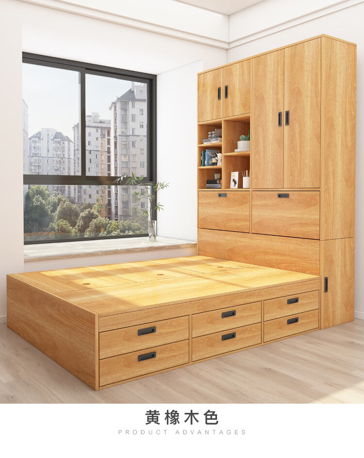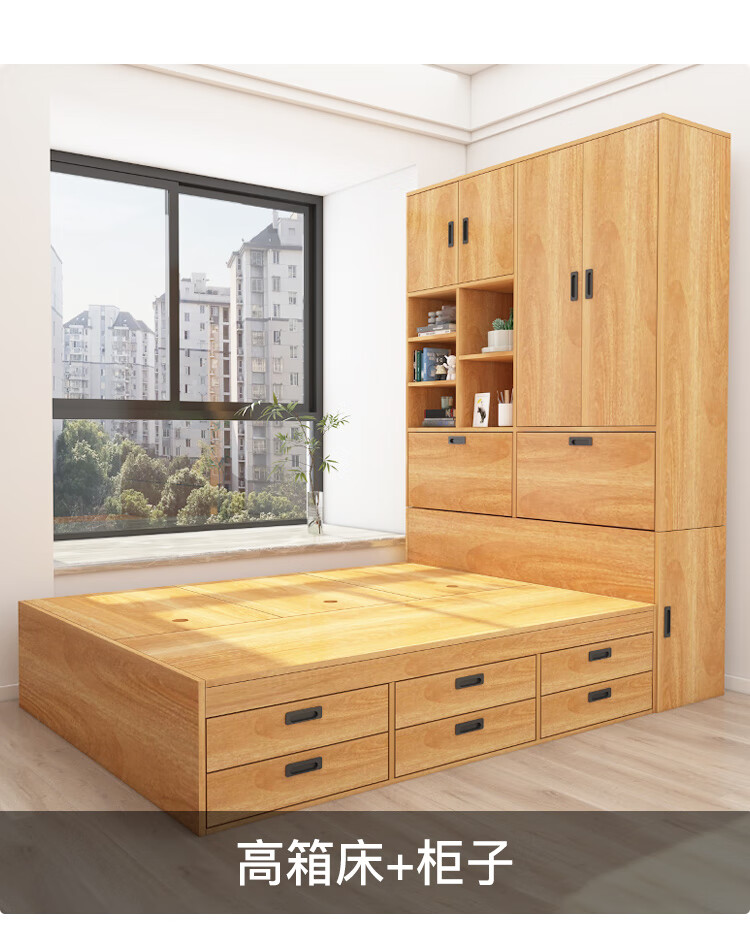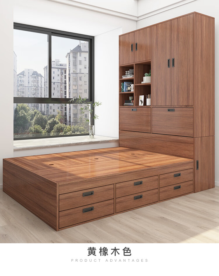 Pingziji small apartment tatami bed combination set high box storage drawer bed bedroom furniture ENF grade paint-free board customization embossed walnut color 1.5m tatami + standing cabinet + bedside