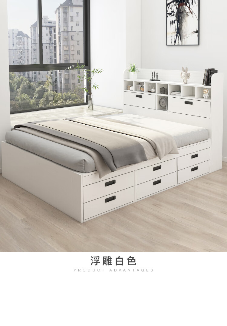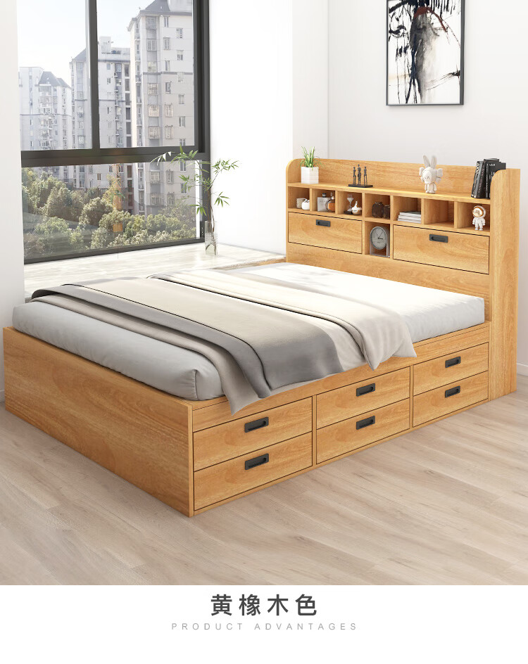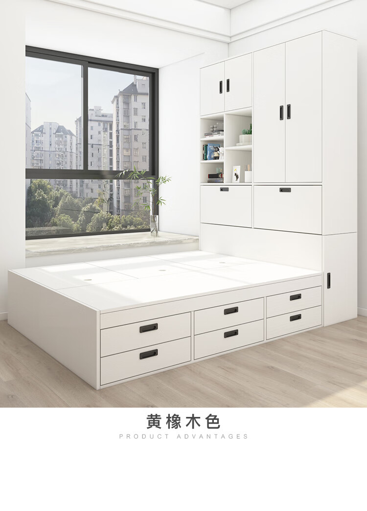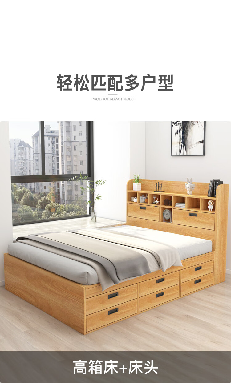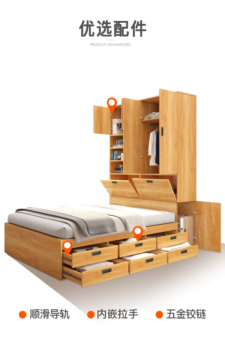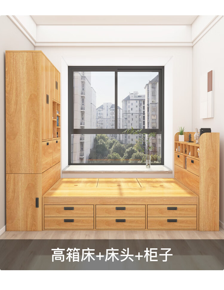 Pingziji small apartment tatami bed combination set high box storage drawer bed bedroom furniture ENF grade paint-free board customization embossed walnut color 1.5m tatami + standing cabinet + bedside