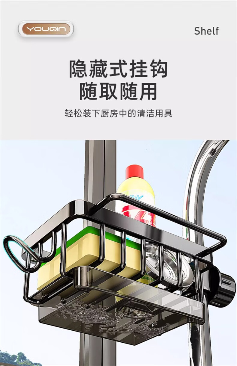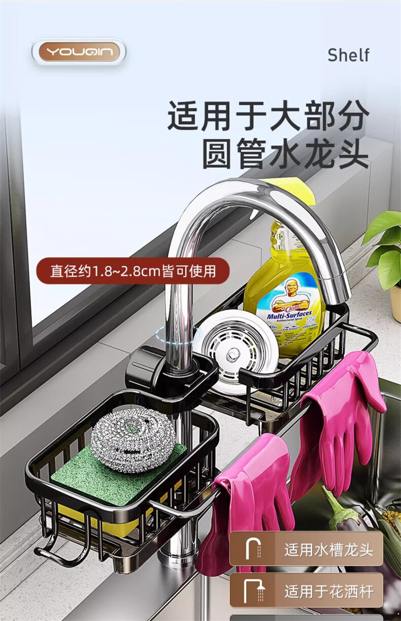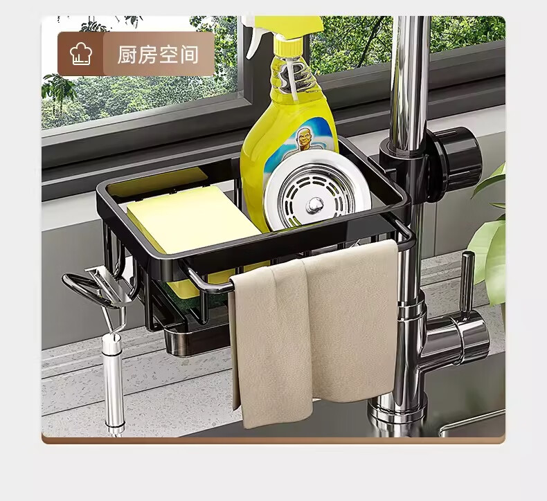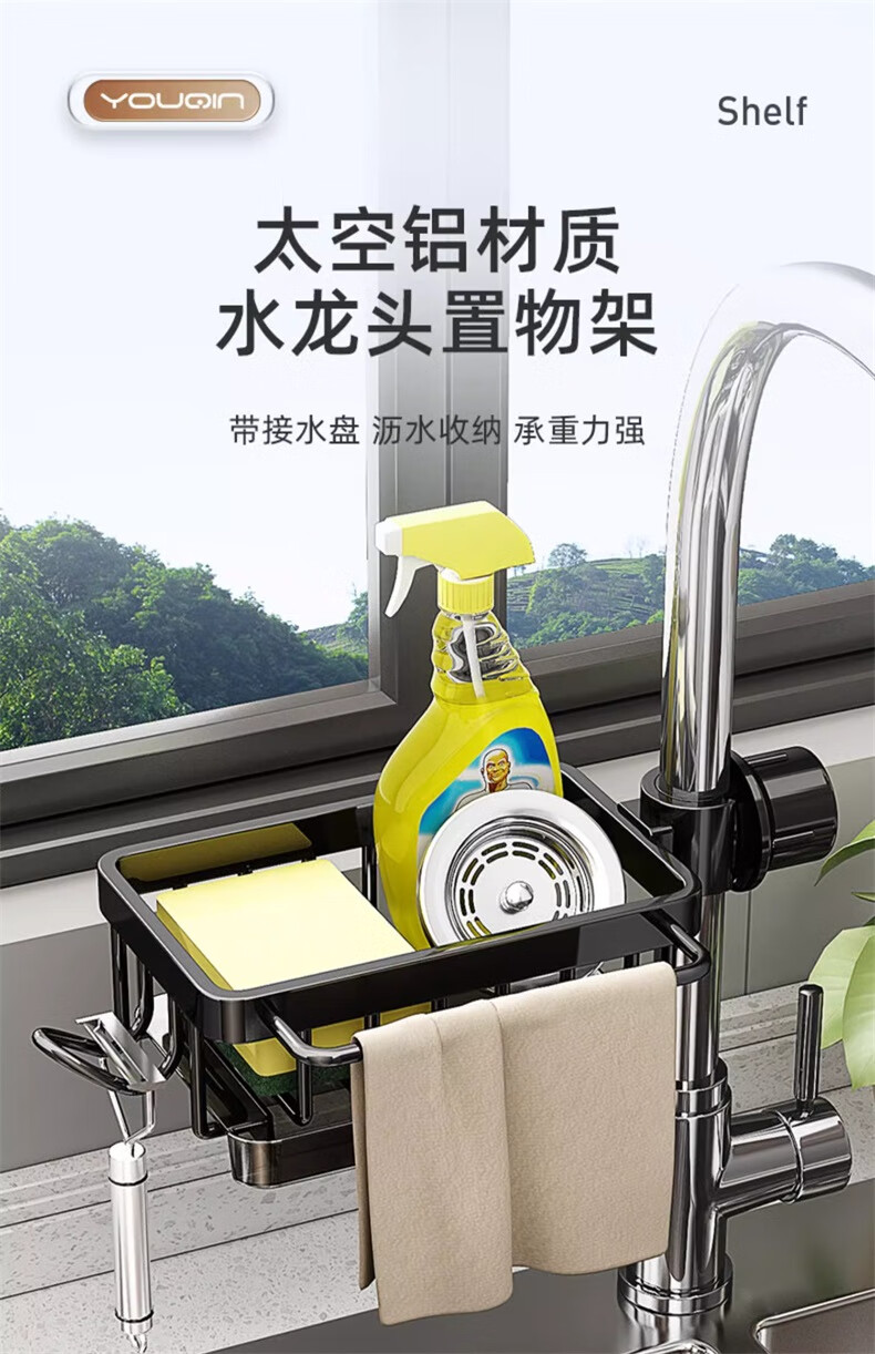 UQIN Kitchen Sink Faucet Towel Wipe Arrangement Dish Rack Dishwashing Sponge Wipe Drain Basket Multifunctional Storage Artifact Upgraded Gun Gray Left Side Rod Type - With Drain Tray