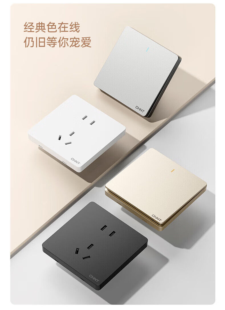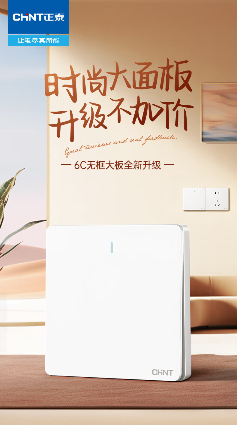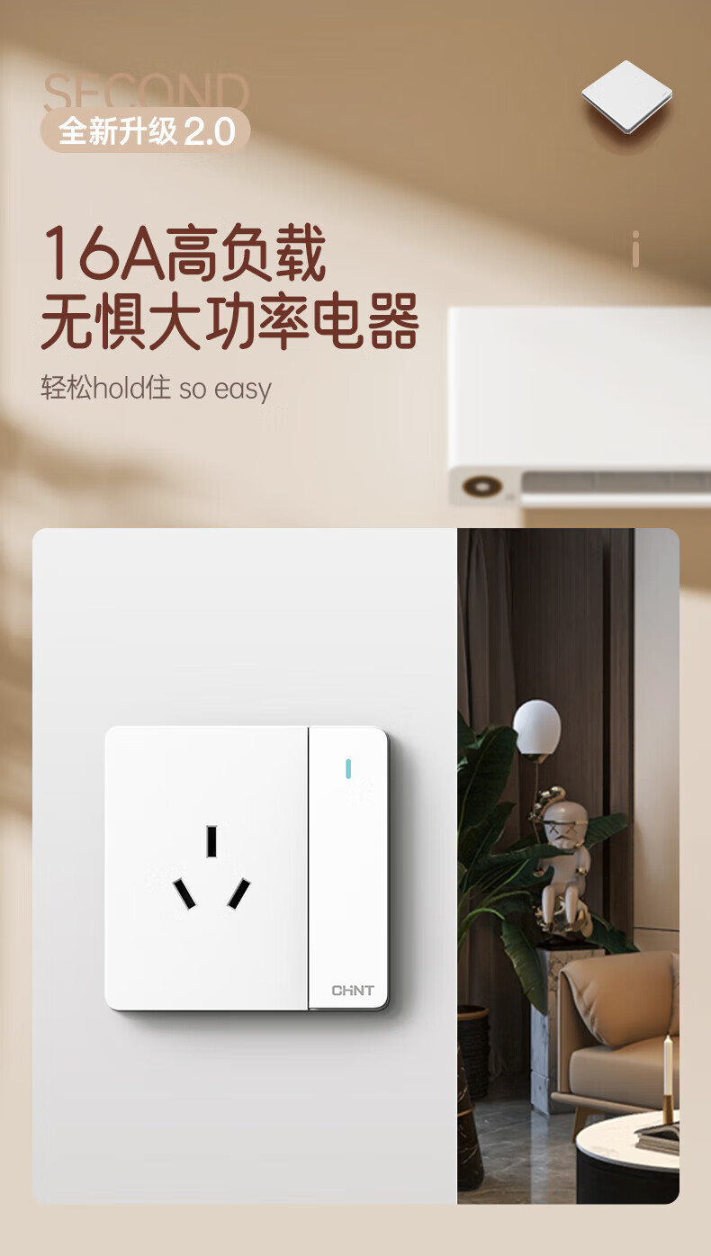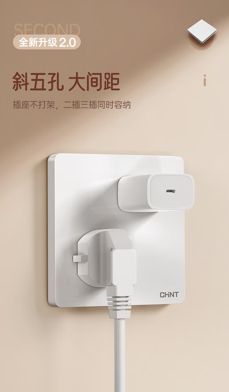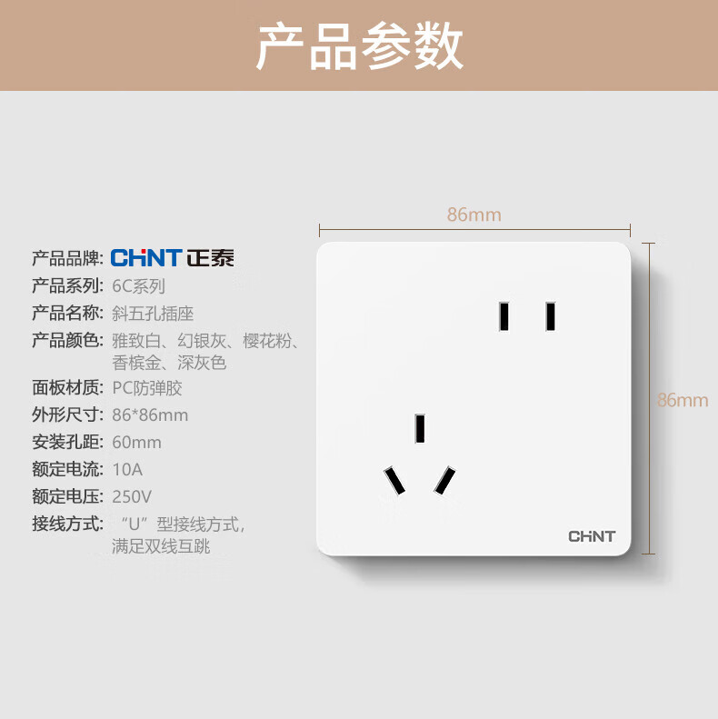 Chint (CHNT) switch socket wall panel household concealed two or three sockets oblique five-hole power supply 86 type whole house frameless large panel 6C white oblique five-hole socket