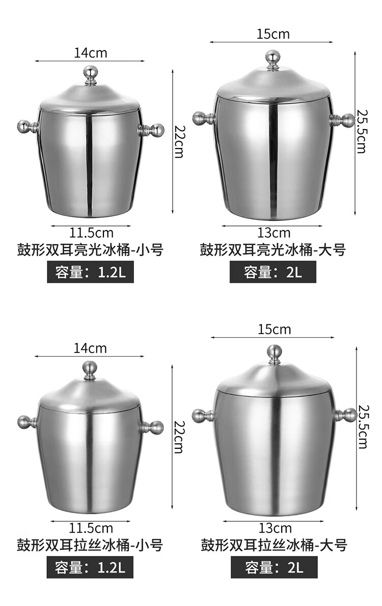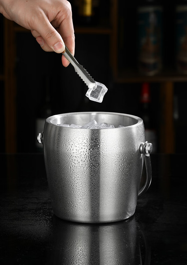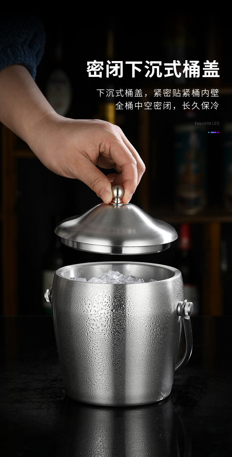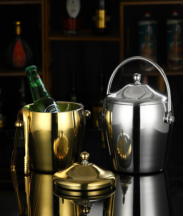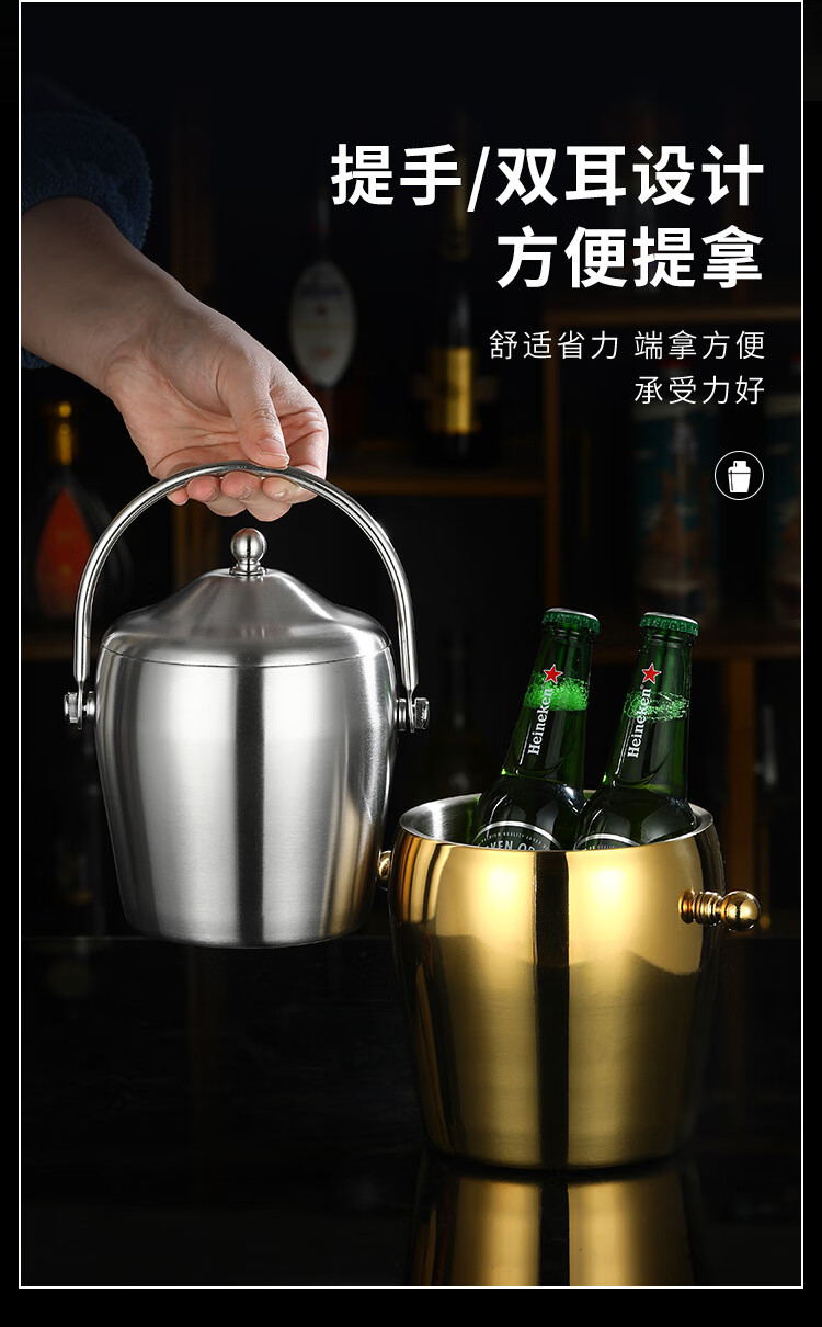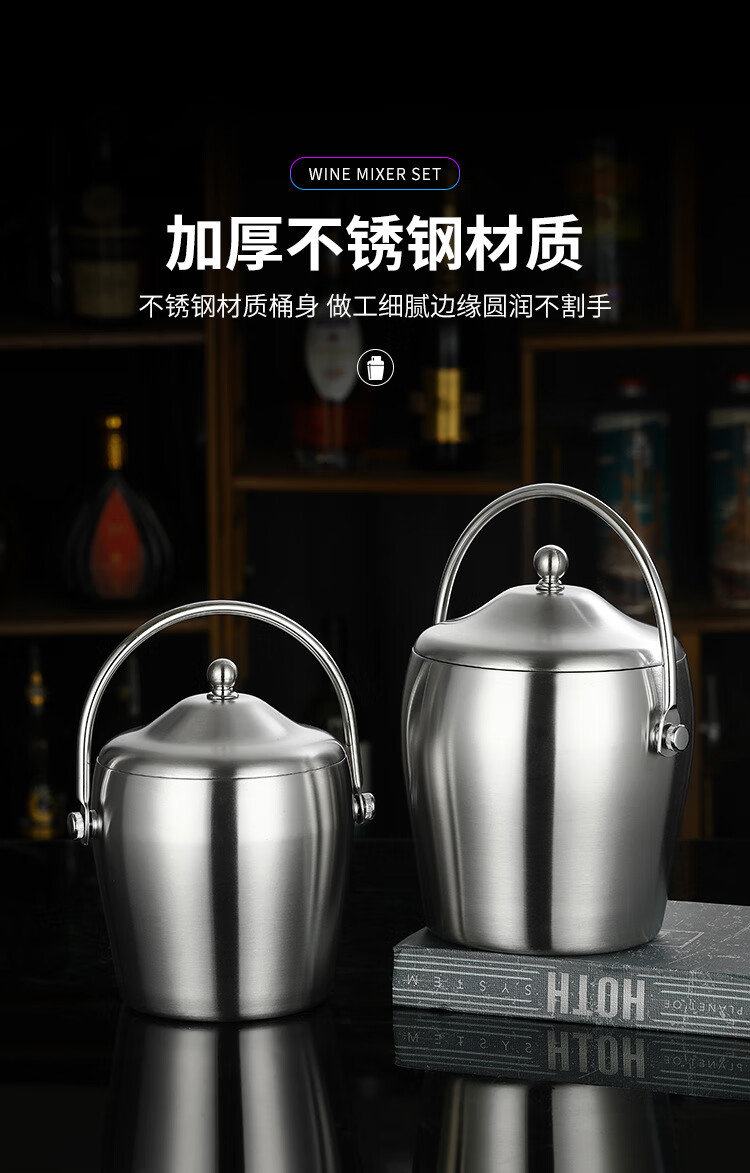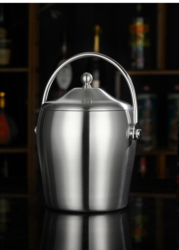Wuji Stainless Steel Double-layer Ice Bucket Portable Covered Cold Ice Bucket Bar KTV Beer Red Wine Champagne Ice Cube Bucket 1.2L Portable Drum Ice Bucket (Bright Light)