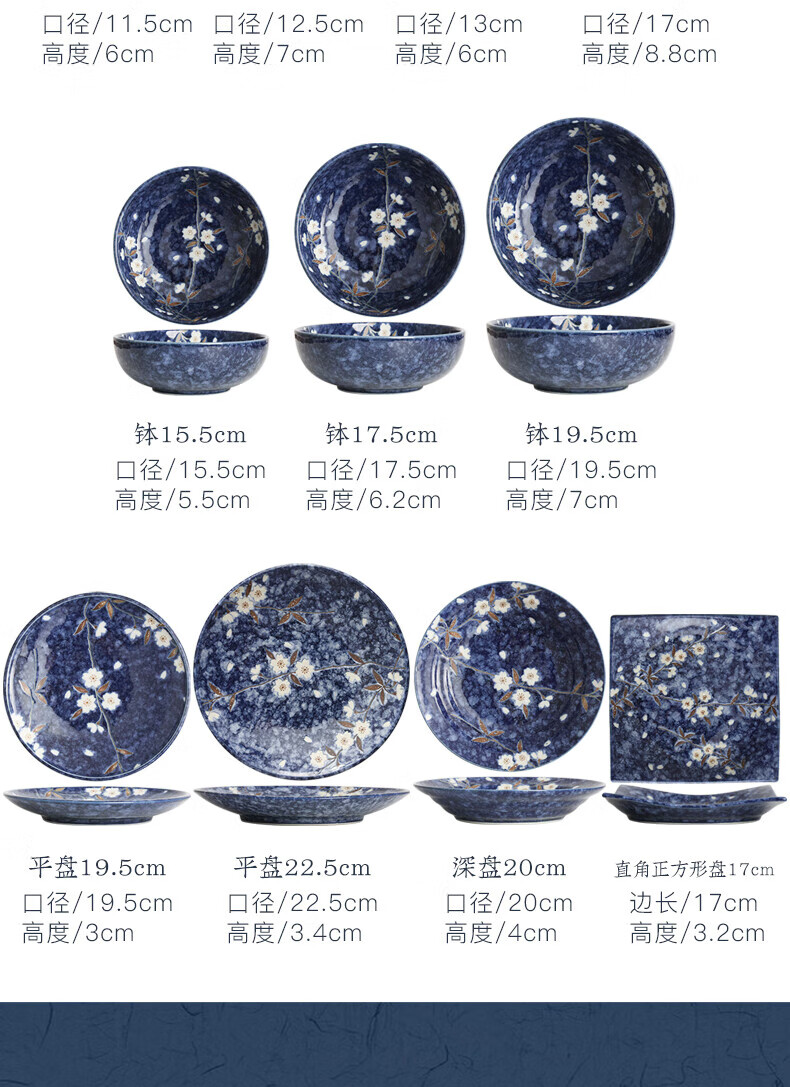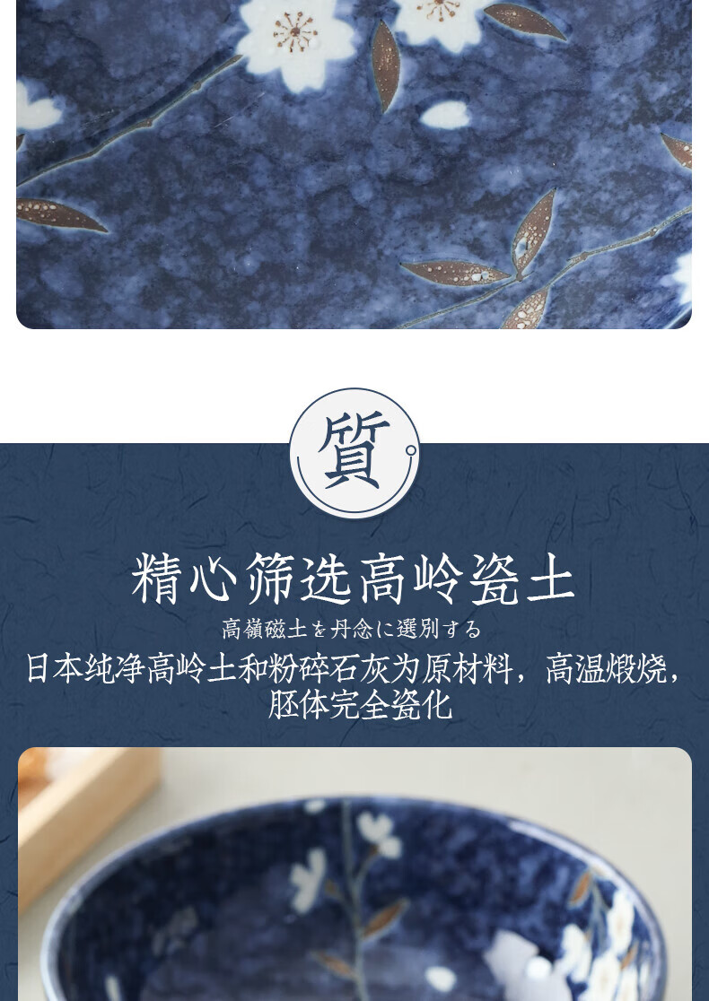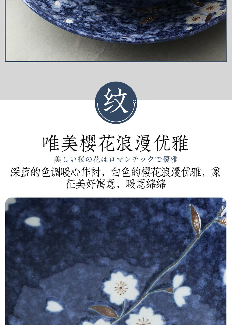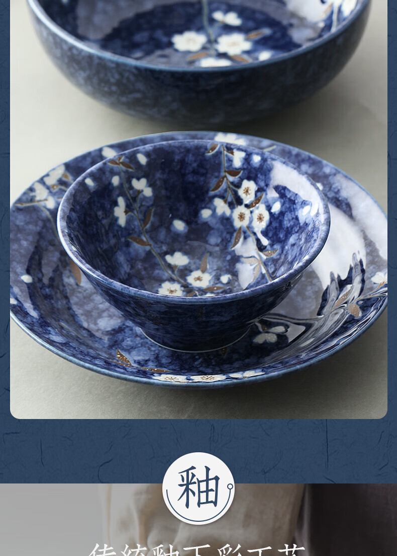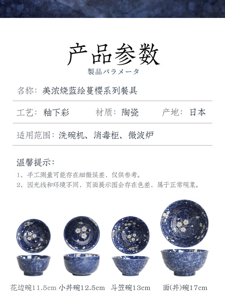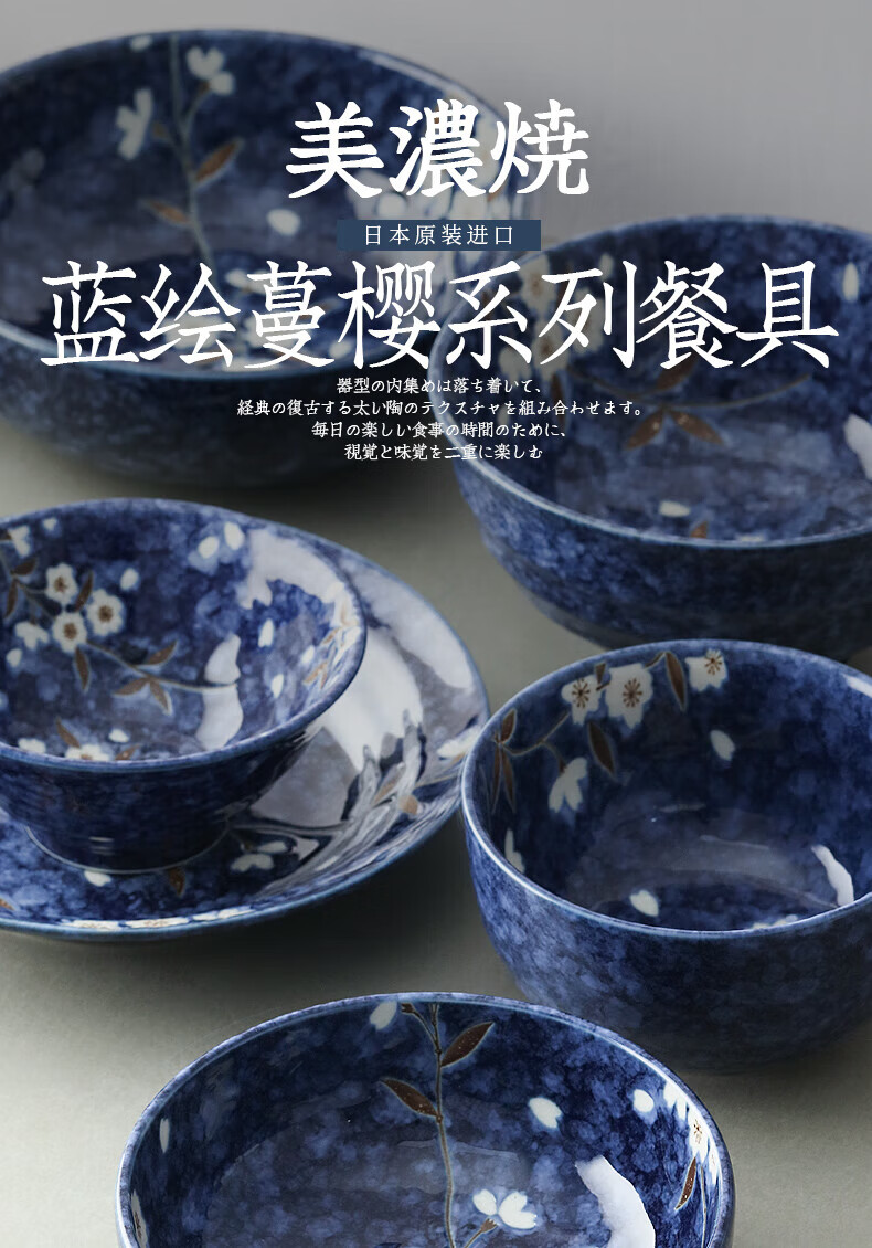 Lucky Lychee Japan imported Mino-yaki indigo painted cherry blossom ceramic bowl dipping saucer fruit plate soup noodle bowl rice bowl Japanese tableware bowl 19.5cm 1 head