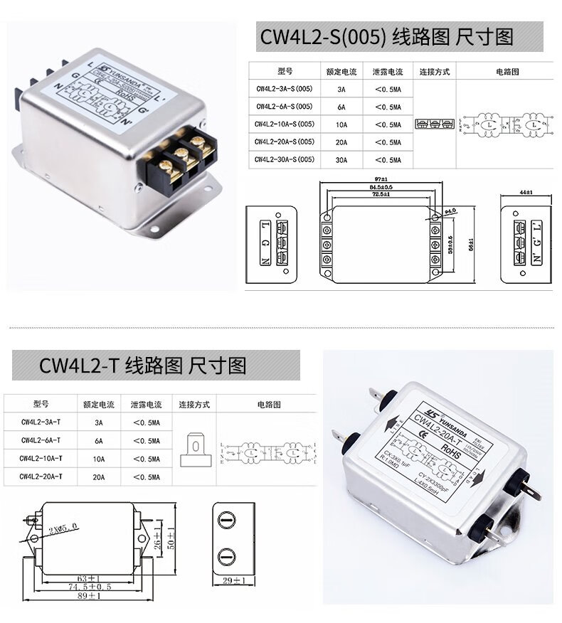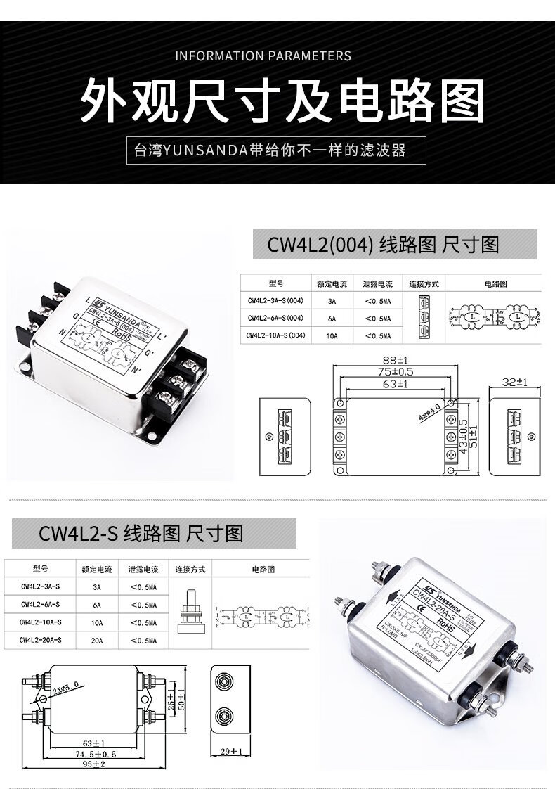YUNSANDA power filter 220v AC emi filter power purifier anti-interference CW4L210A CW4L2-10A-T insert interface