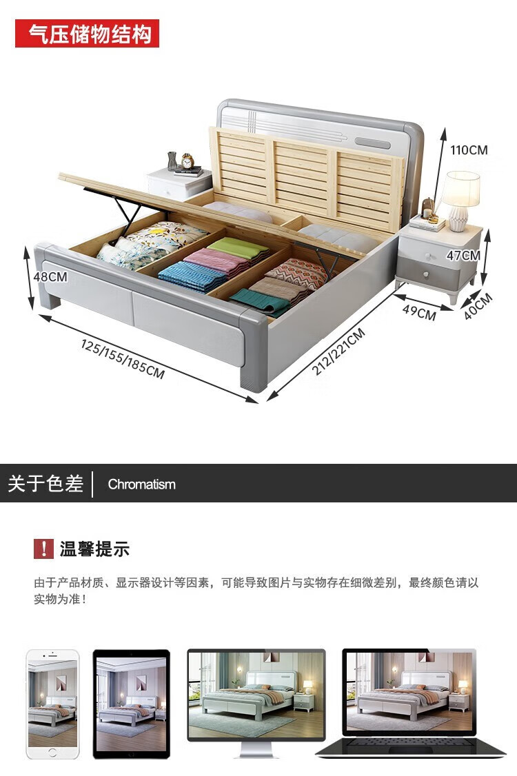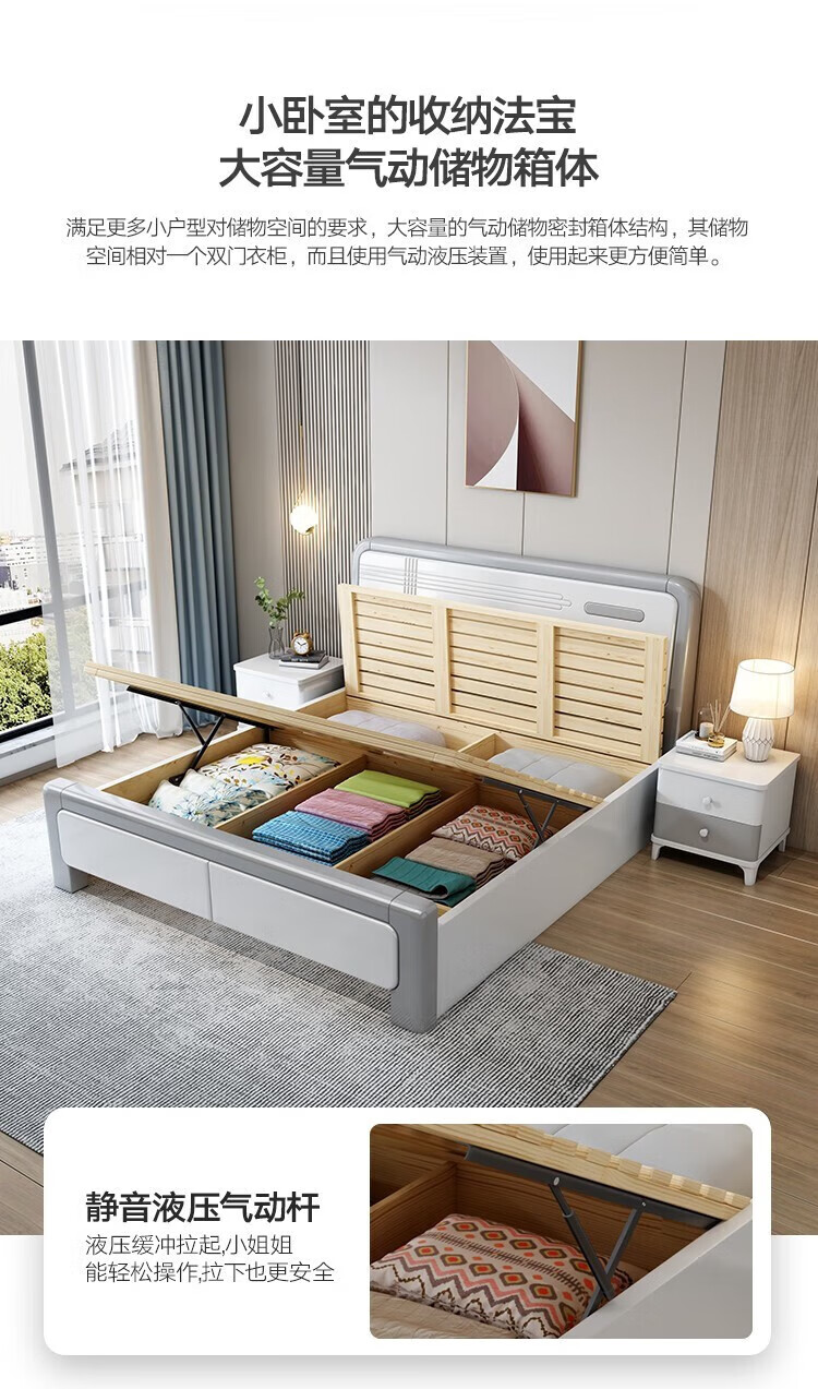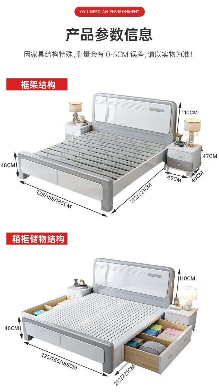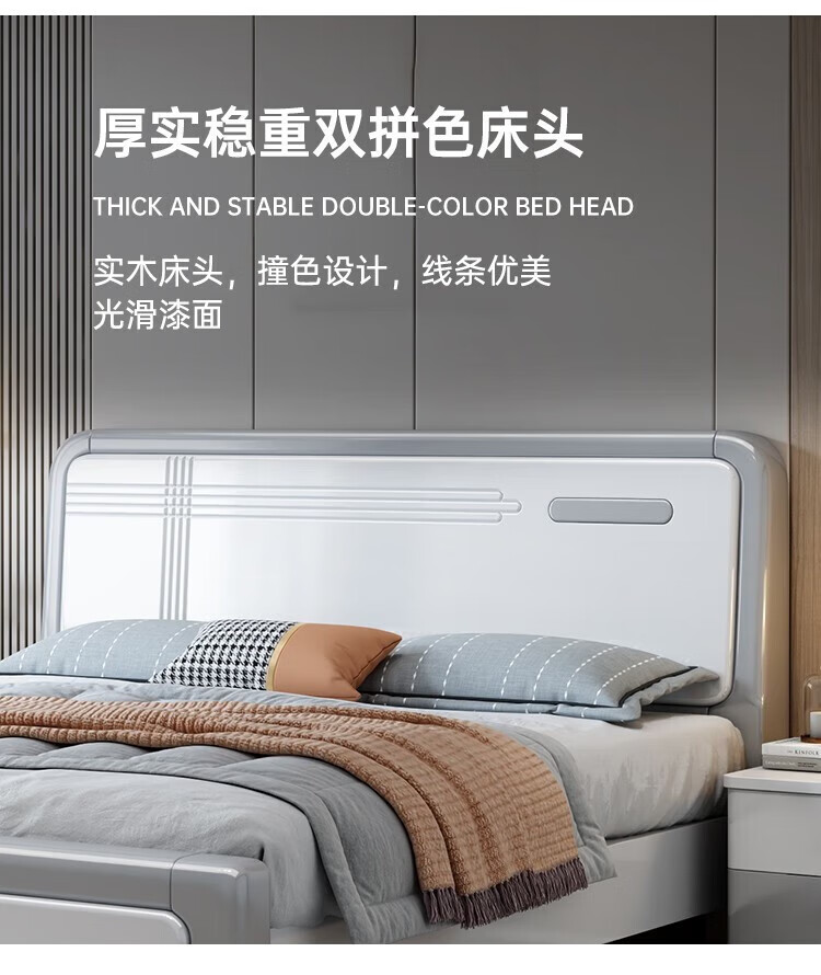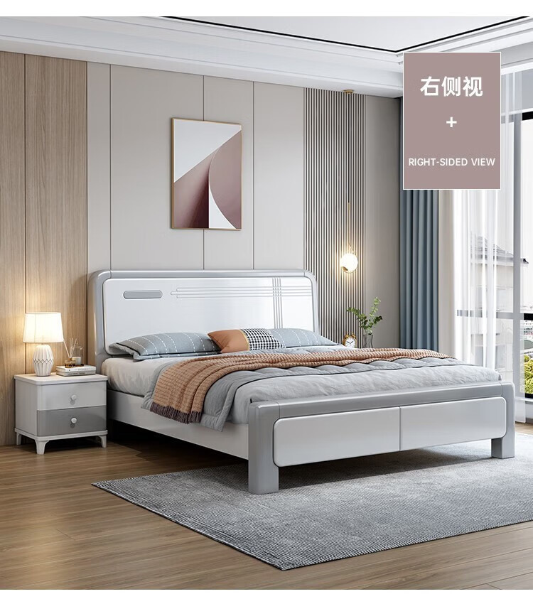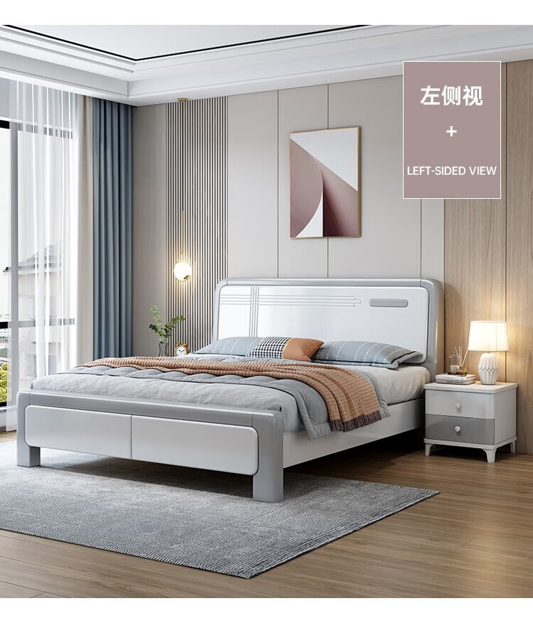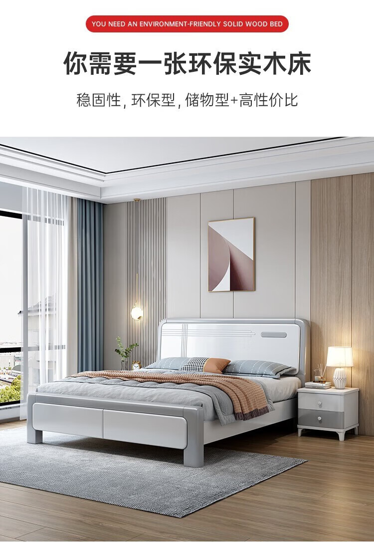 First year all solid wood bed light luxury bed modern simple master bedroom double bed white high box storage wedding bed bedroom furniture silent bed + bedside table * 1 + Tencel latex mattress 1.8 meters * 2 meters frame style