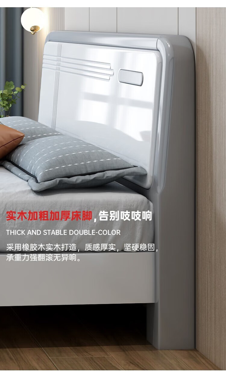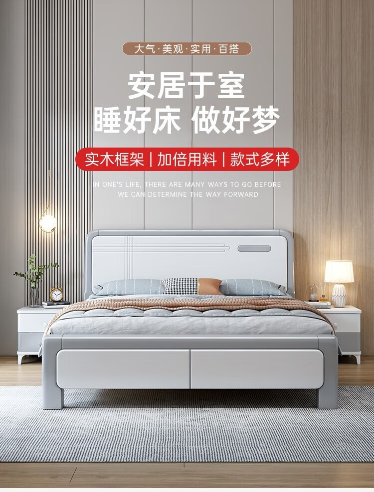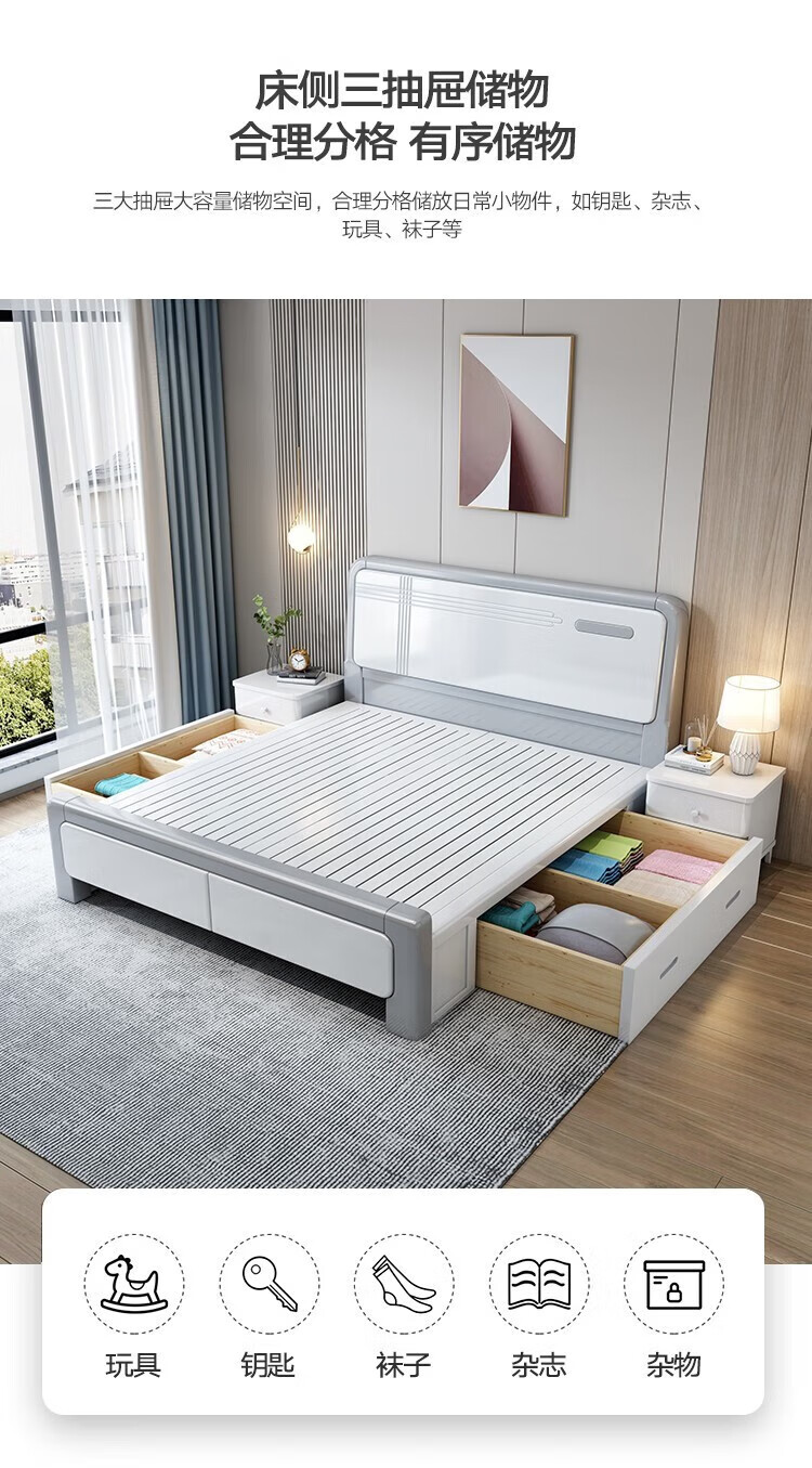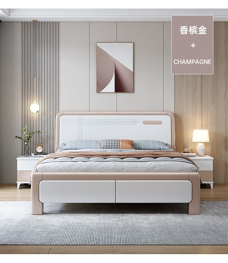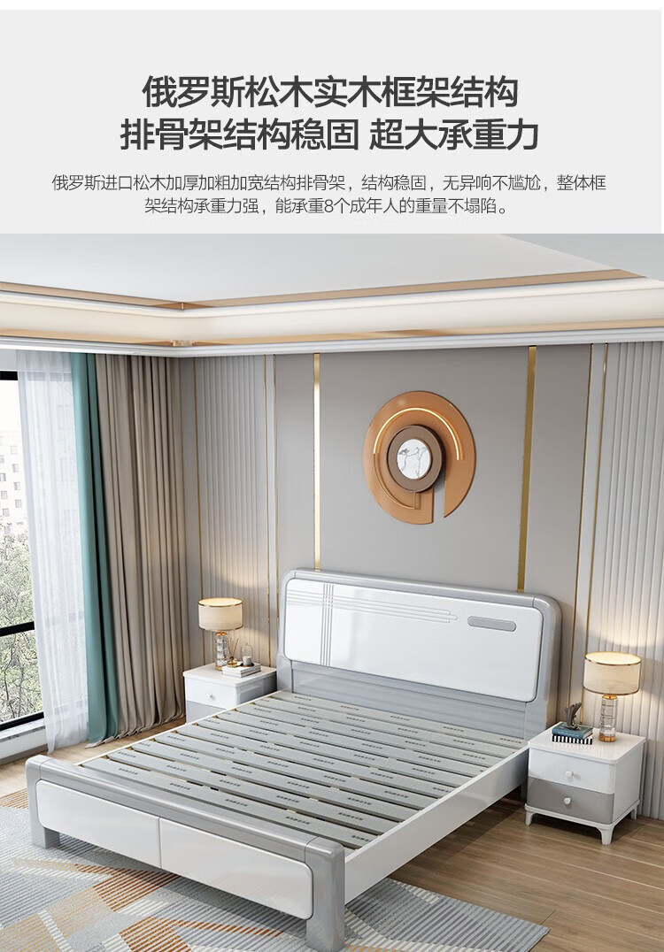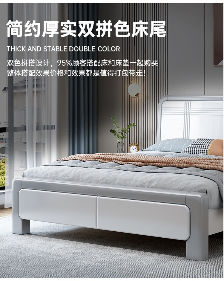 First year all solid wood bed light luxury bed modern simple master bedroom double bed white high box storage wedding bed bedroom furniture silent bed + bedside table * 1 + Tencel latex mattress 1.8 meters * 2 meters frame style