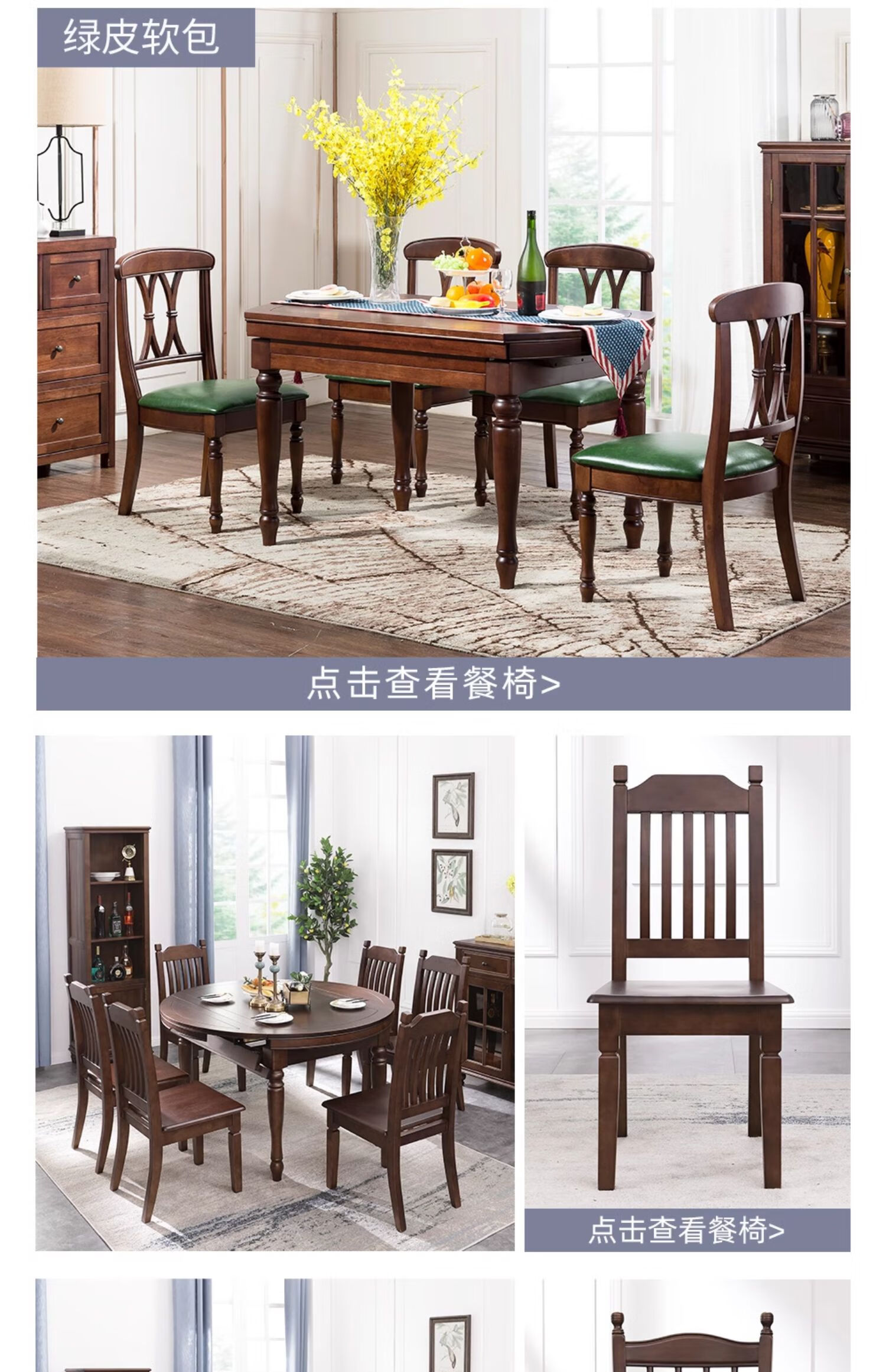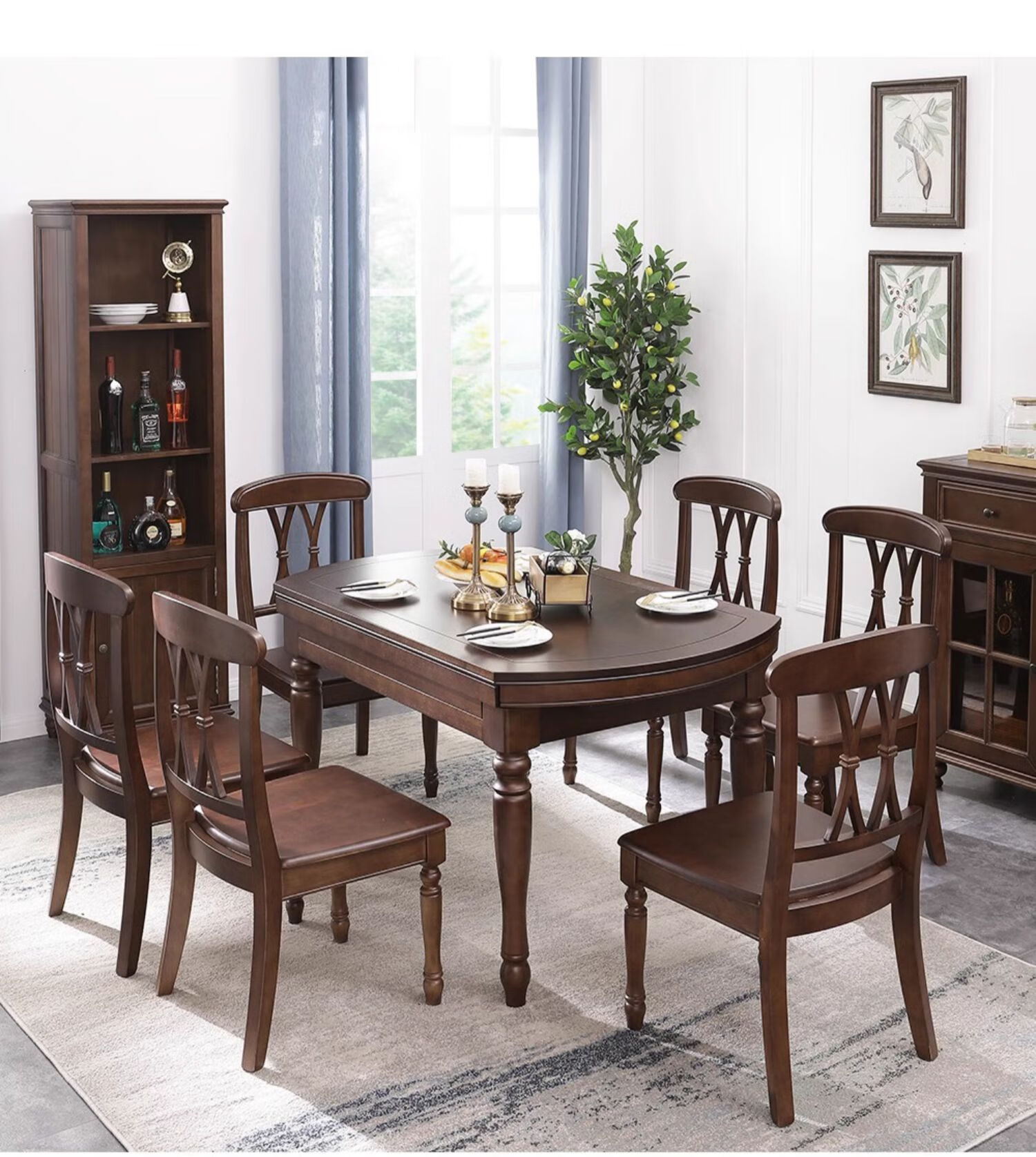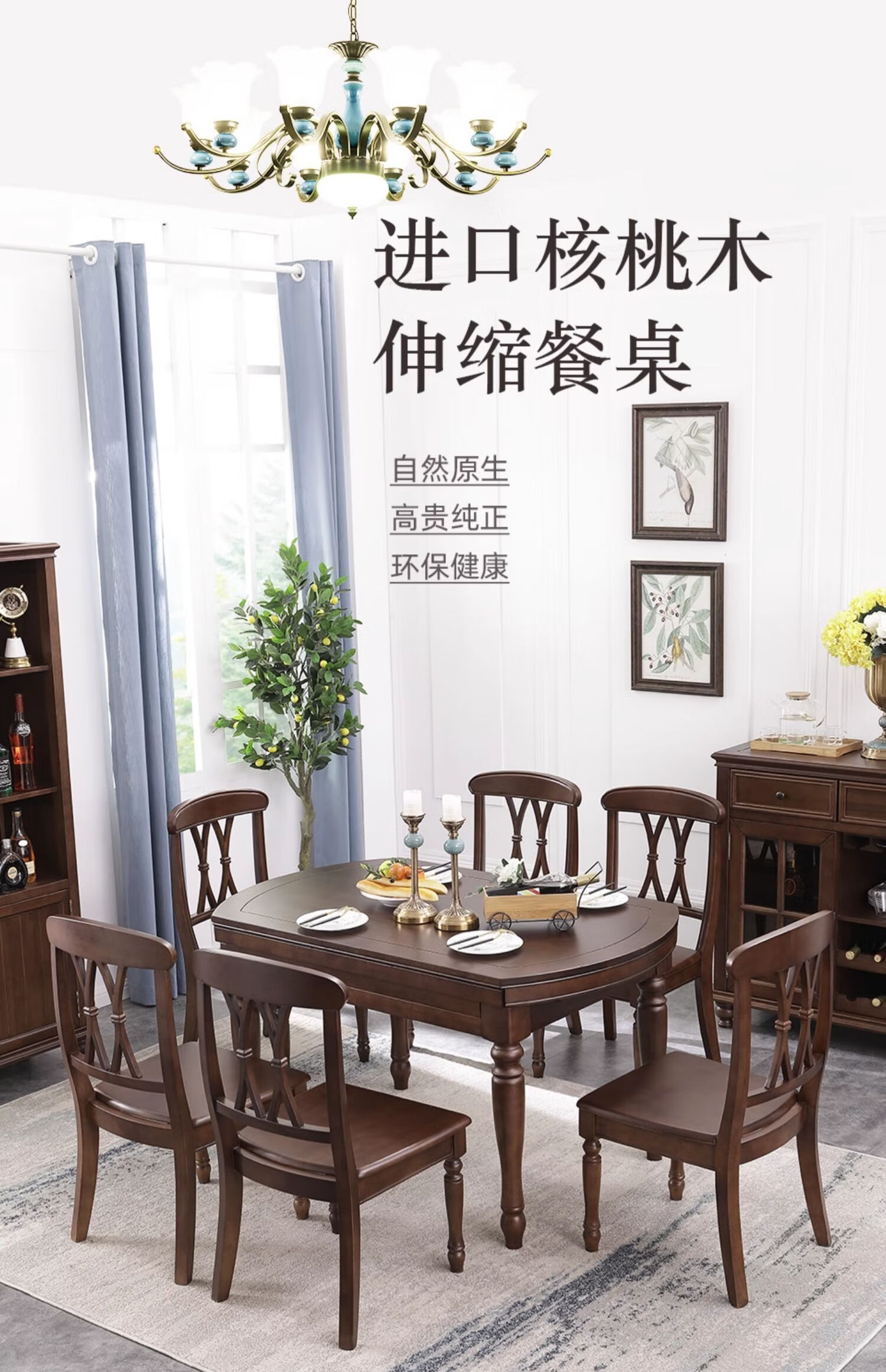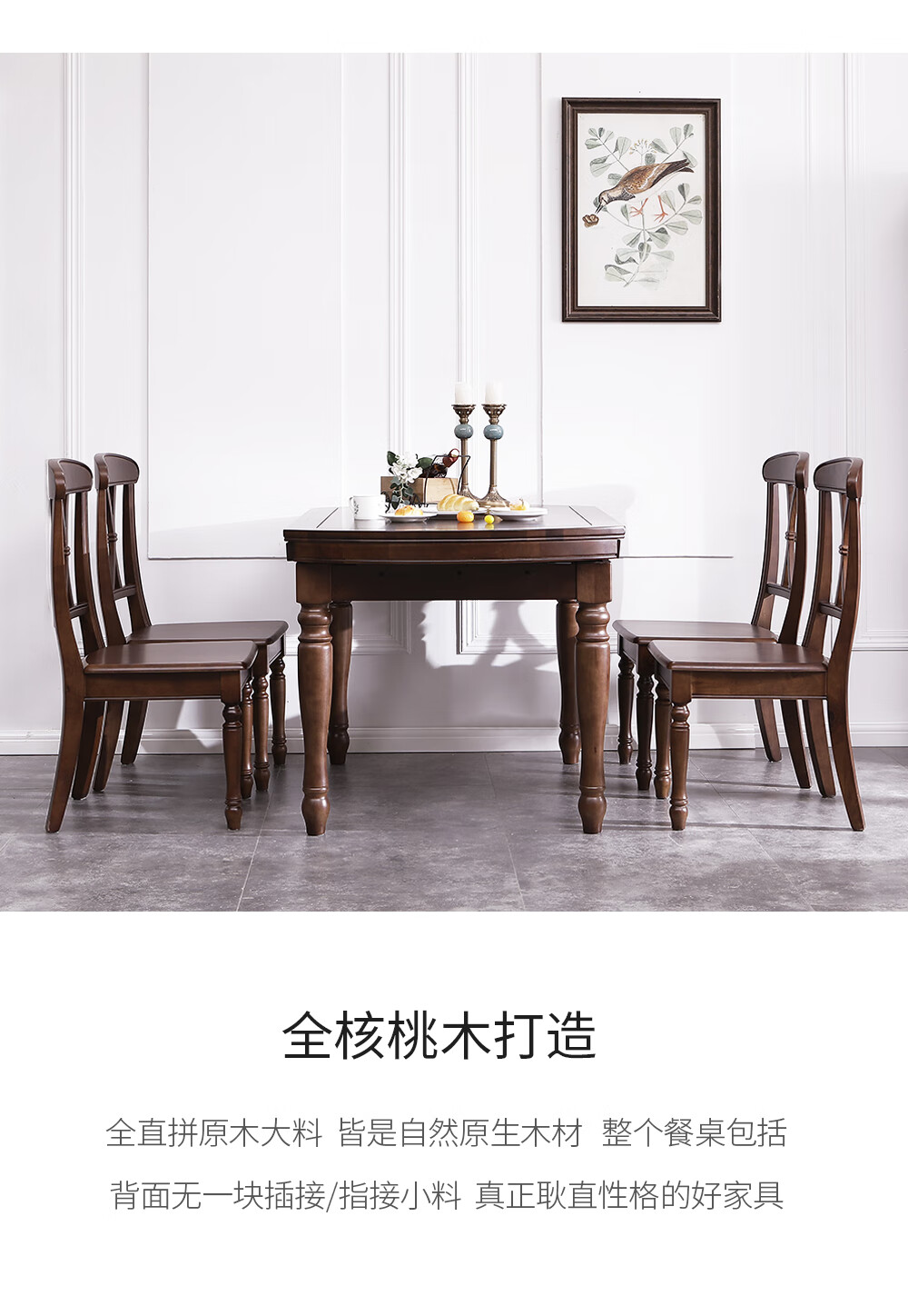 One American country all solid wood dining table retractable folding table small American retro restaurant home dining table one table four hard chairs solid wood guide rail 1.35M