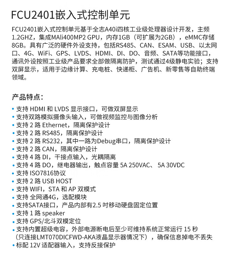FCU2401 Feiling embedded industrial computer ARM Linux Allwinner a40i development board gateway charging pile standard (WIFI, GPS & Beidou)