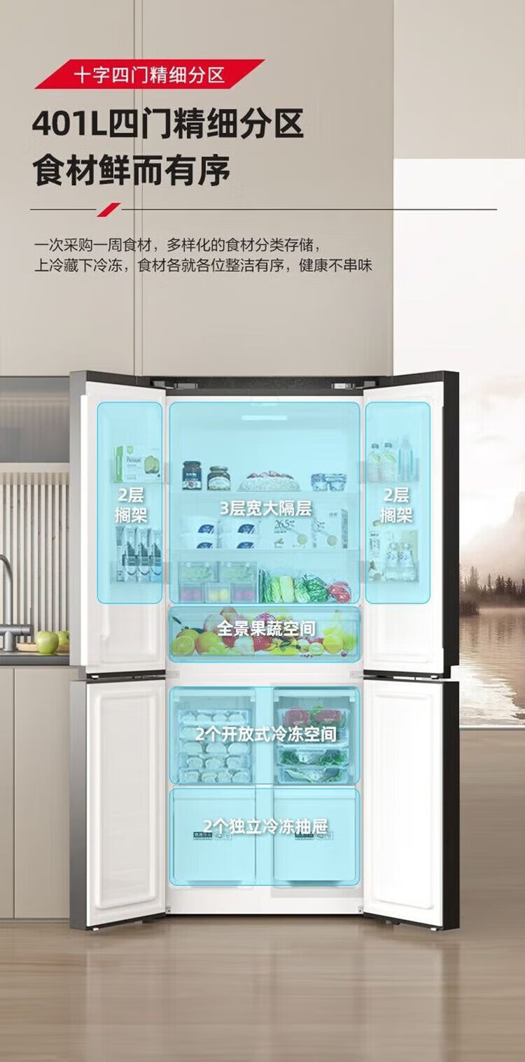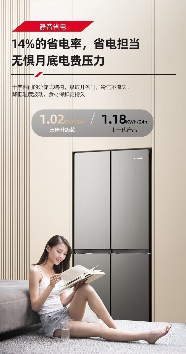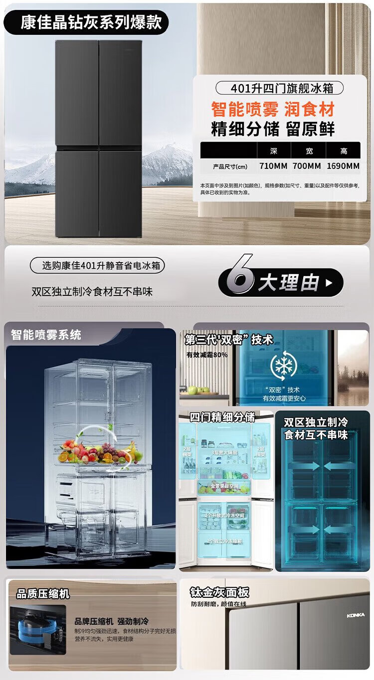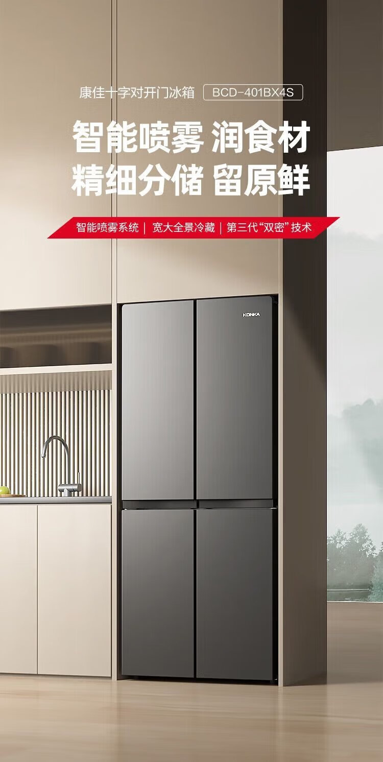 Konka 409 liter cross double-open four-door household refrigerator energy-saving fresh-keeping panoramic large-capacity refined storage intelligent spray system efficient moisturizing old-for-new 4G40IC