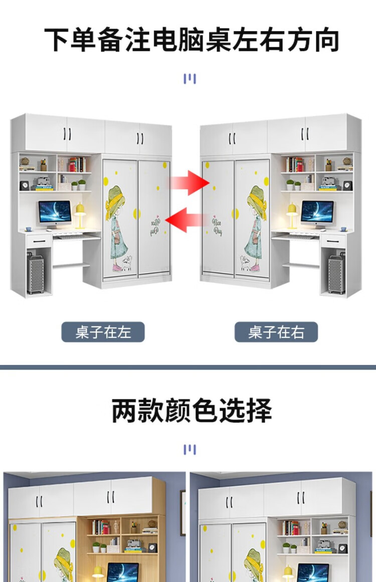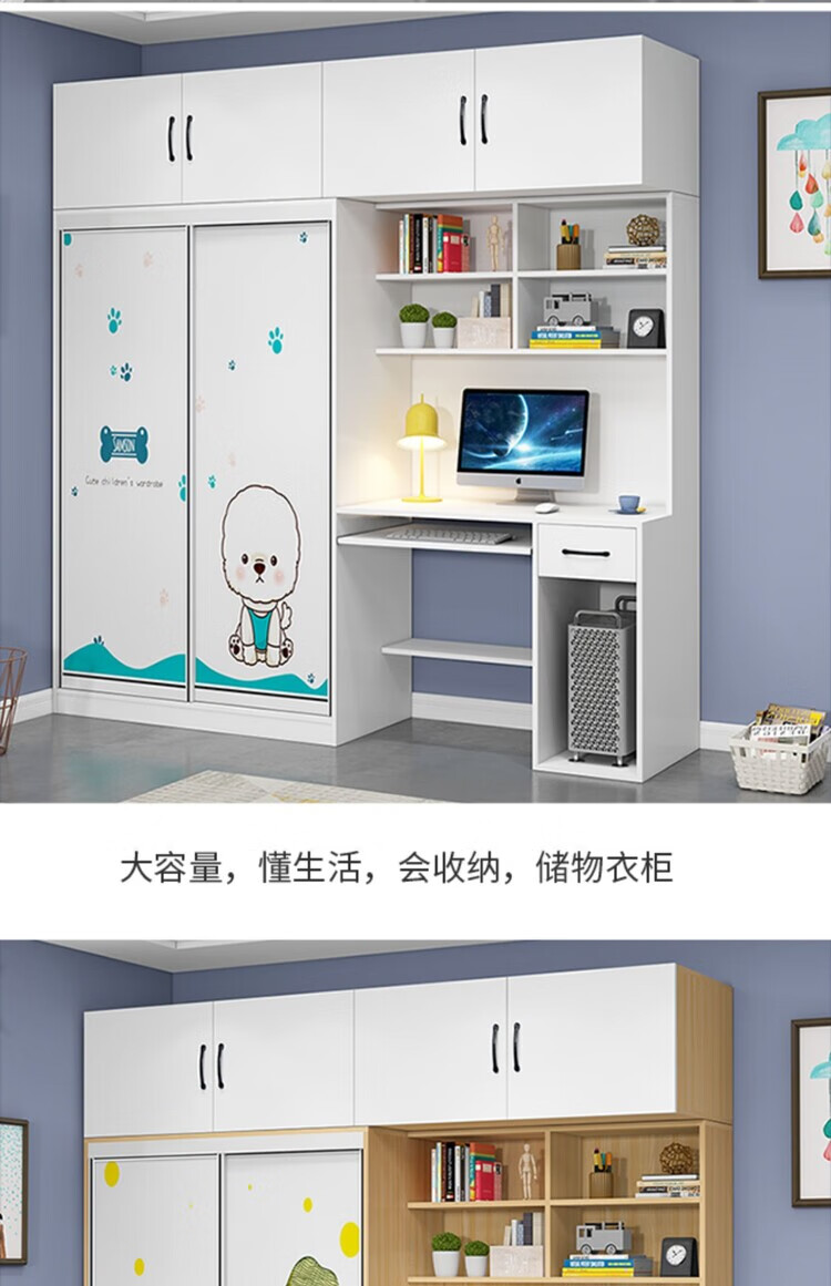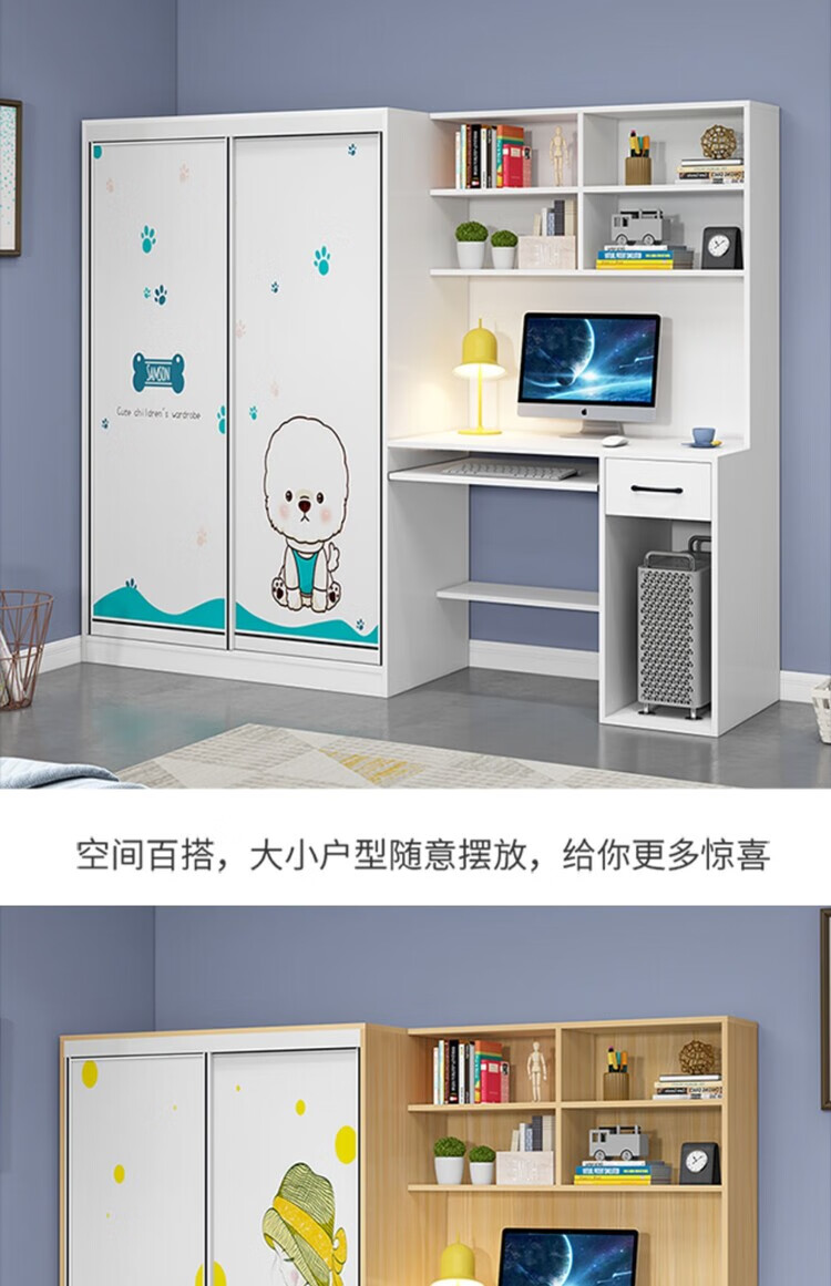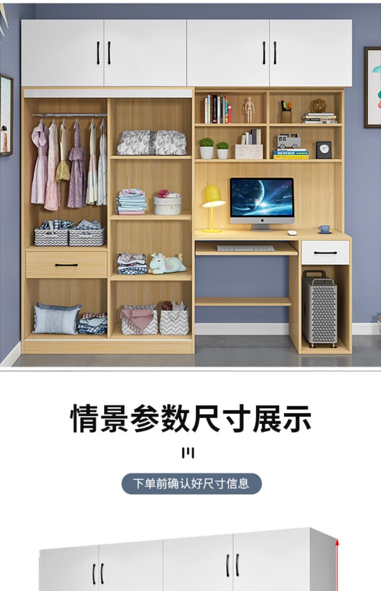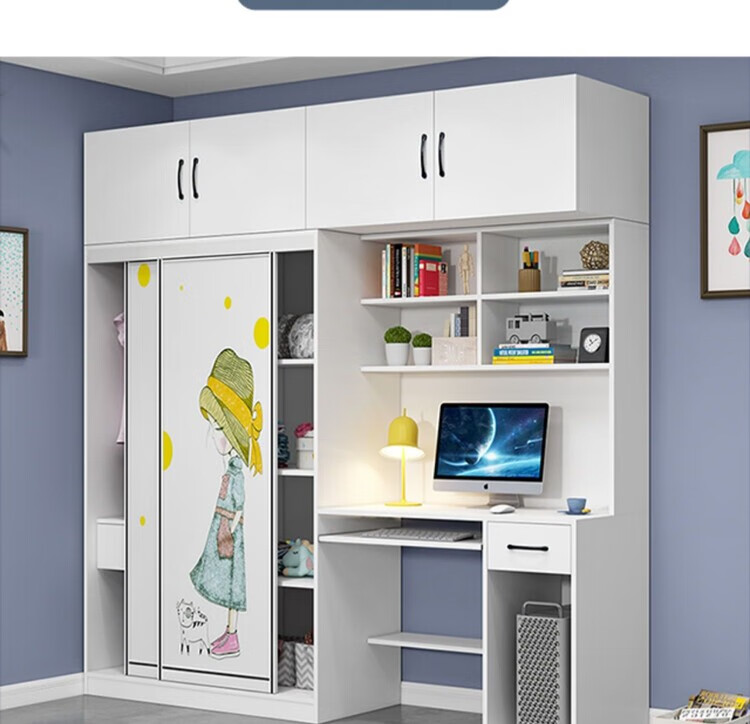 Small bedroom wardrobe with study table desk bookshelf computer desk combination solid wood sliding door integrated corner dressing table total length 1.6 meters (80 wardrobe + 80 table + top cabinet) white