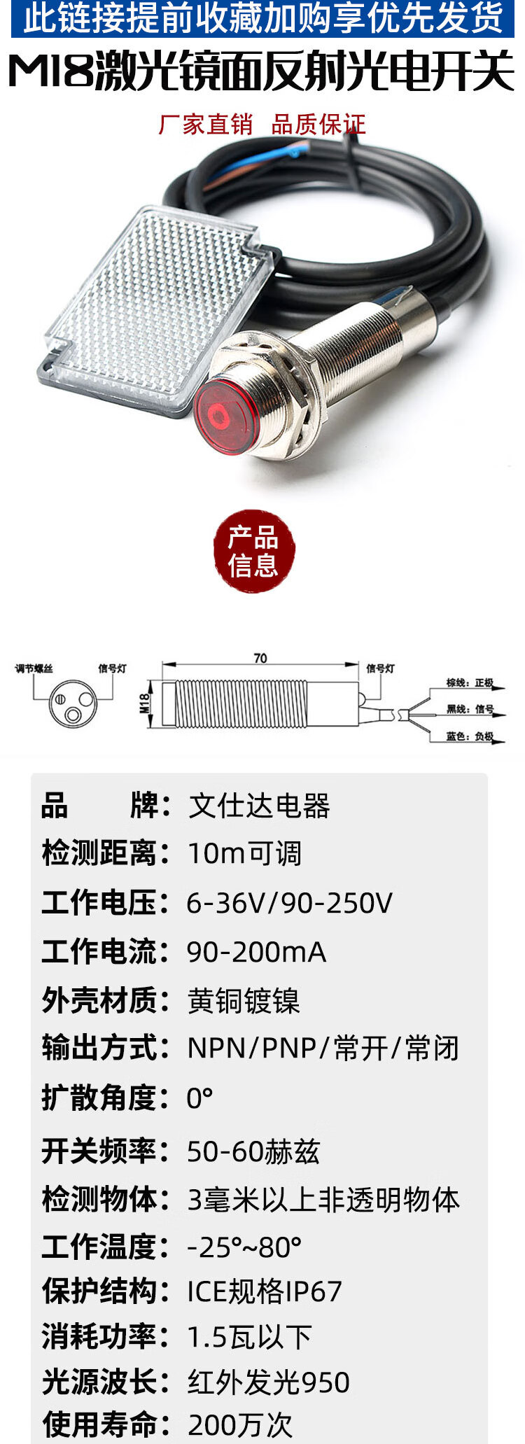 Laser mirror feedback reflective photoelectric switch long distance 15M three-wire NPN induction reflective sensor laser switch with reflective plate 10 meters three-wire PNP normally open 10-30V