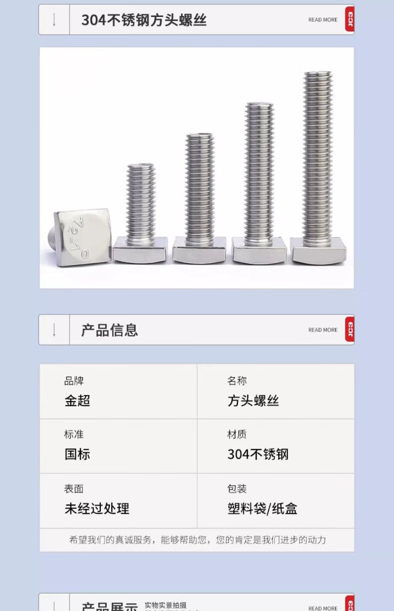 Jinchao 304 stainless steel GB35 square head bolt small square head screw square screw square screw M5M6M8 M10*45 (1 piece)