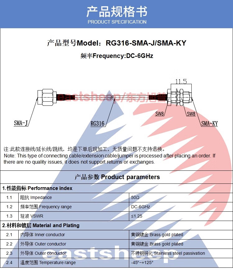 Dongfang Xupu RG316 RF connection jumper SMA-JK stainless steel SMA male to female with nut fixation RG316-SMA-J/SMA-KY 0.1m