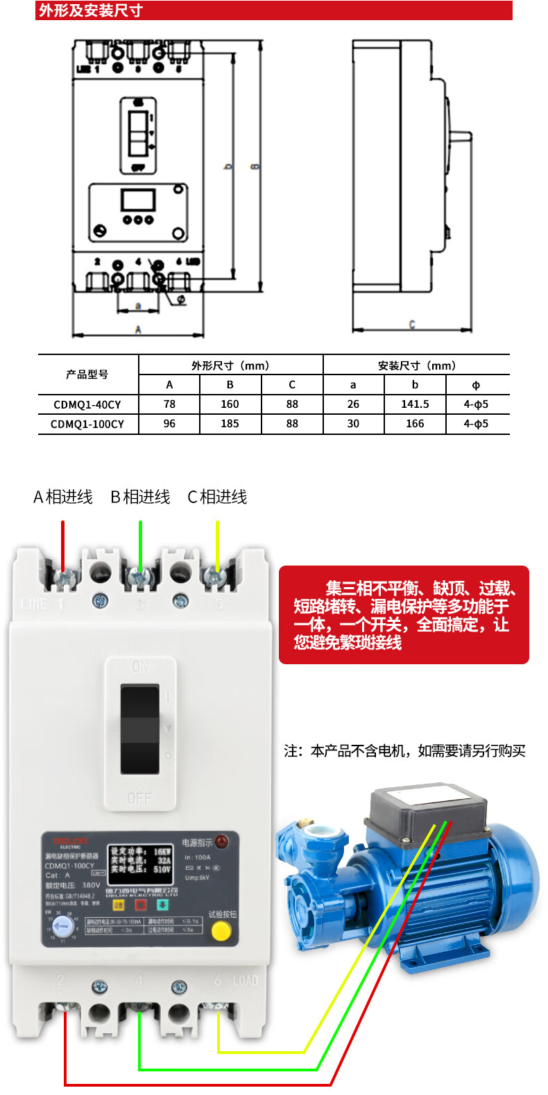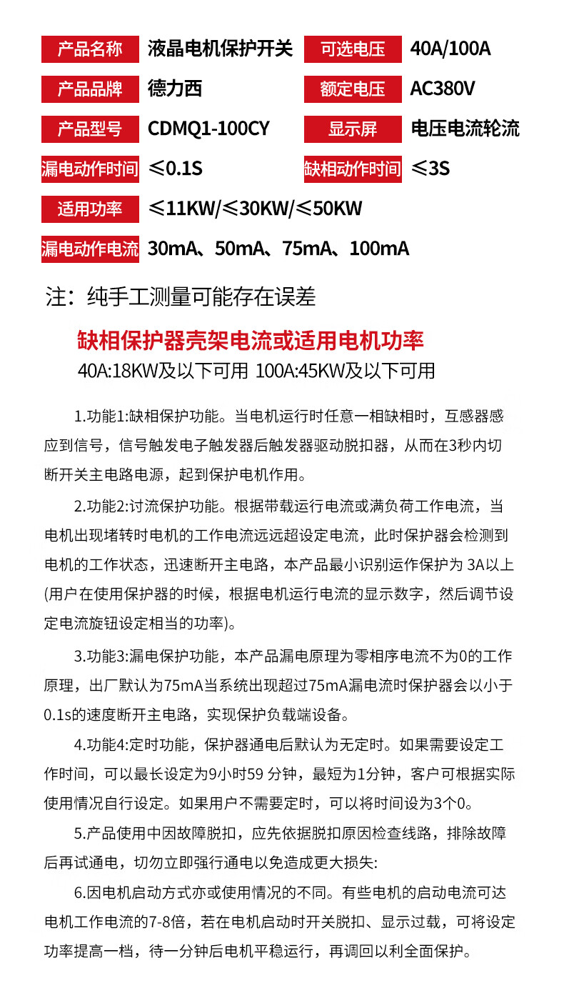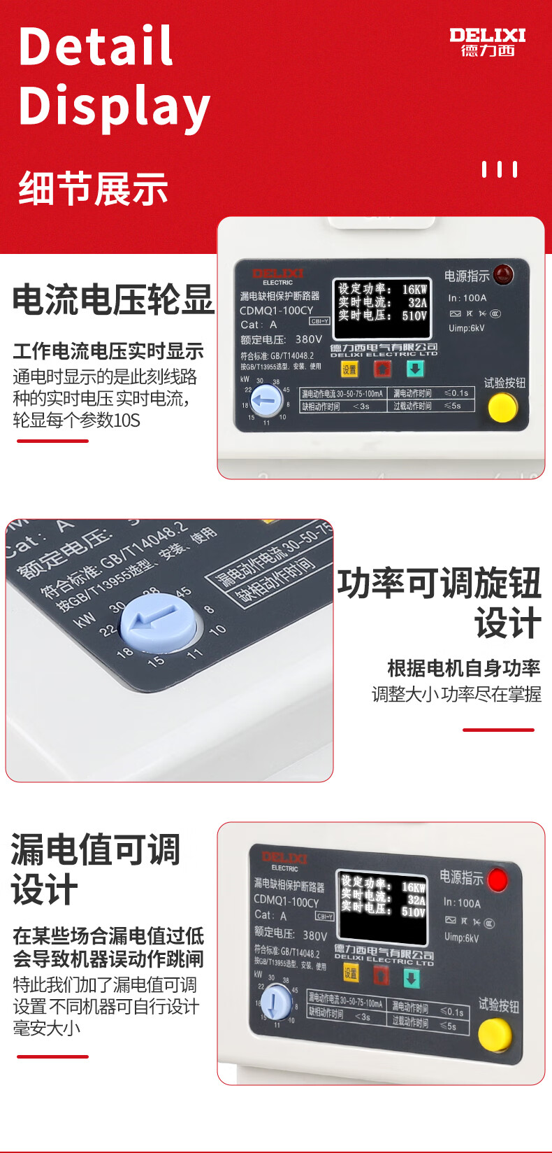 LCD three-phase phase loss protector 380v water pump overload switch 40A motor fan leakage circuit breaker 40A 3P