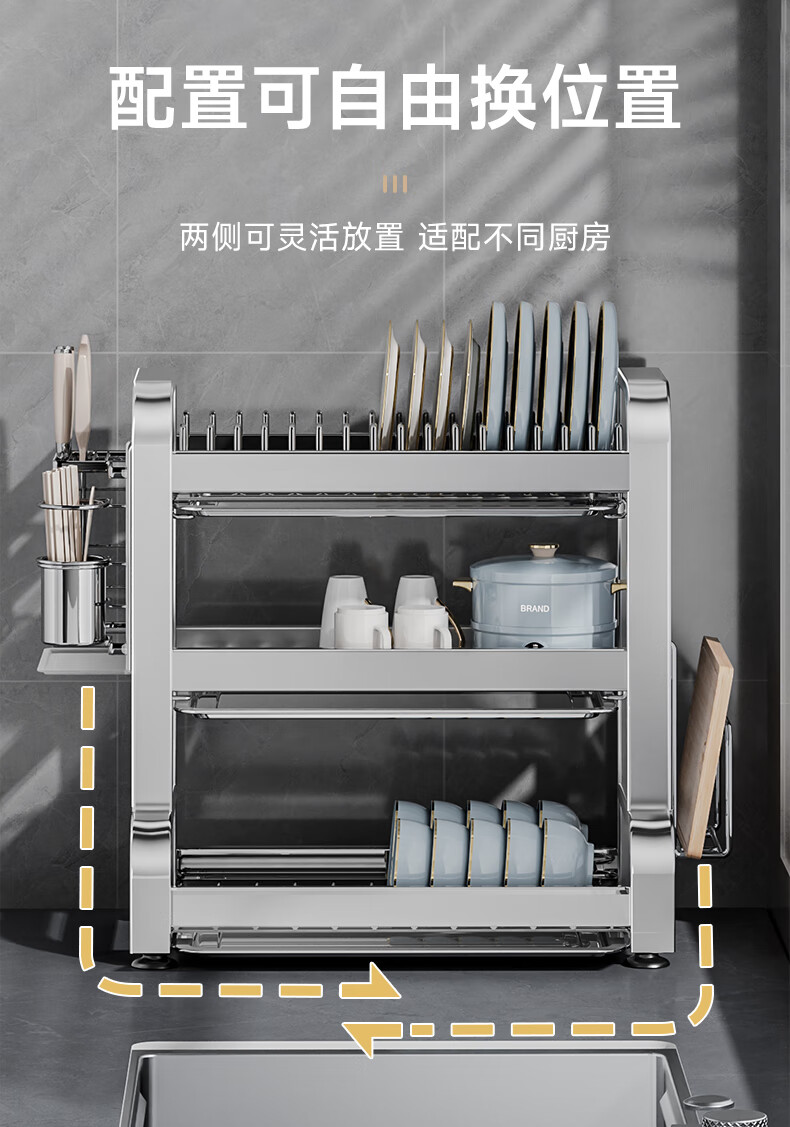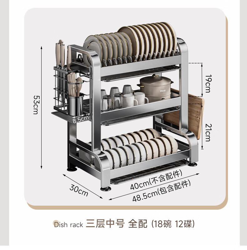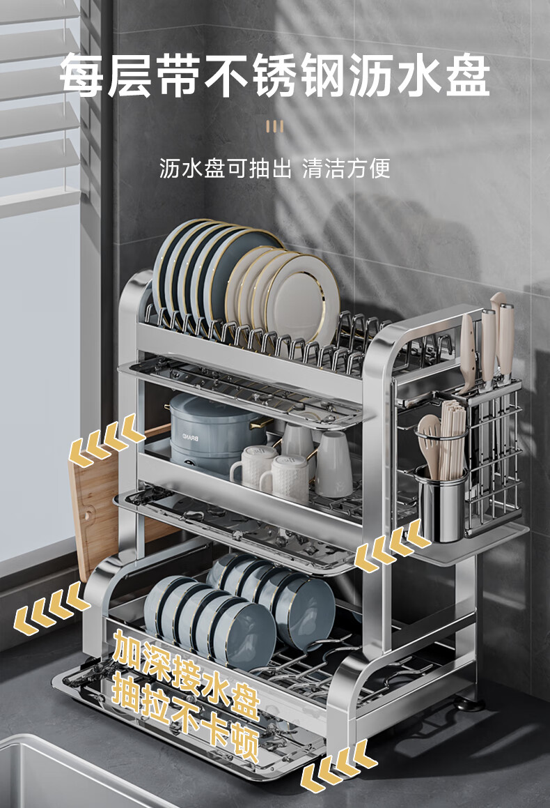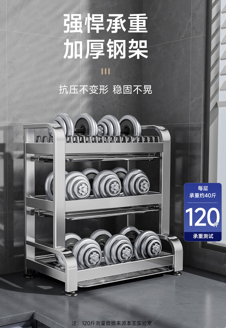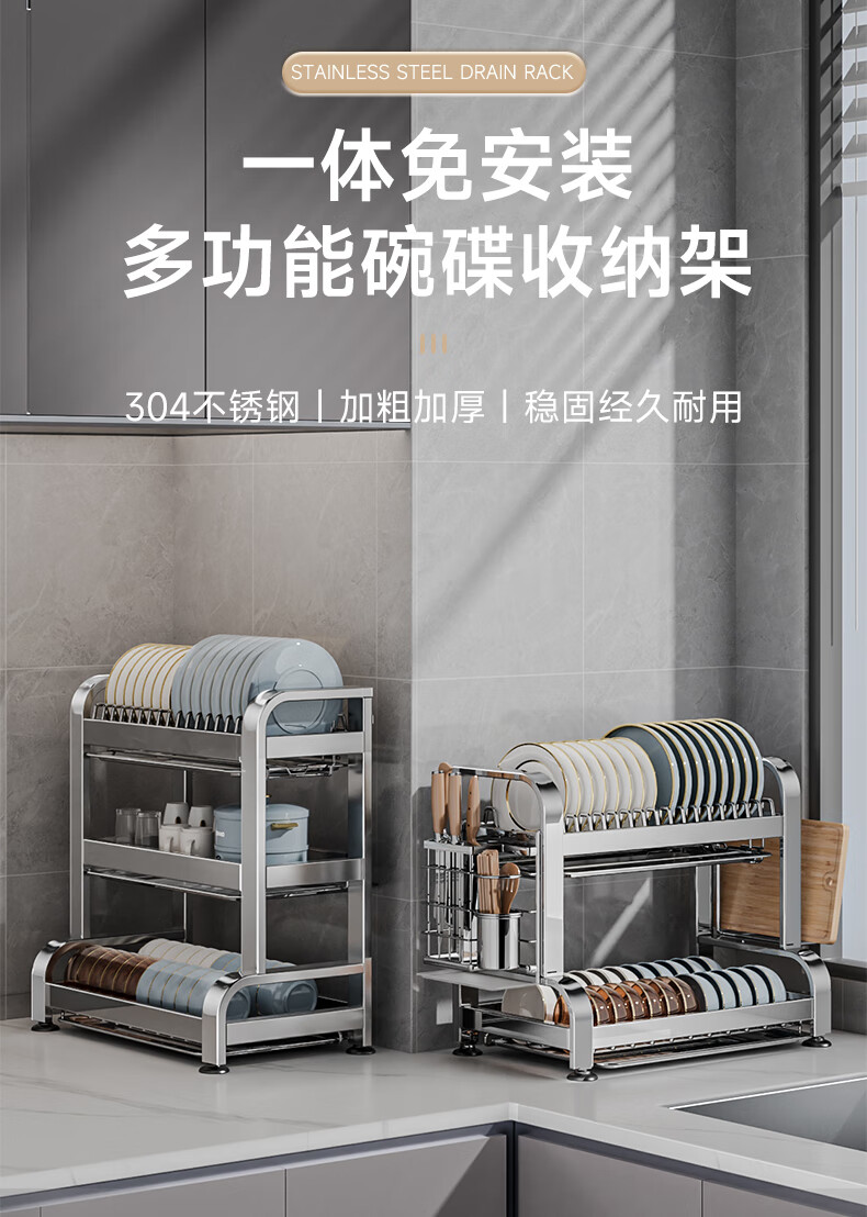 Submarine 304 stainless steel kitchen rack dishware drainer household multi-functional dish rack dishware storage cupboard B8 304 gun gray three-layer 50CM + fully equipped