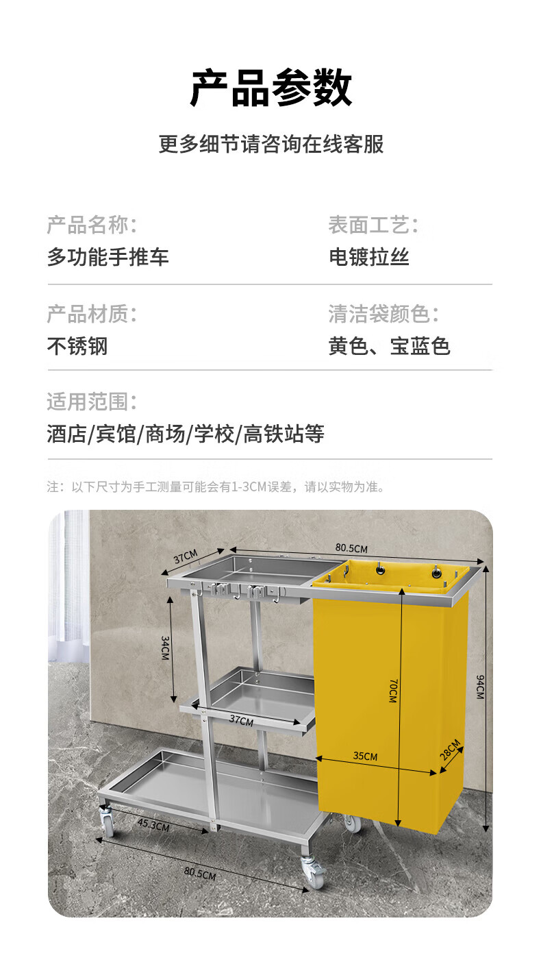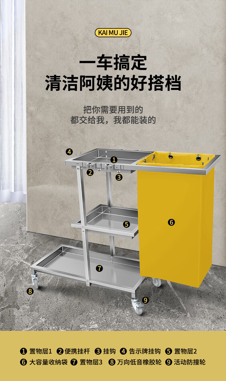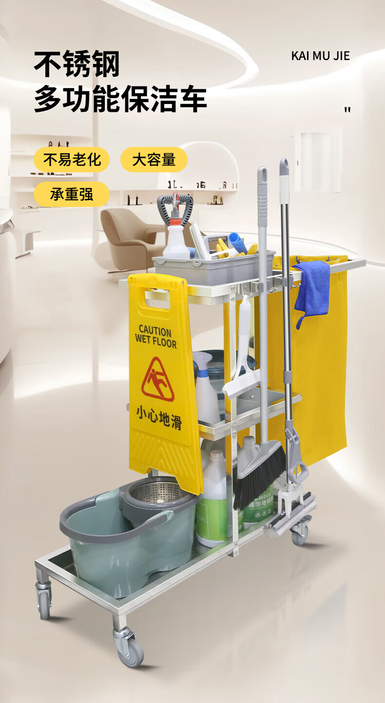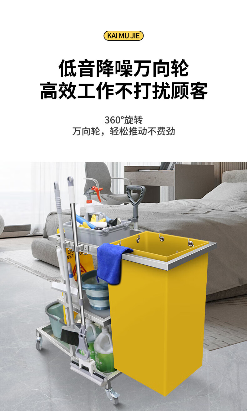 Kaimujie stainless steel cleaning cart cleaning trolley hotel room multi-functional linen cart property cleaning special KC-01 double hook royal blue bag