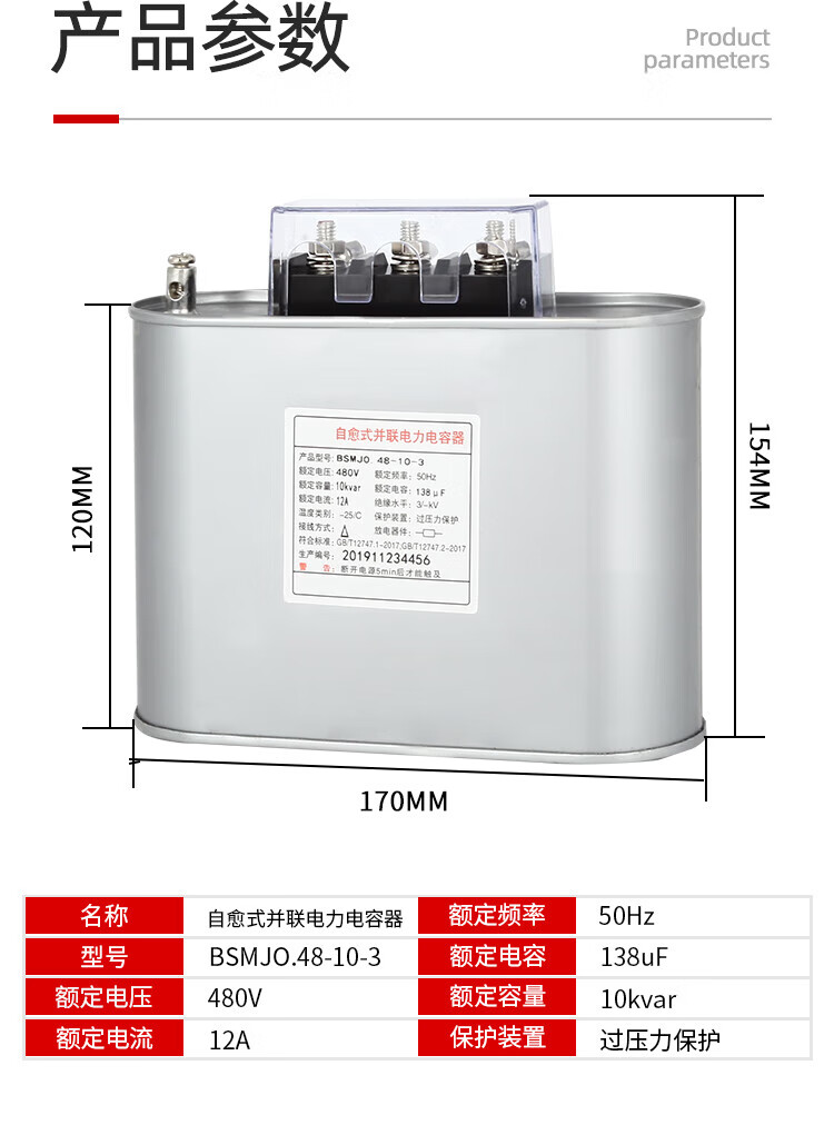 Capacitor BSMJ0.45-10-3 5 15 20 25-3 three-phase self-healing compensation parallel power capacitor BSMJ0.4-30-3