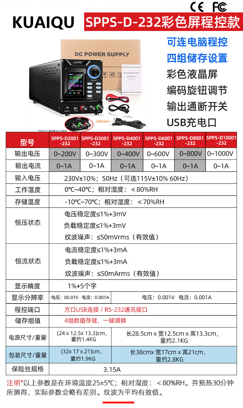 KUAIQU automated test DC power supply 400V800V computer communication program-controlled switching power supply high voltage adjustable power supply SPPS-D10001-232 1000V1A