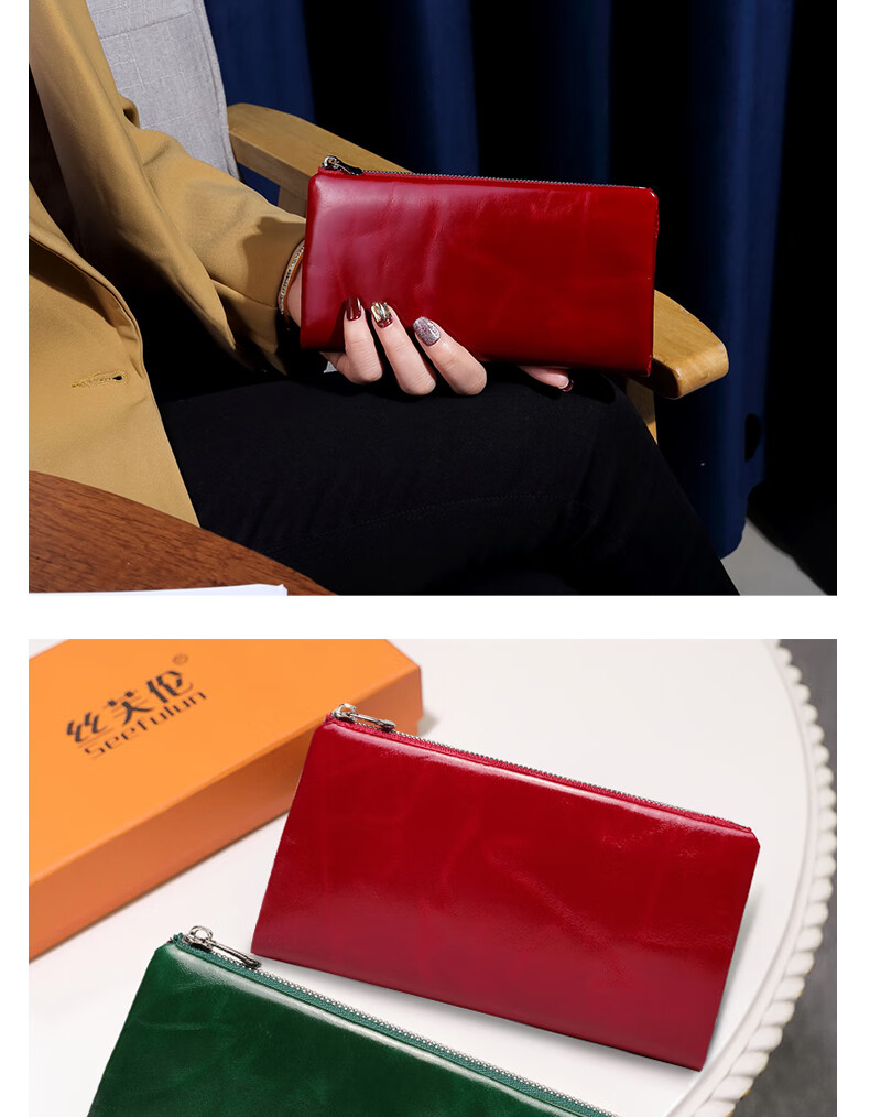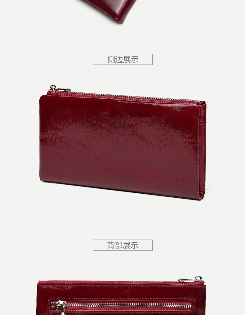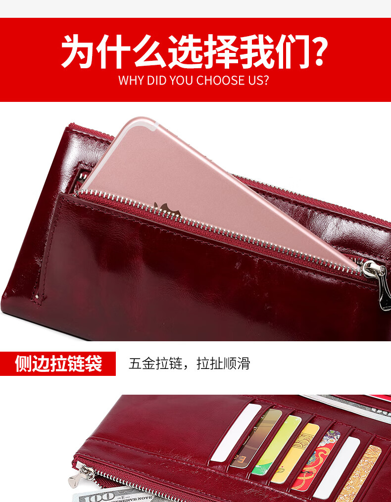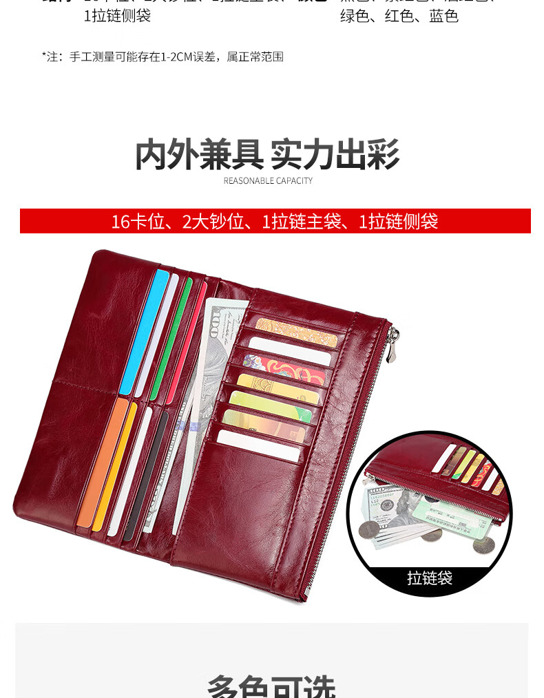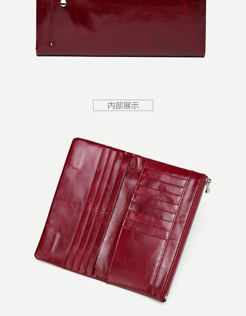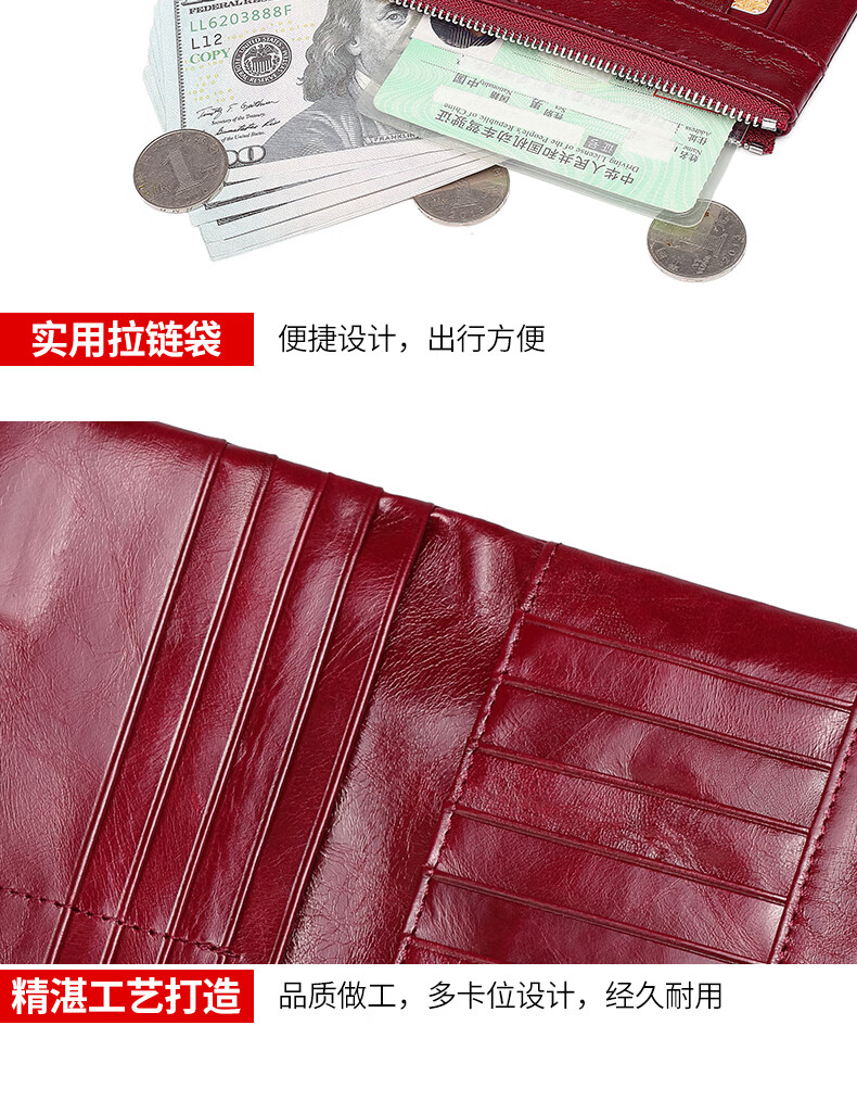 Sephoron New Year's Long Two-Fold Cowhide Wallet 16 Card Slots Large Capacity Large Bill Clip Zipper Coin Purse Ultra-Thin Wallet Burgundy - First-layer Cowhide Inside and Out