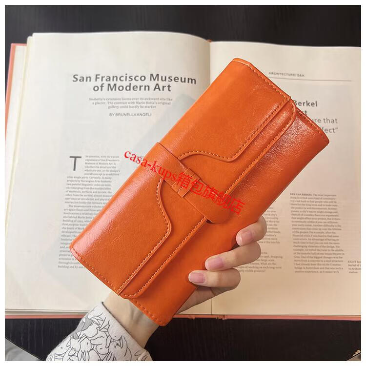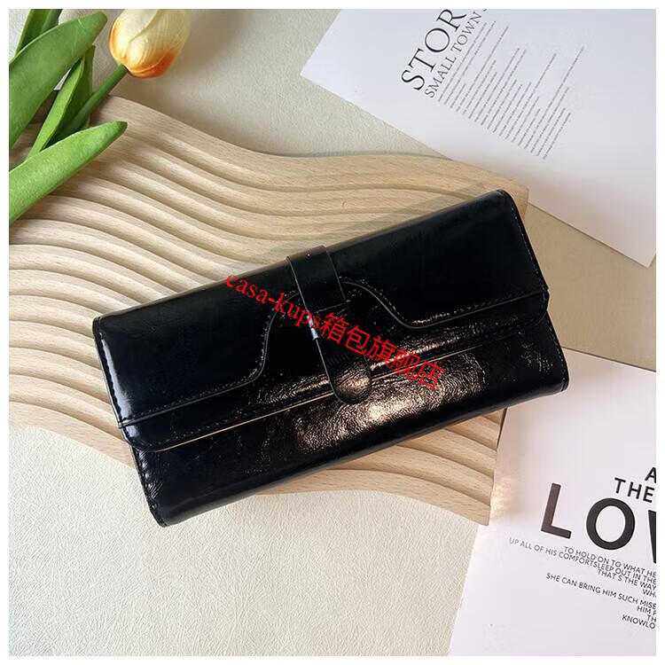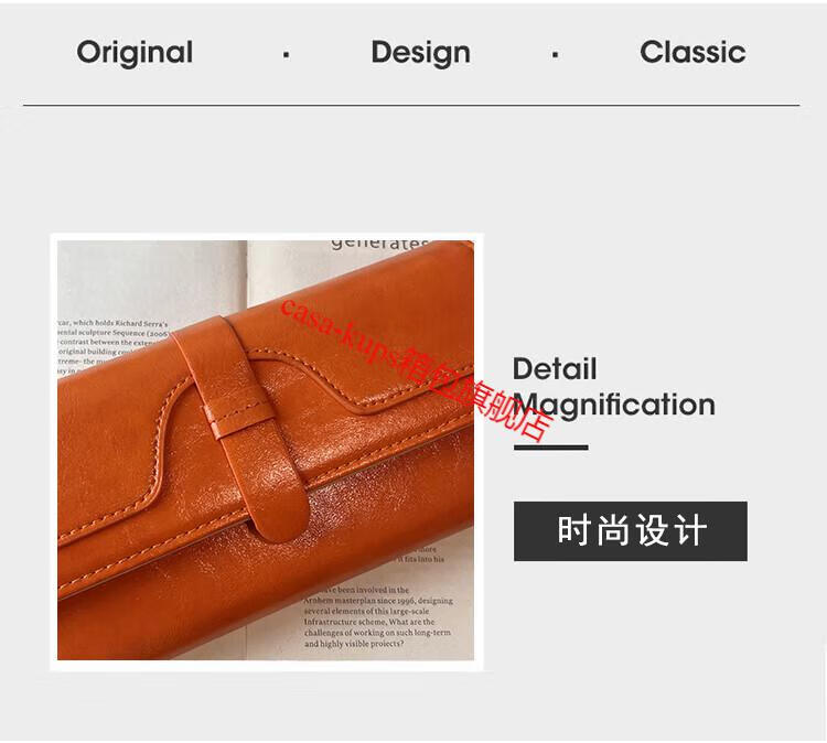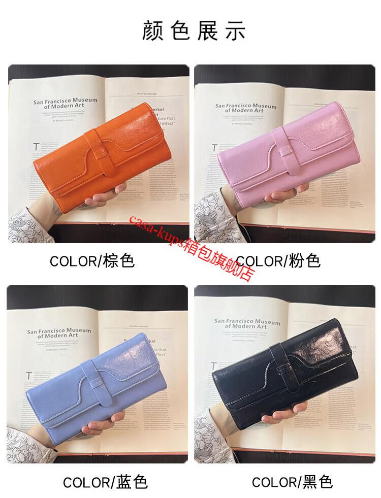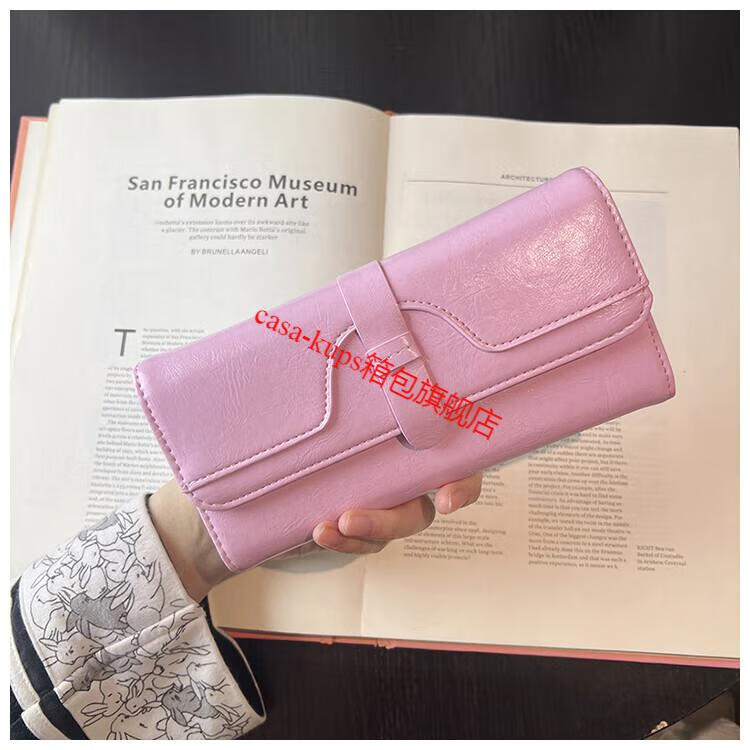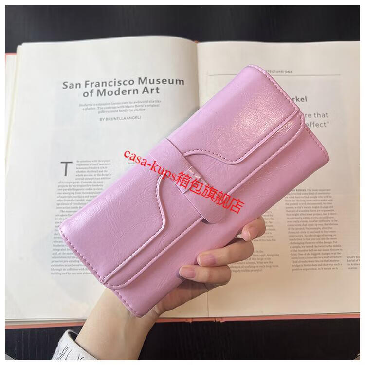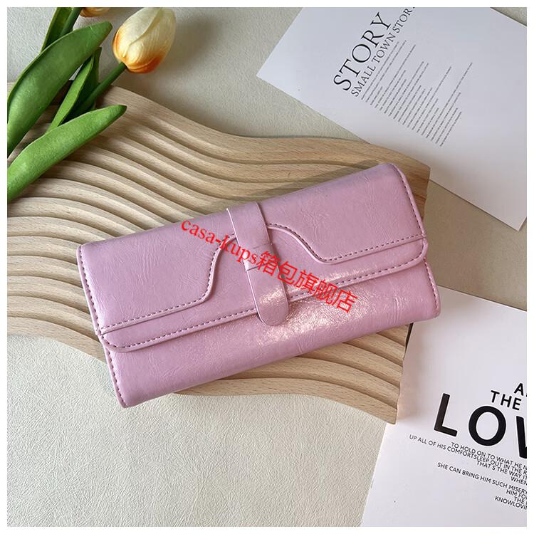 Casa-kupsCK women's bag light luxury simple women's wallet long clutch bag fashion oil wax leather three-fold buckle pure pink