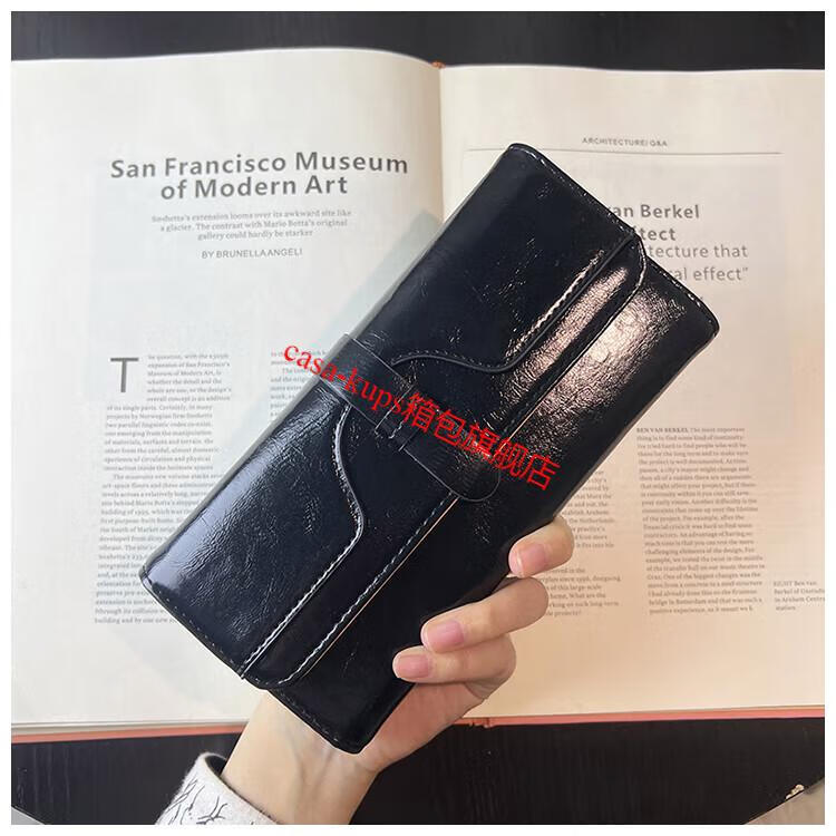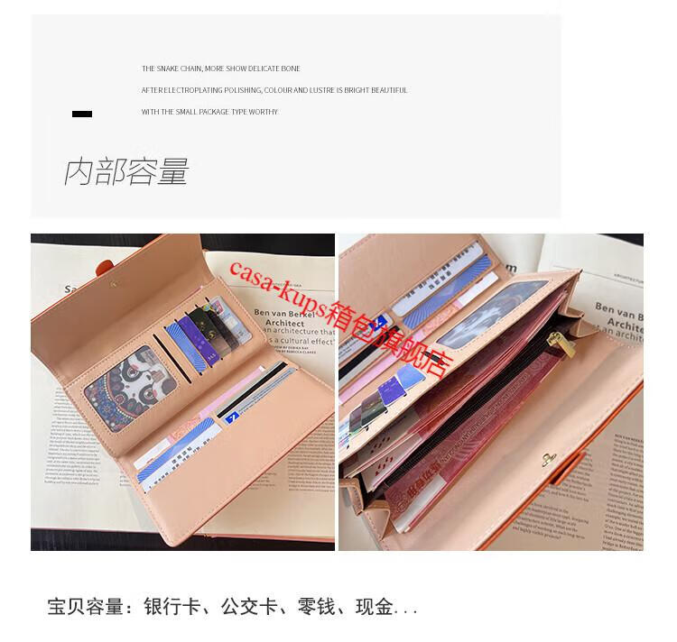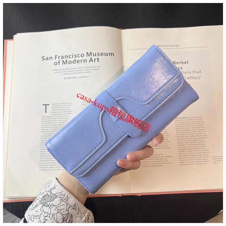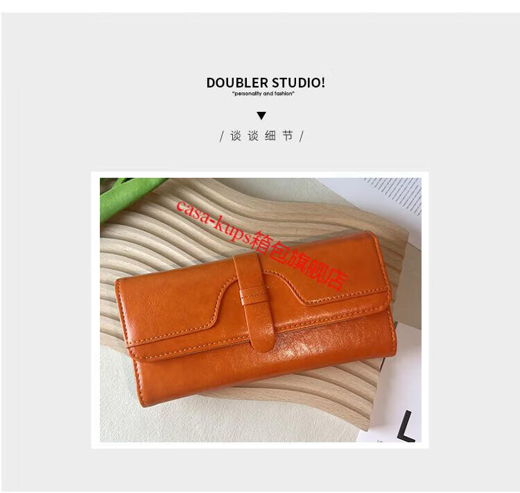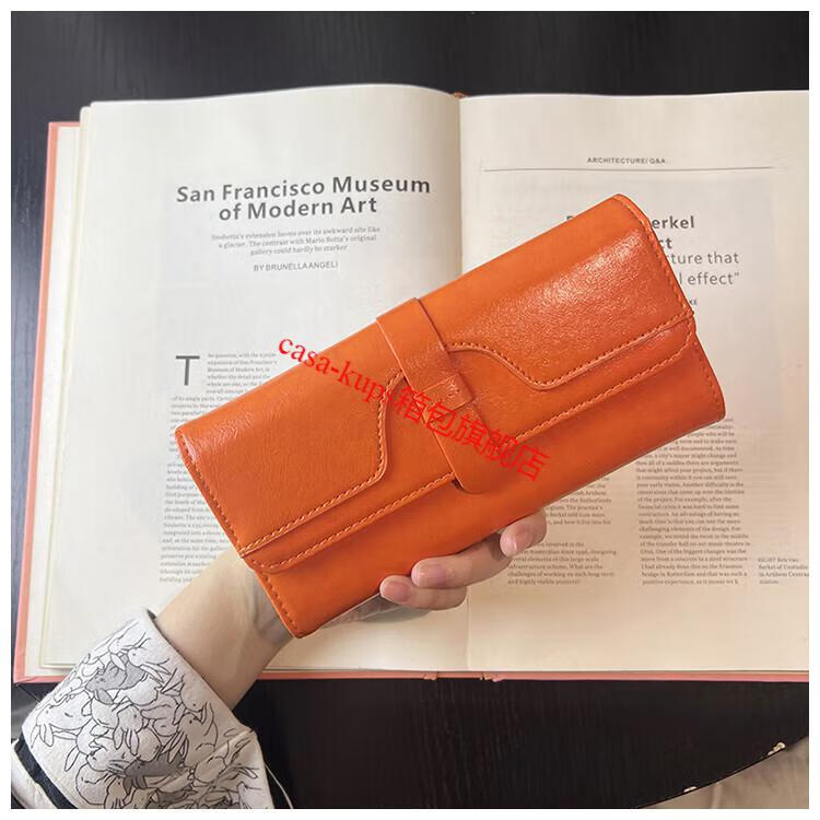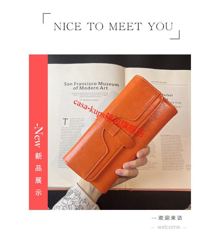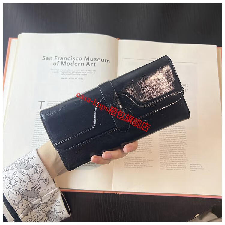 Casa-kupsCK women's bag light luxury simple women's wallet long clutch bag fashion oil wax leather three-fold buckle pure pink