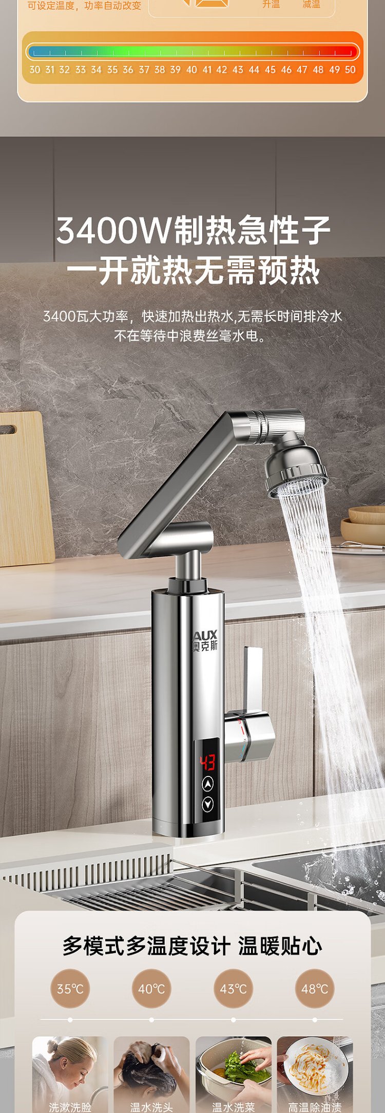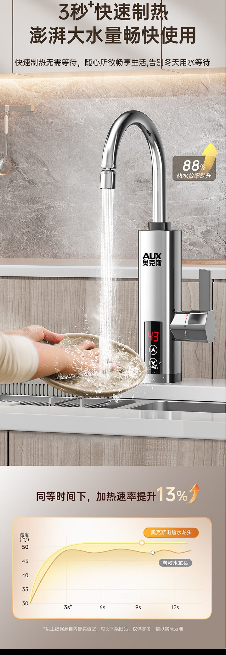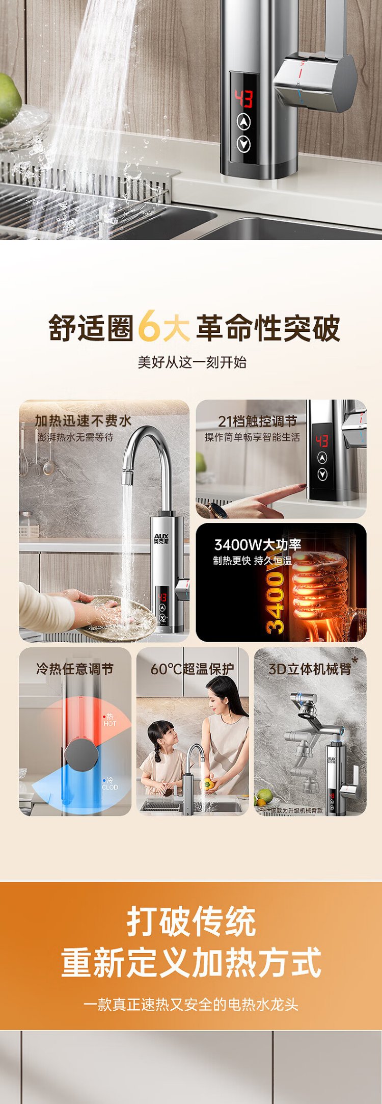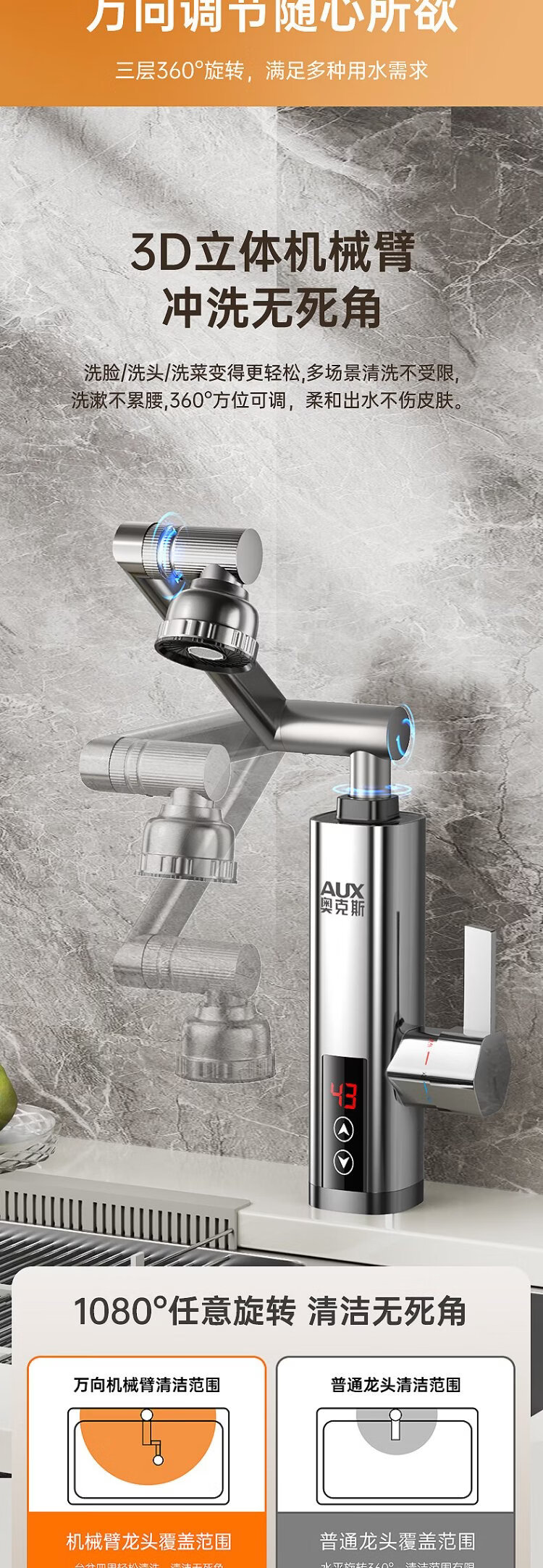 AUX electric faucet water heater heating faucet fast hot water frequency conversion constant temperature kitchen water inlet large screen digital display electroplated silver + upgraded mechanical arm + leakage protection plug