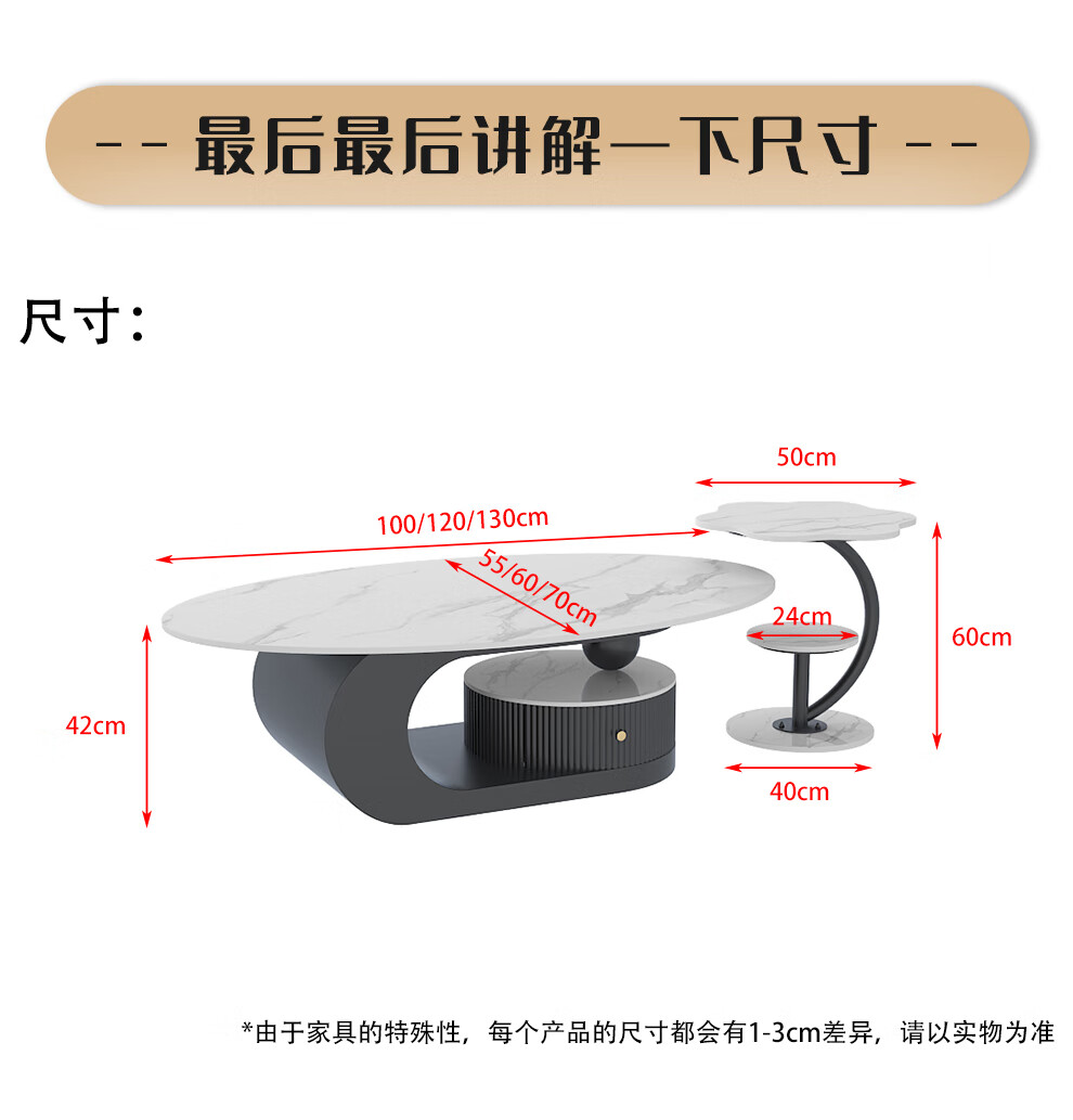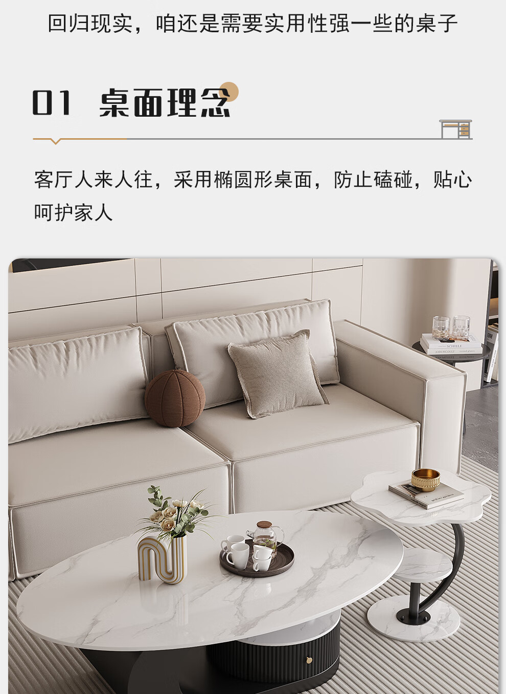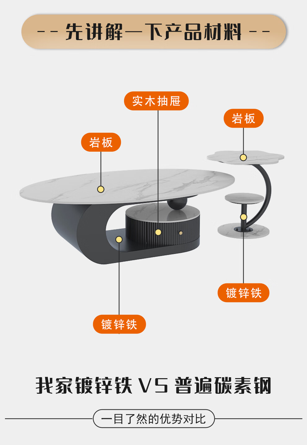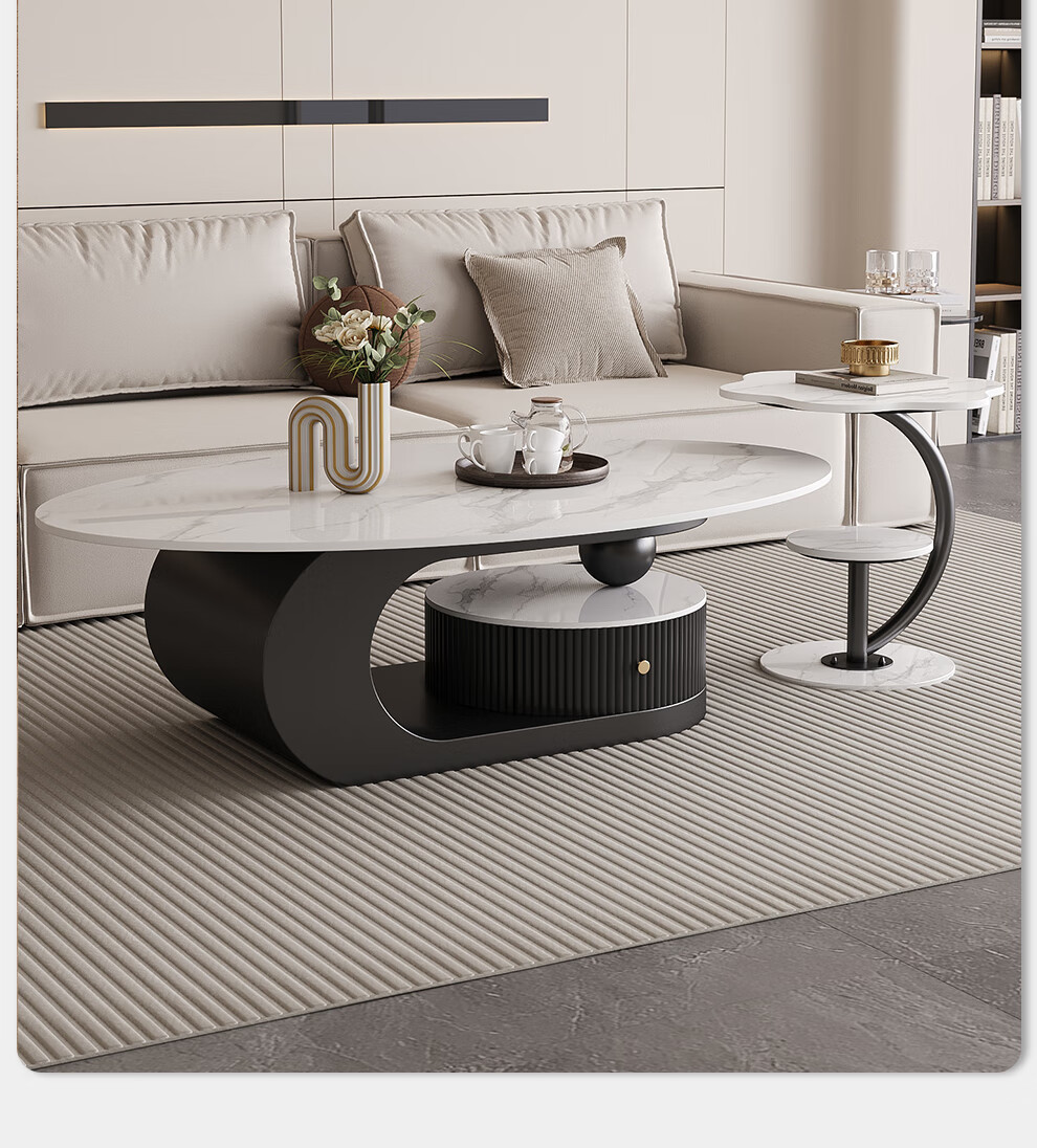 Verdanten light luxury style Italian slate coffee table for the living room oval coffee table table designer high-end small apartment tea table black frame + snow mountain white slate board 130*70*42 coffee table + side table