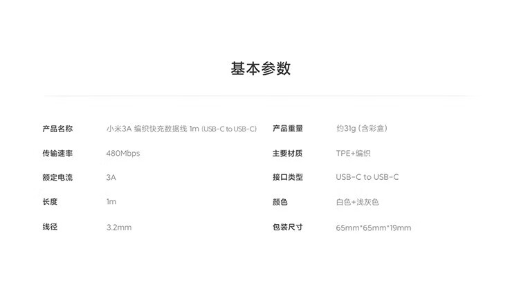 Xiaomi (MI) Xiaomi 3A Braided Fast Charging Data Cable 1m (USB-C to USB-C) White
