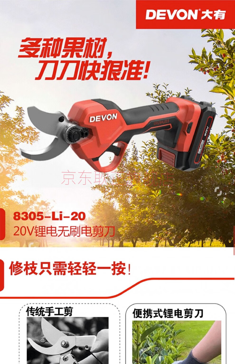 Devon 20V lithium battery brushless power tool pruning shears 8305 rechargeable powerful garden branch scissors pruning shears 8305 electric scissors bare metal without battery charger