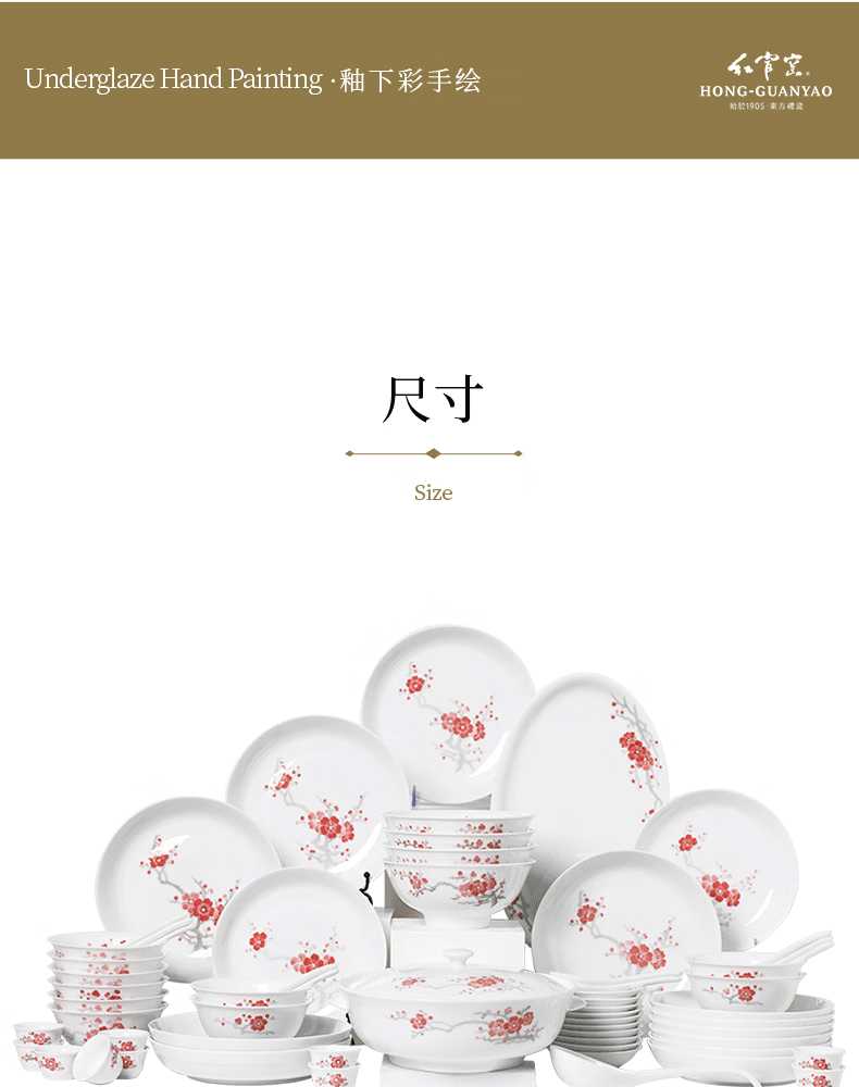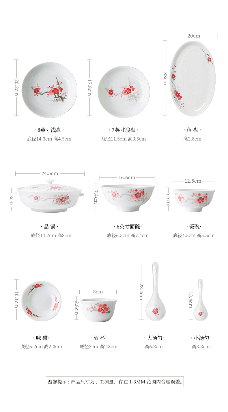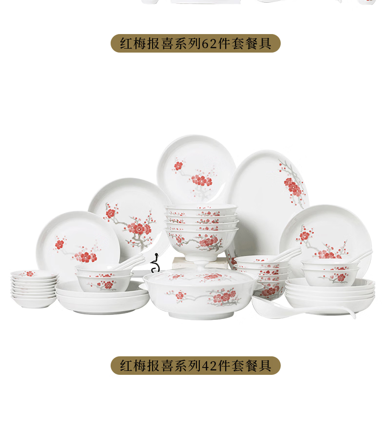 Hongguan kiln red plum annunciation tableware complete set of bowls and plates underglaze color high temperature resistant white porcelain for wedding and moving into a new house as an elder gift ceramics red plum annunciation 20 heads brocade box for 6 people