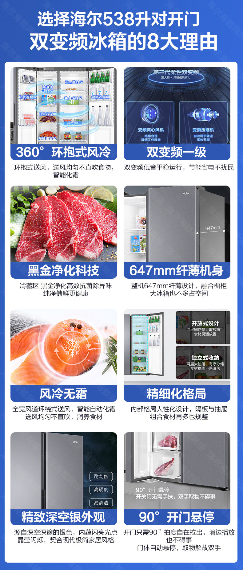 Haier refrigerator double door 538 liter side-by-side door air-cooled frost-free household large-capacity first-class energy efficiency dual-frequency ultra-thin refrigerator 538-liter large refrigerated space + air-cooled frost-free + odor and sterilization + first-class dual frequency conversion