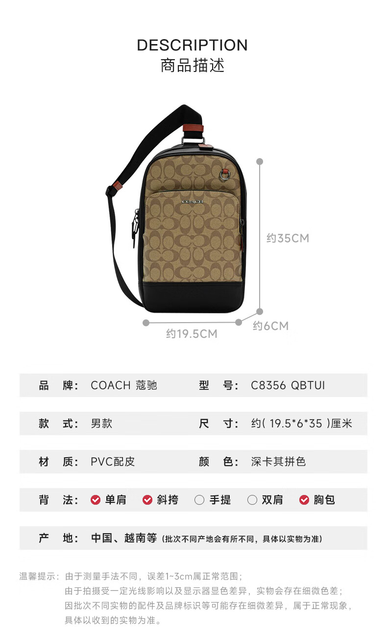 COACHCOACH/Coach men's chest bag travel bag stylish casual shoulder crossbody backpack mini black presbyopic CL412 QBMI5