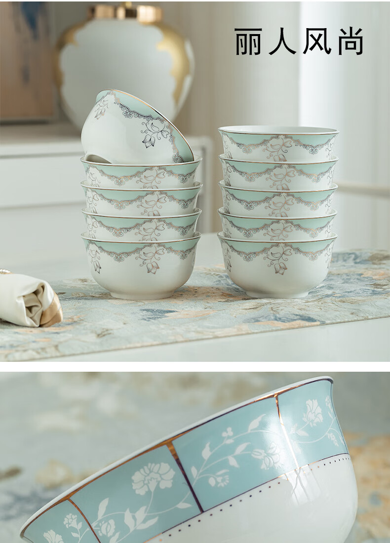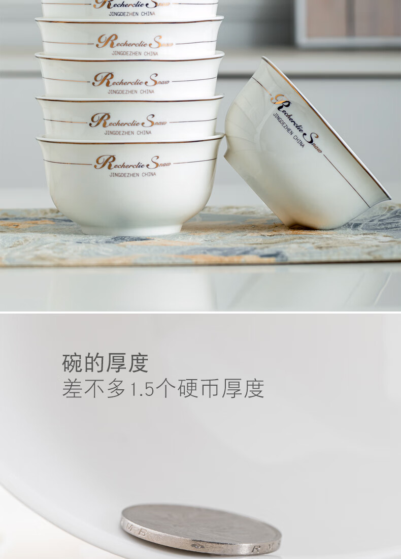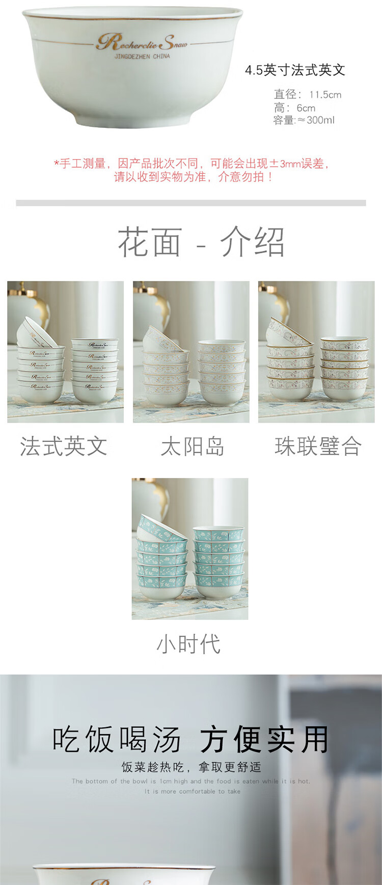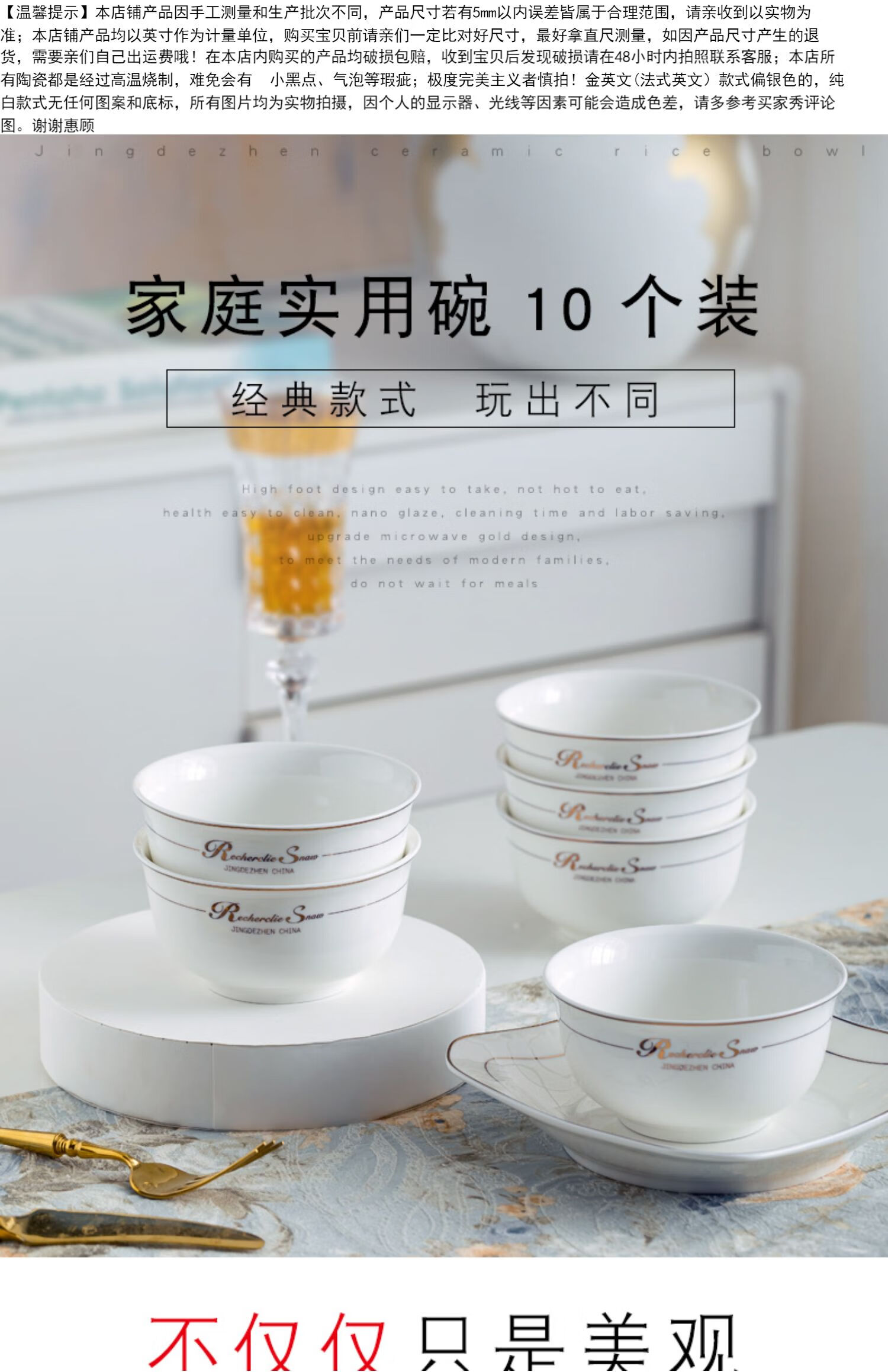 Suoyoute bowl household golden bell bowl rice bowl Jingdezhen tableware ceramic bowl Chinese creative home gift bowl microwave oven 4.5 inches French English 10 pieces