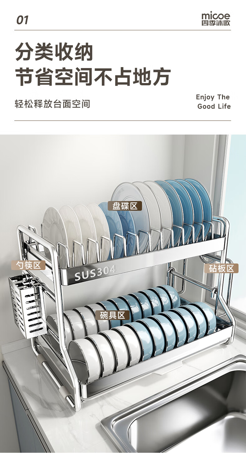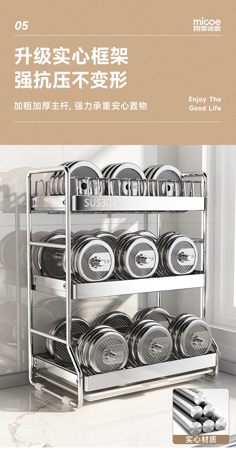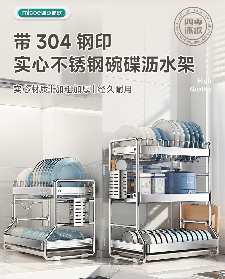 Four Seasons Muge 304 Stainless Steel Kitchen Storage Rack Drain Dish Rack Countertop Storage Cabinet Rack Knife Rack Bowl Dish Rack 304 Steel + Solid Thick Steel Pipe + 2-Layer Fully Equipped